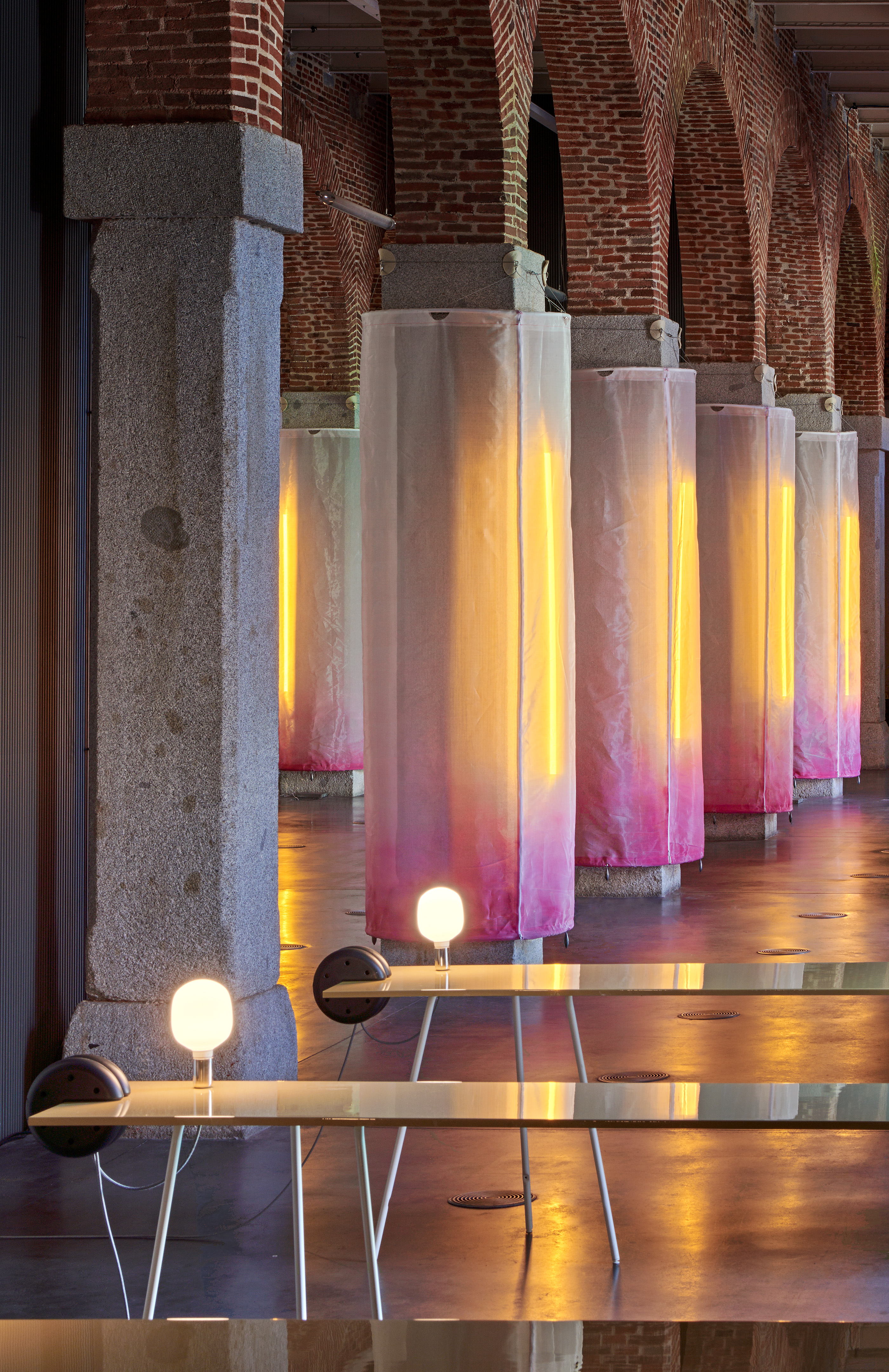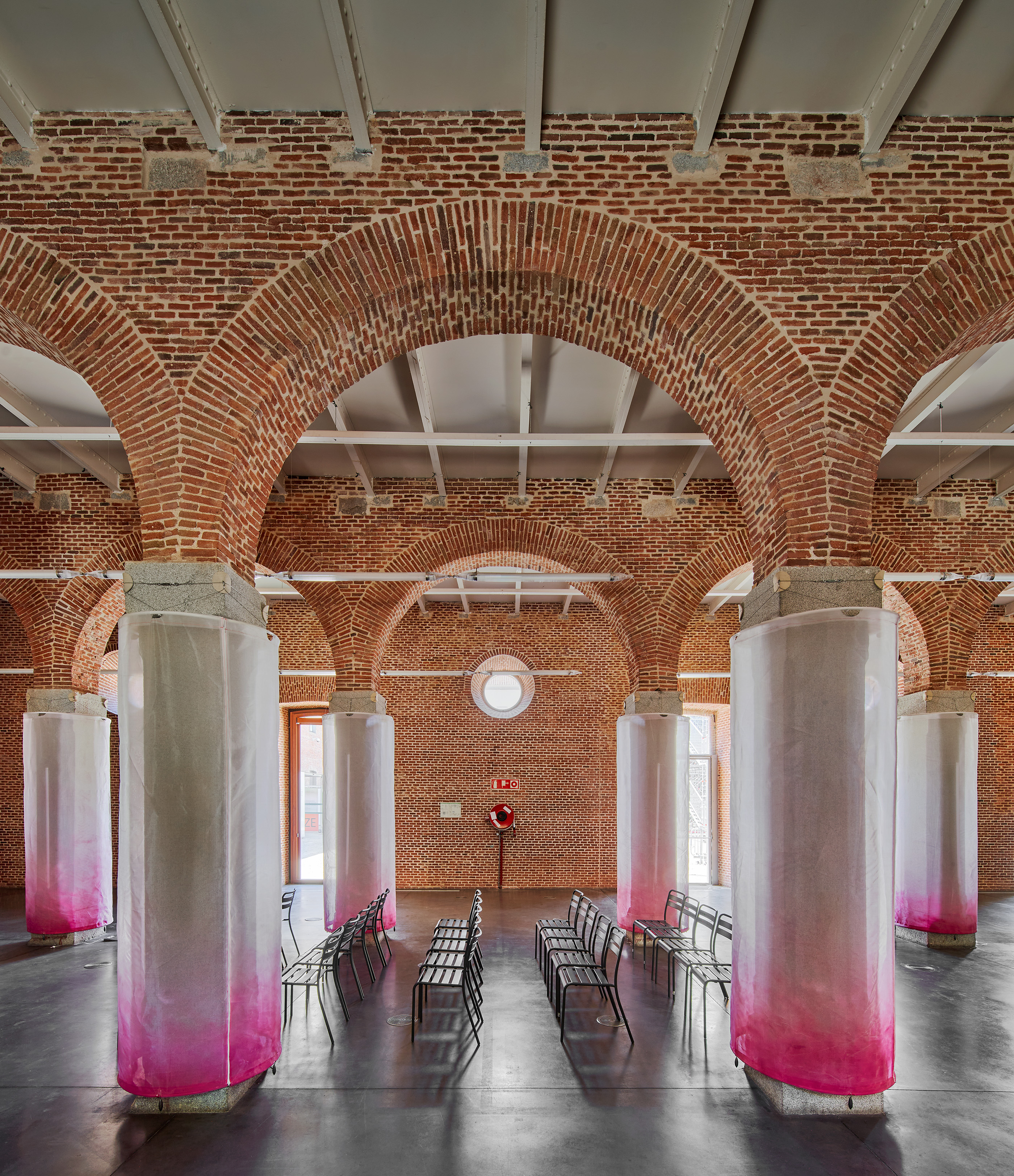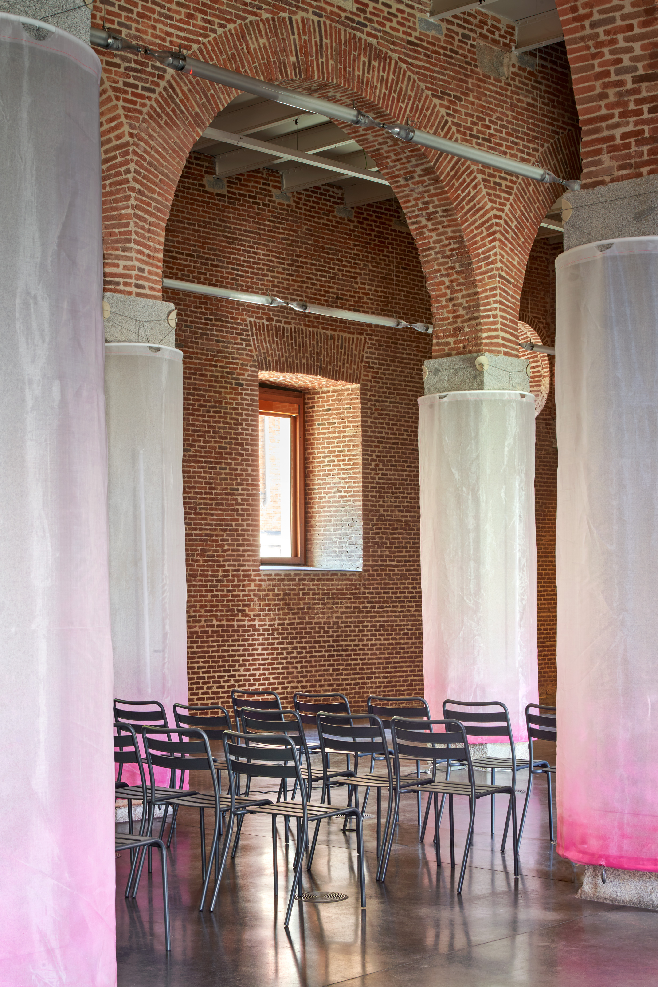 Un Cuarto en Llamas was developed at the Sala Polivalente (Multipurpose Room) of the Conde Duque military barracks. The Sala Polivalente at Conde Duque is an open space with a basilica-like floor plan defined by three bays of granite columns, delimited by brick walls. As it is a listed building, all interventions on the pre-existing architecture are limited, prohibiting any alteration of the original elements or the mounting of pieces employing holes or chemical adhesives.