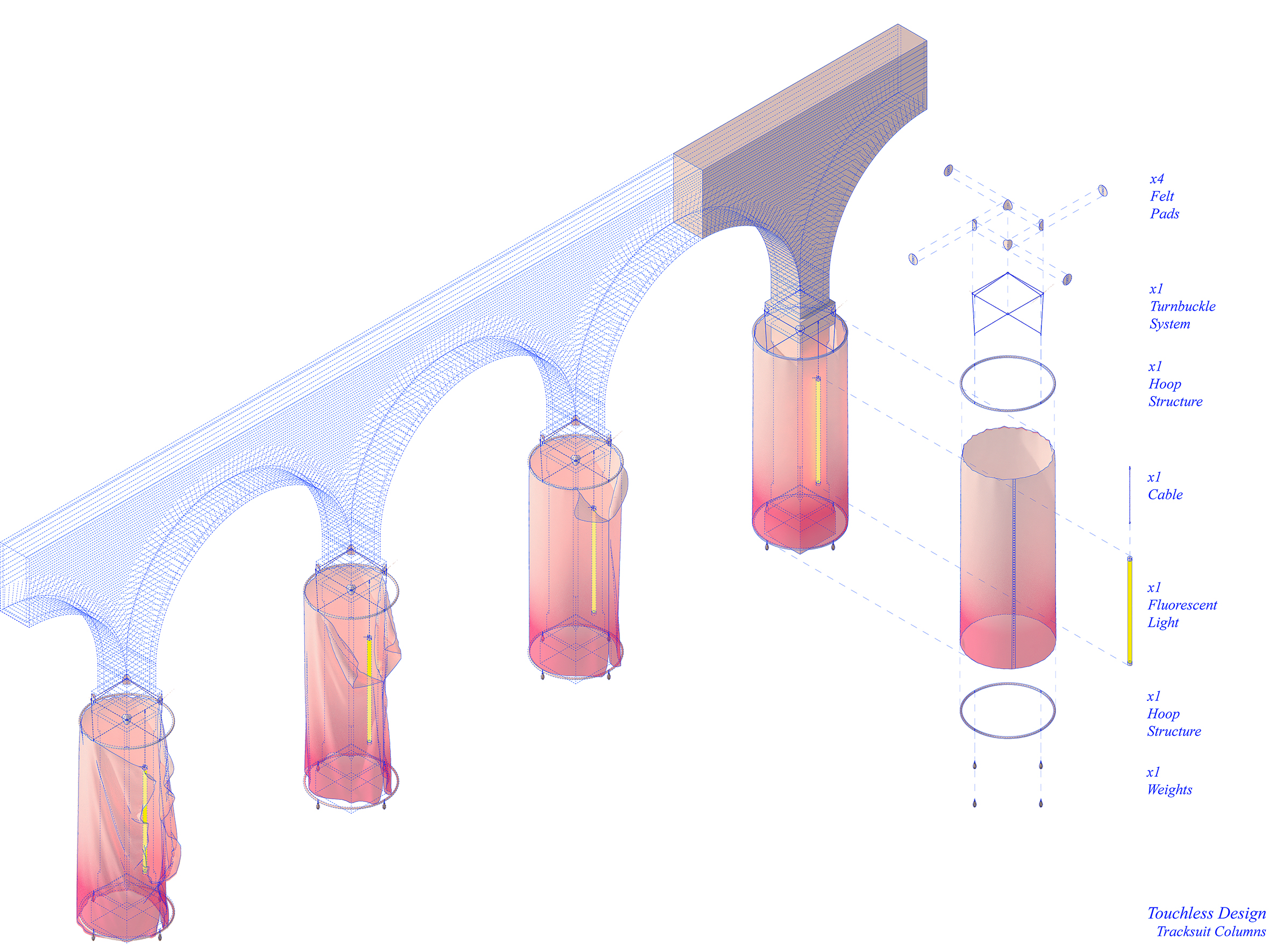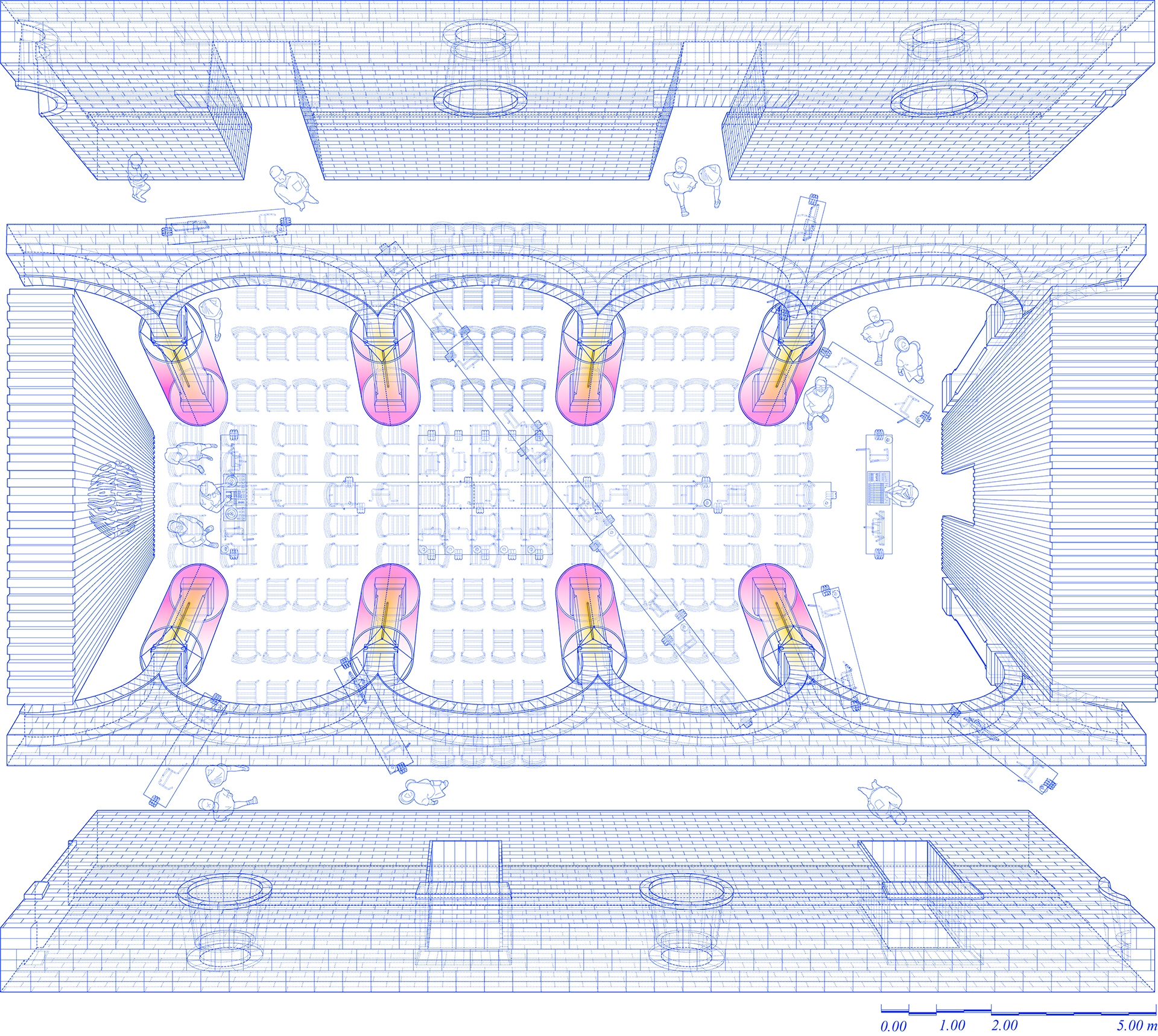How to convert the solemn materiality of this room into a space for poetic and artistic creation, how to transform its rigid configuration into a place under permanent construction that functions as a laboratory for experimentation and a community of communities, and how to do so without altering the building? To respond to these considerations, the project develops two complementary strategies: "Touchless design," and "Feat. Furniture.”