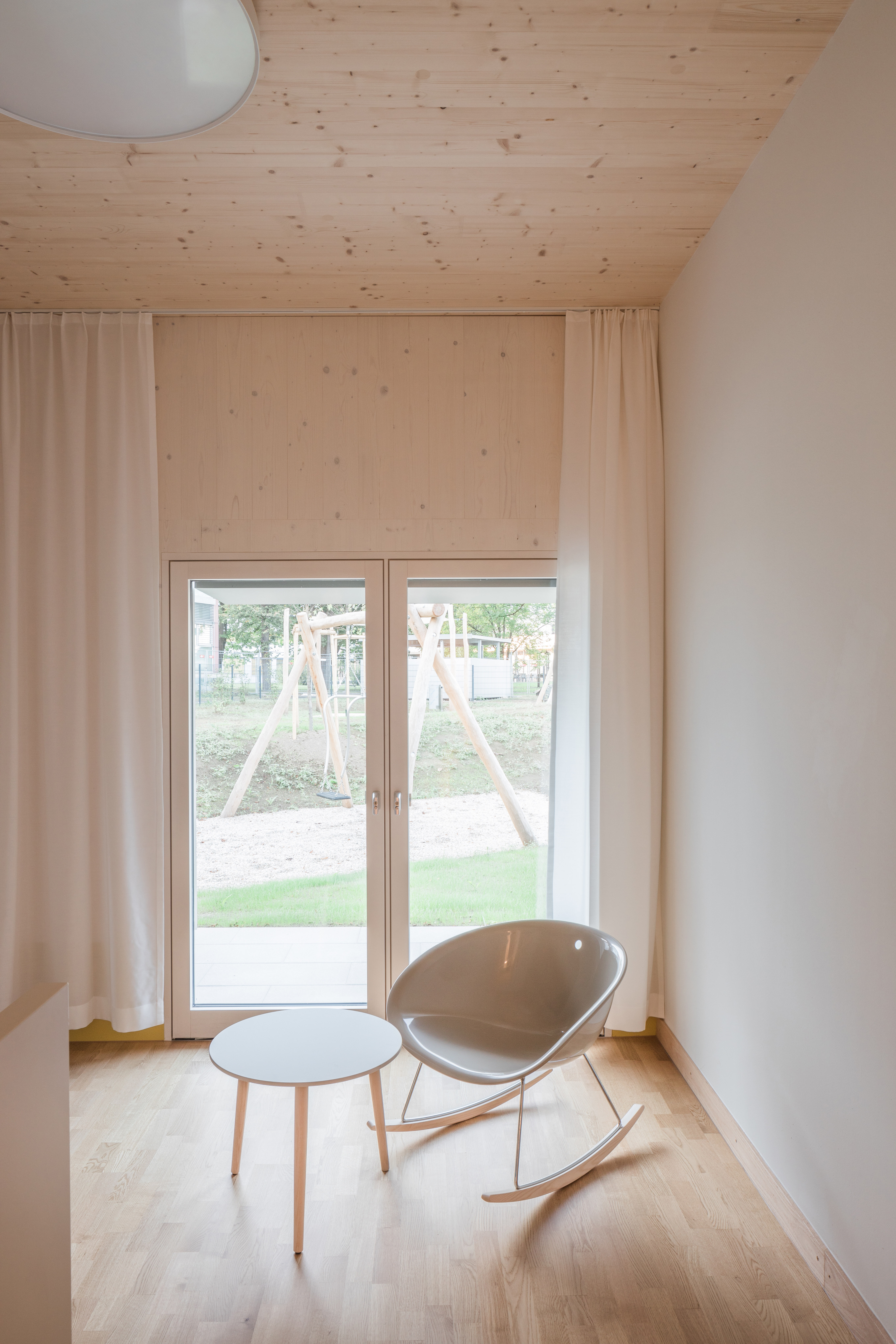 The solid timber construction of the extension suits psychiatry due to its short construction time, warm atmosphere from wooden surfaces and high precision detailing. This breaks the cold, sterile stereotype of hospitals.