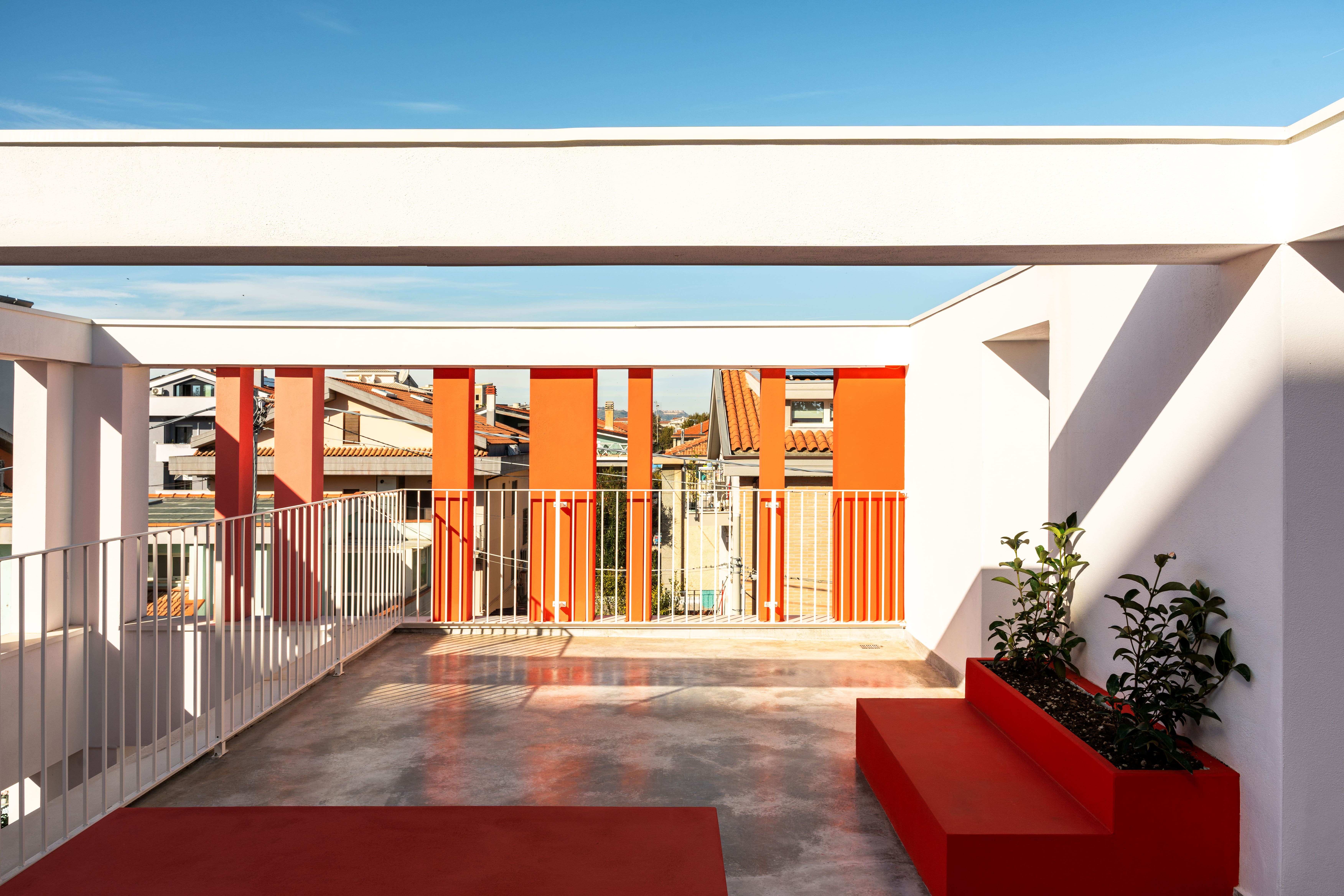 The morphology of the architecture aims to give an urban and social dimension to the living spaces. It is a neighborhood space that is permeated by the neighborhood dynamics. The main volume is compact and emptied at the roof to accommodate the suspended square. This urban and intimate space welcomes spontaneous uses and more structured moments of conviviality. The roof is equipped with elements for play and relaxation, for music and entertainment and it is a hybrid space for residents and for the neighborhood. The roof hosts various music, play and sports initiatives. It is a new centrality where relationships, meetings and conversations can be built. The layout is open and multifunctional. The space is changeable. The use of these common spaces shapes the architecture adapting it to the evolution of the community. With a bright shade that goes from yellow to red, the new volume reinterprets the theme of social housing and redefines the concept of living together. It is a hybrid and porous architecture that changes according to the community's requirements. The building generates a linear color code in continuity with the existing buildings. This color code adds a distinctive visual touch and also creates a play of light and shadow that animates and designs the external spaces, both on the facade and on the roof. The interaction between colors and architecture is designed to promote a welcoming and stimulating environment for the community, giving a new identity to the neighborhood and the urban landscape.