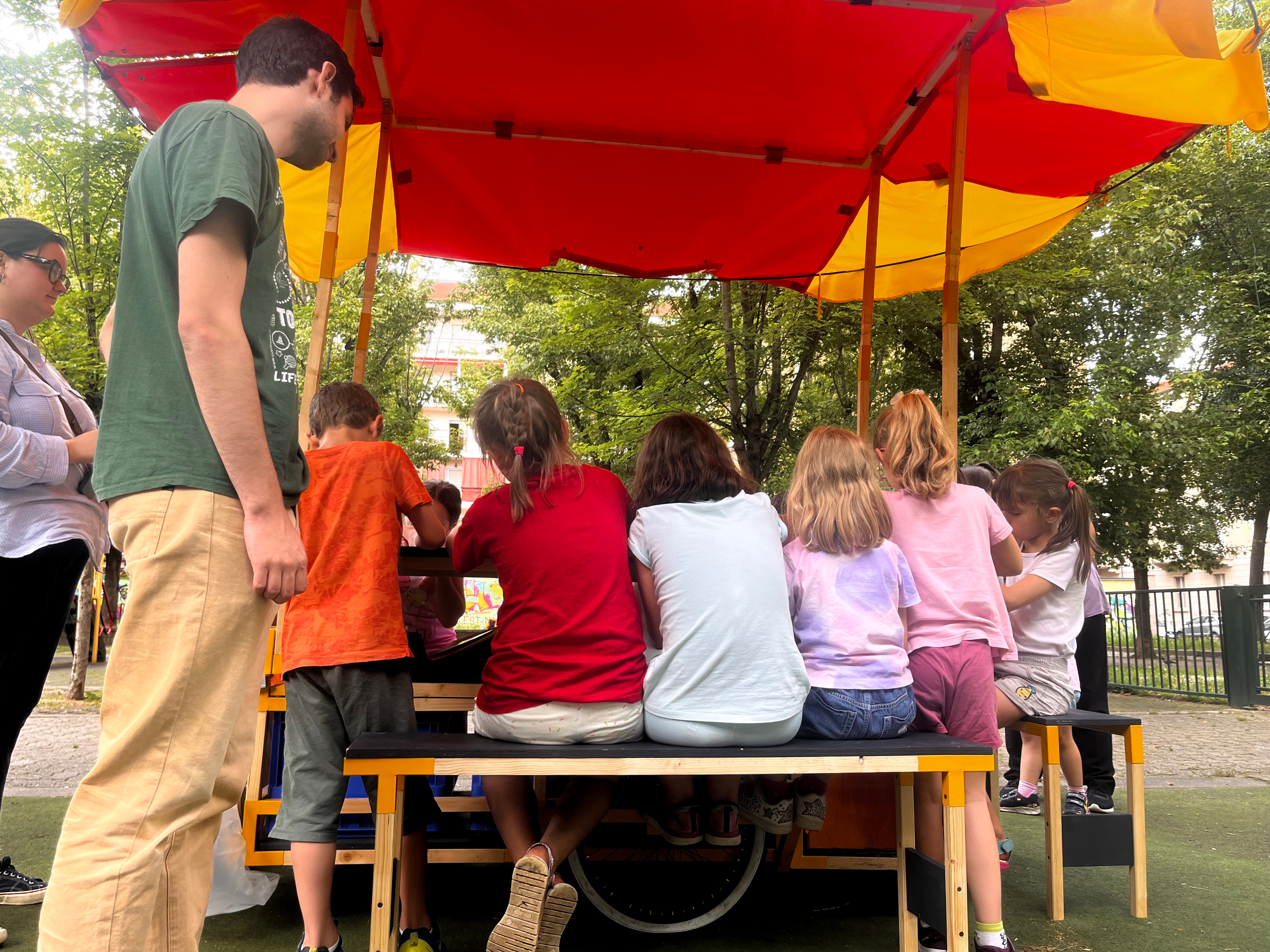 The bike trailer Bögia was shaped through co-design workshops involving diverse stakeholders and expressive languages, followed by a hands-on participatory construction phase. This ensured that the mobile station was not only functional but deeply rooted in community needs. Unlike conventional interventions that focus on predefined programming—where even iterative processes tend to have long cycles that struggle to respond with a rapid prototype-and-test logic—Bögia embraces improvisation as a core strength. Its flexible and modular design allows for real-time adaptation, enabling it to respond to unexpected situations and emerging needs in public spaces.