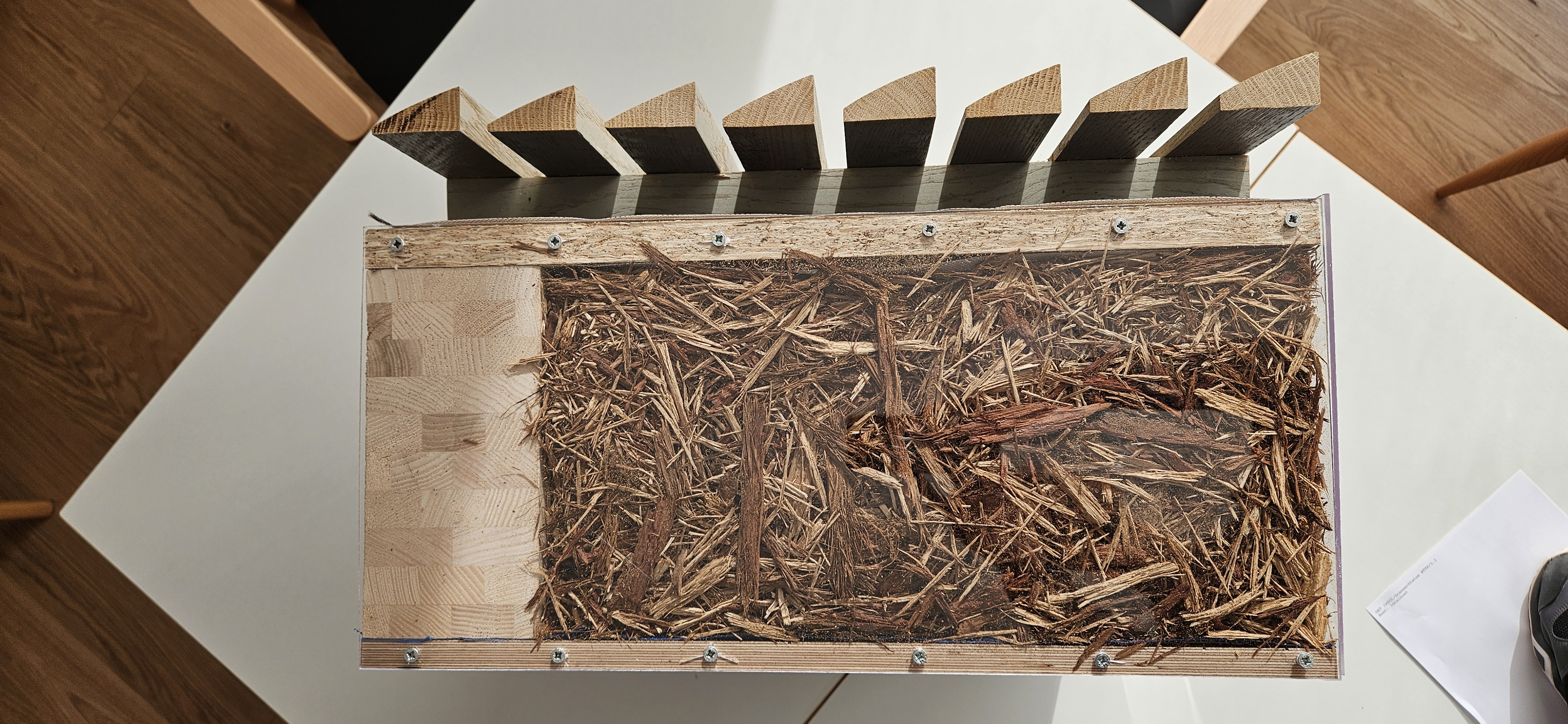 The project team was consisted of researchers with background in design, architecture, civil engineering, material science and wood technology. Representatives of the Faculty of Forestry and Wood Technology, University of Zagreb and the Faculty of Civil Engineering and Architecture, Osijek faculties formed essentially two working groups – one working mainly on the identification of residual materials and product design, and the other that focused on sample preparation, material testing, construction of experimental bungalow and in situ testing. Prior to in situ testing members of the project team dealt with optimization, development of wooden wall coverings and partition and load-bearing walls, LCA life cycle assesment, aesthetic design solutions, promotion and calculation of the load-bearing capacity of the structure. Team members from Spačva company took part in discussions on production optimization and assisted in preparation of samples.