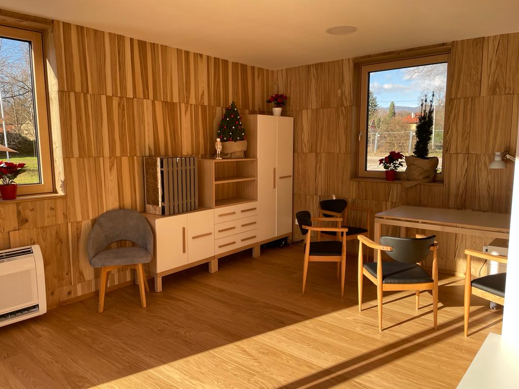 The growing impact of climate change and environmental issues indicates that the planet is approaching the limits of its sustainability. As a result of developing an innovative product from reused or recycled material, the emission of harmful greenhouse gases (GHG), which are the main cause of the greenhouse effect, will be reduced. On the other hand, wooden products offer a natural beauty that enhances the visual appeal of any space thanks to the unique grain patterns and texture which add character and warmth to interiors, allowing it to be used in both traditional and modern design styles. For the development and optimization of the wooden wall, we conducted industrial research in veneer production, tested the properties of wood materials and their impact on sandwich construction, investigated the thermal and acoustic properties of the developed sandwich panels, and the durability of the developed products in exterior and interior environments. The project resulted in the development of new practices that enable the production of innovative wood products, which is a prerequisite for the production of more complex products, currently unavailable in many wood industry factories. The project developed a modular wall cladding with a high content of waste oak veneer and modular partitions and load-bearing walls with a significantly higher content of wood residue, as this creates a better carbon footprint and greater well-being with natural beauty that enhances the visual appeal of any space. The final result of the project is a modular wooden wall cladding and sandwich construction, i.e. wall (partition and load-bearing), presented and integrated into the experimental bungalow, creating a design object that becomes attractive due to its elegant appearance. Finally, project results – the experimental bungalow has been already presented via open days, international conferences and media like TV.