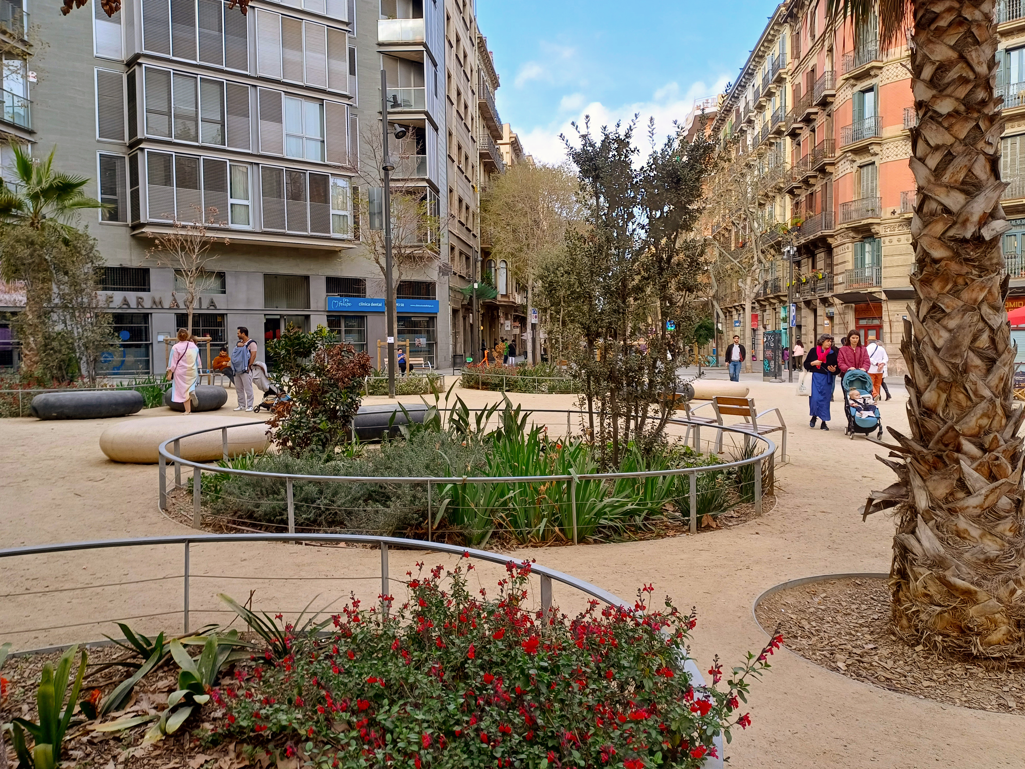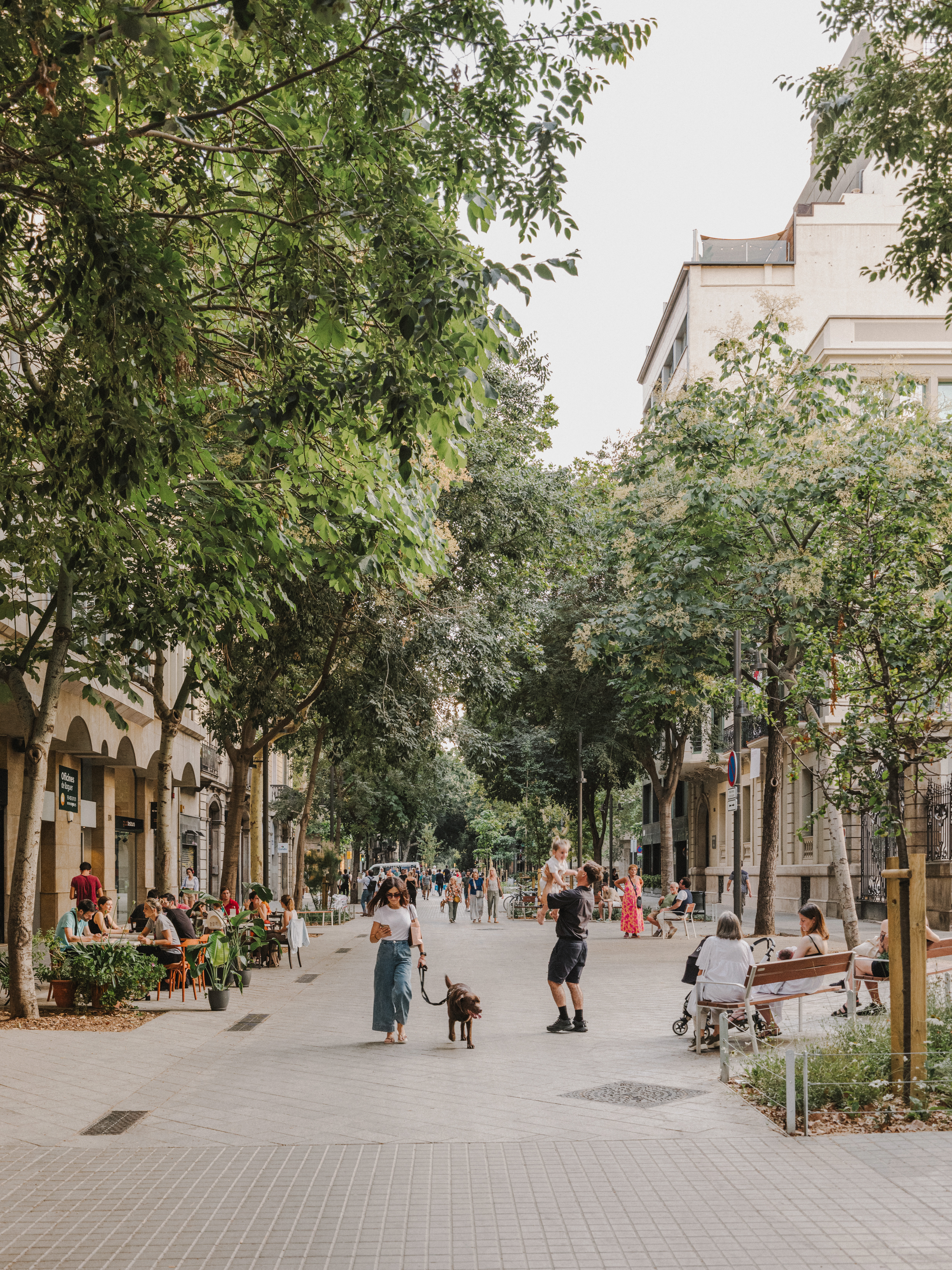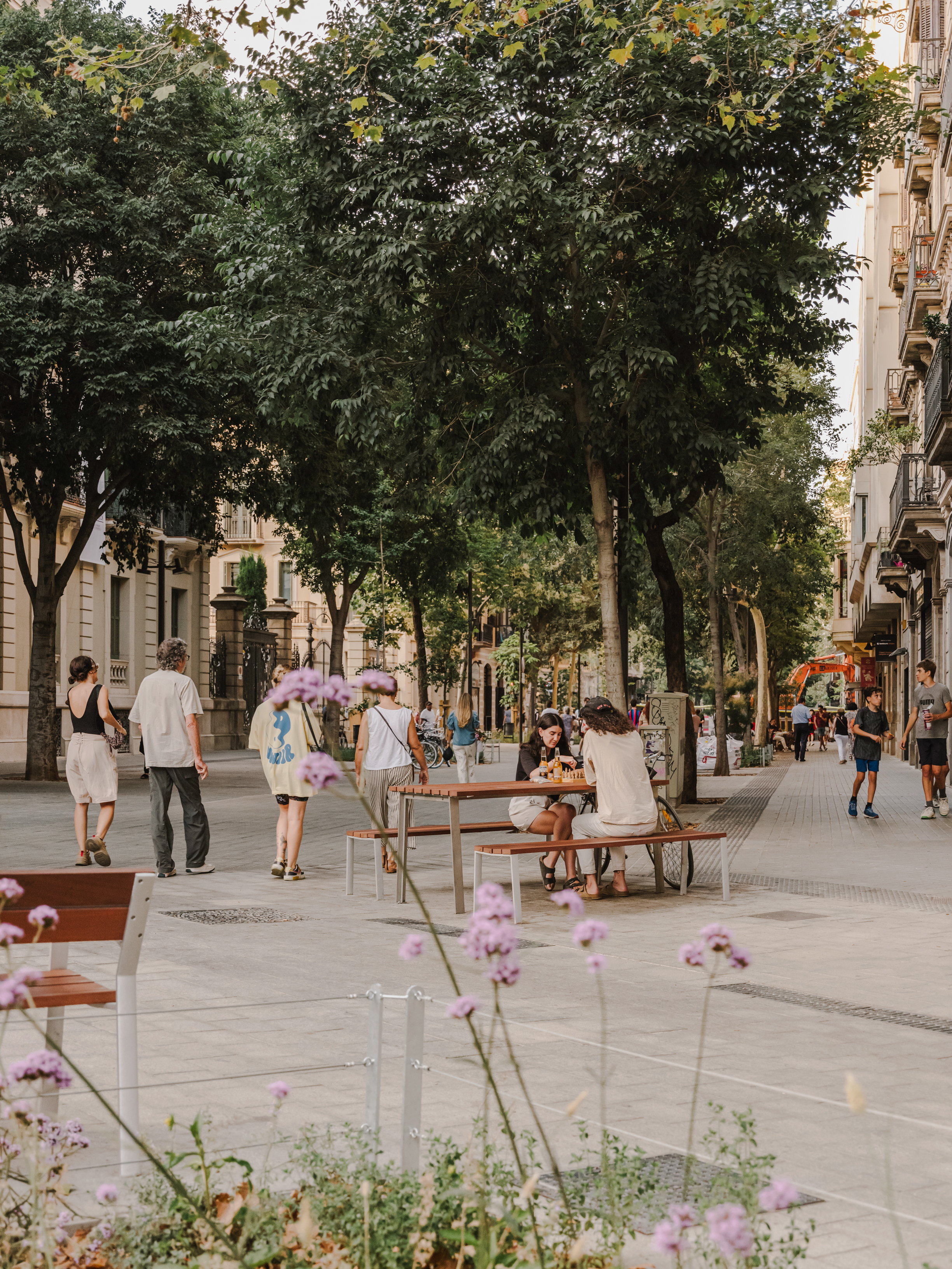 Today's streets need to be redefined as public spaces; as habitable places; as community spaces; as an extension of housing territory; as a space for games, greenery, history and local life of neighbourhoods. Streets have to go back to being guarantors of vitality throughout the entire urban fabric, to creating opportunities for the establishment of greenery and to promoting positive community life among local residents of all ages and origins. We need to fill the city's streets with life again. The Green Spaces and Squares project in Barcelona's Eixample is the strategy used to achieve this objective. This strategy, as well as the eight completed pilot projects, has been defined with a methodology that can be replicated in other cities. In this sense, not only the projects, but the whole process is exemplary and is aligned with the cultural, social and aesthetic values that the New European Bauhaus promotes.This experience has already become a new urban order, constituted by an integrated network of relationships that highlights neighborhoods, streets, buildings and current activities, promotes the recovery of public space and a sustainable mobility system. The lives of citizens are also changing, thanks to better access and the promotion of local social relations. The completed pilot projects have become very busy and highly valued spaces from day one. For many people, benches and tables are spaces for resting and meeting. The squares have brought an unprecedented and necessary public space to Eixample, and the green axes allow something which was unthinkable, such as walking in the middle of the street.The transformation has provided a new way of perceiving the urban landscape and experiencing the public space of Eixample, which has gone from being a space for mobility only to a space for living also. In addition, the renaturation of these eight new public spaces with vegetation and soft (permeable) surfaces has improved environmental quality and biophilia.