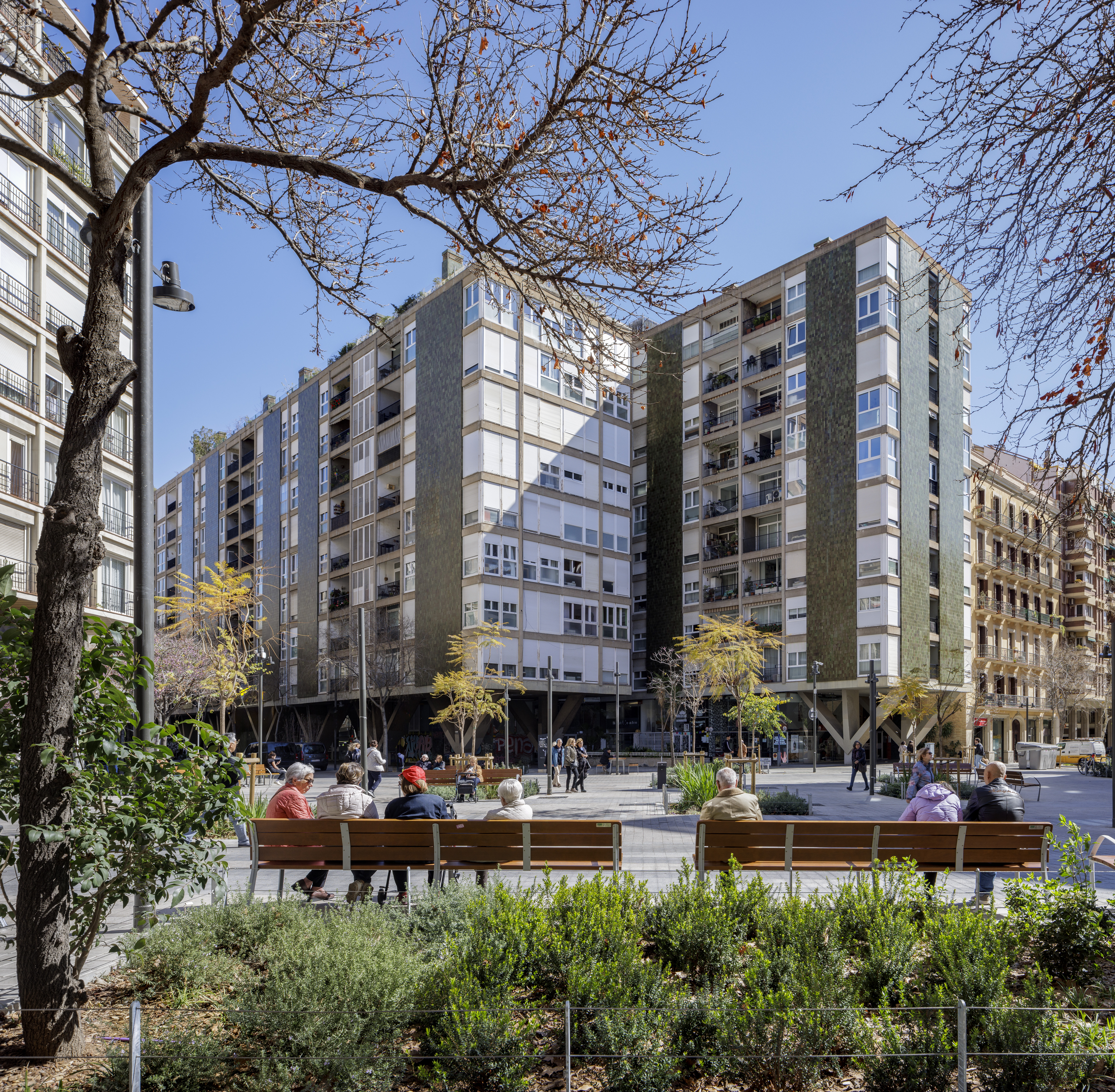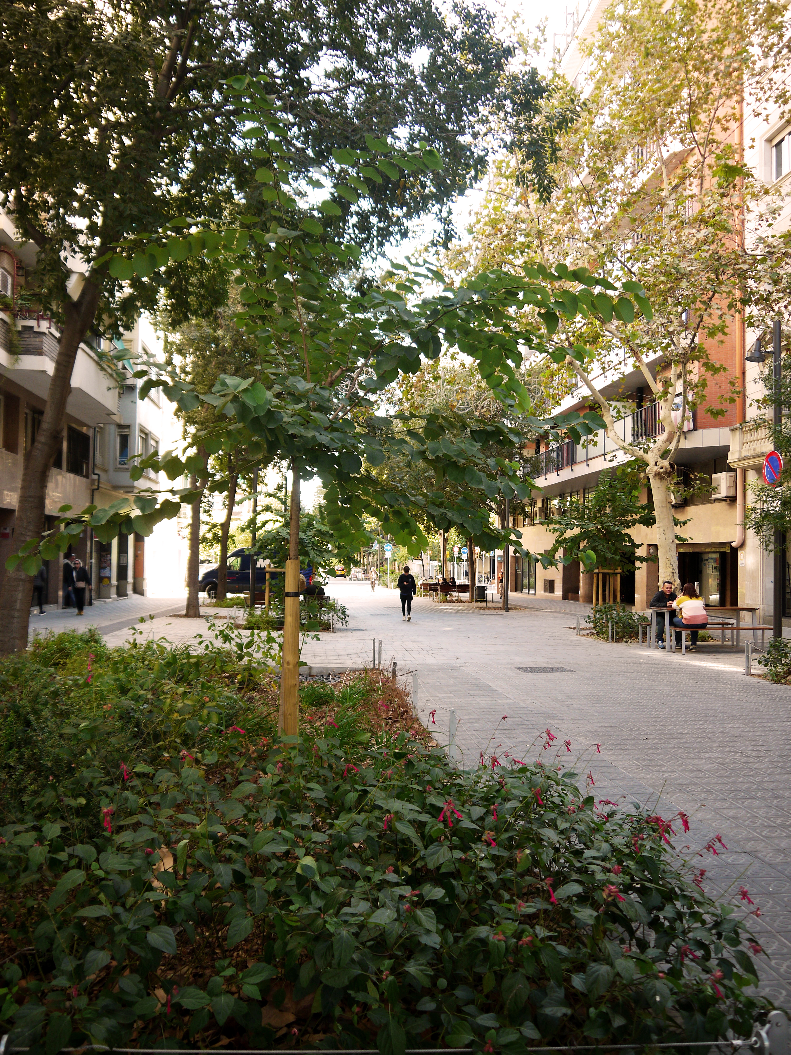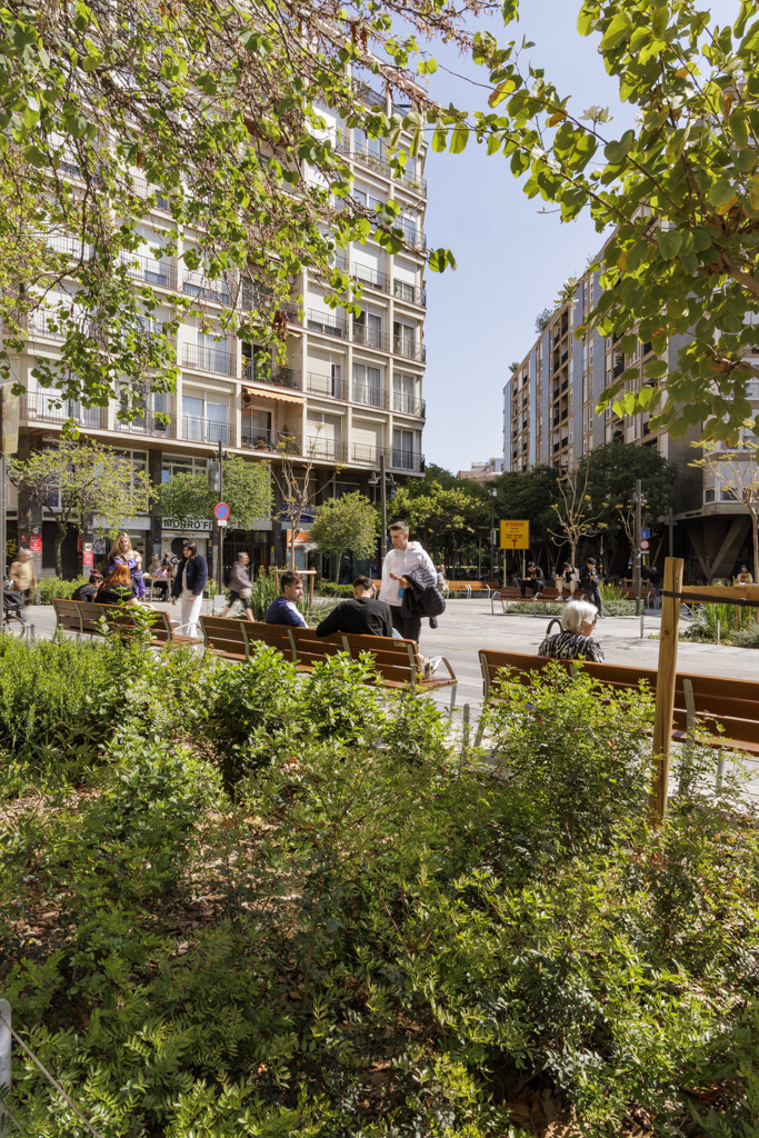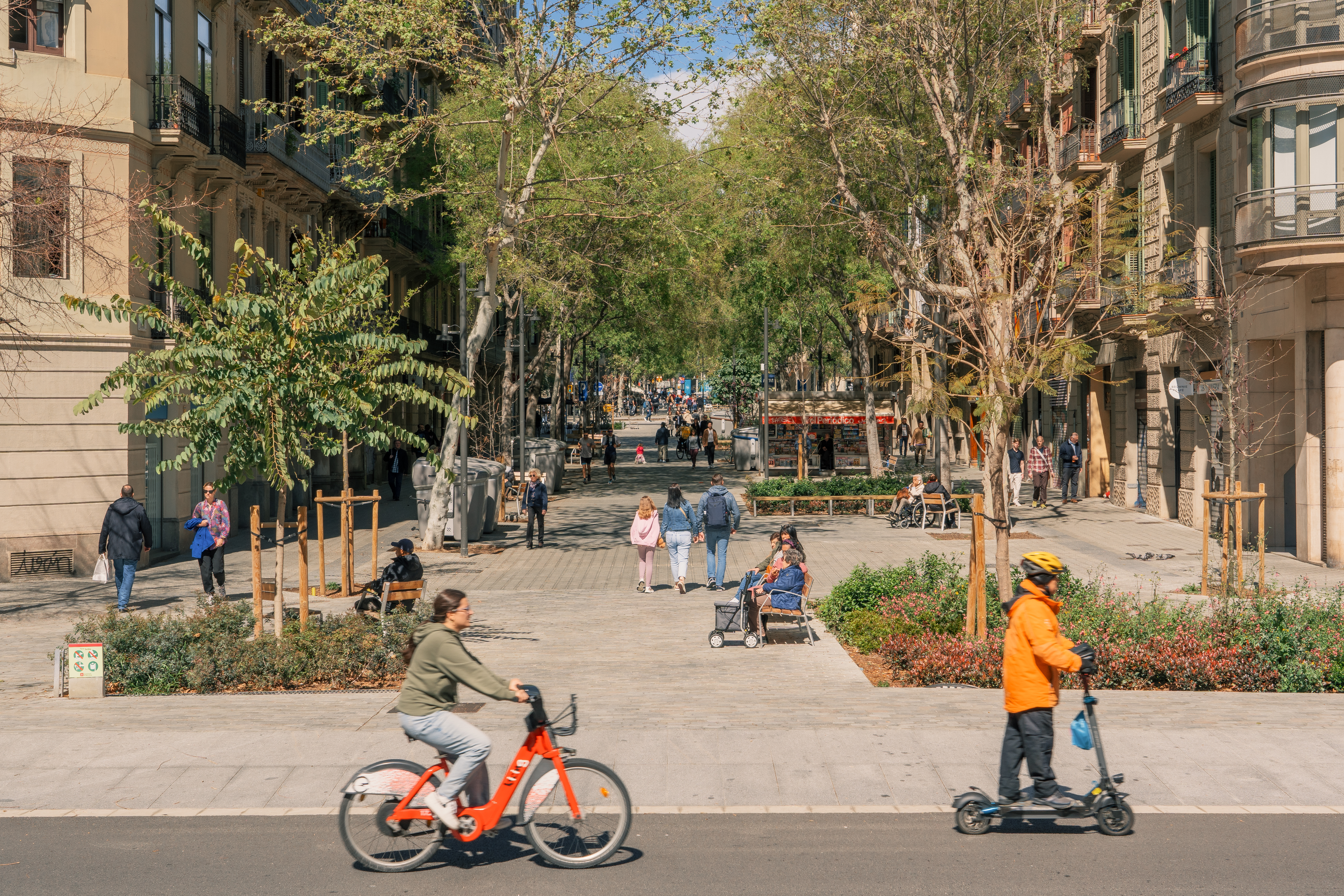 Today's streets need to be redefined as public spaces; as habitable places; as community spaces; as an extension of housing territory; as a space for games, greenery, history and local life of neighbourhoods. Streets have to go back to being guarantors of vitality throughout the entire urban fabric, to creating opportunities for the establishment of greenery and to promoting positive community life among local residents of all ages and origins. We need to fill the city's streets with life again. The Green Spaces and Squares project in Barcelona's Eixample is the strategy used to achieve this objective. This strategy, as well as the eight completed pilot projects, has been defined with a methodology that can be replicated in other cities. In this sense, not only the projects, but the whole process is exemplary and is aligned with the cultural, social and aesthetic values that the New European Bauhaus promotes.This experience has already become a new urban order, constituted by an integrated network of relationships that highlights neighborhoods, streets, buildings and current activities, promotes the recovery of public space and a sustainable mobility system. The lives of citizens are also changing, thanks to better access and the promotion of local social relations. The completed pilot projects have become very busy and highly valued spaces from day one. For many people, benches and tables are spaces for resting and meeting. The squares have brought an unprecedented and necessary public space to Eixample, and the green axes allow something which was unthinkable, such as walking in the middle of the street.The transformation has provided a new way of perceiving the urban landscape and experiencing the public space of Eixample, which has gone from being a space for mobility only to a space for living also. In addition, the renaturation of these eight new public spaces with vegetation and soft (permeable) surfaces has improved environmental quality and biophilia.