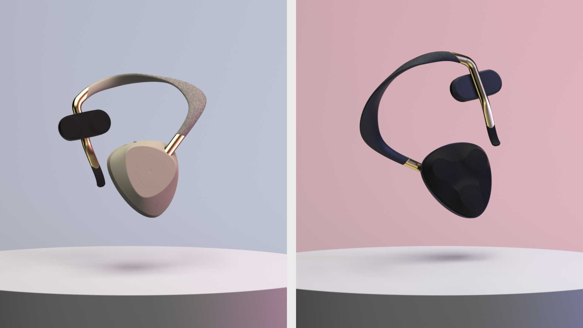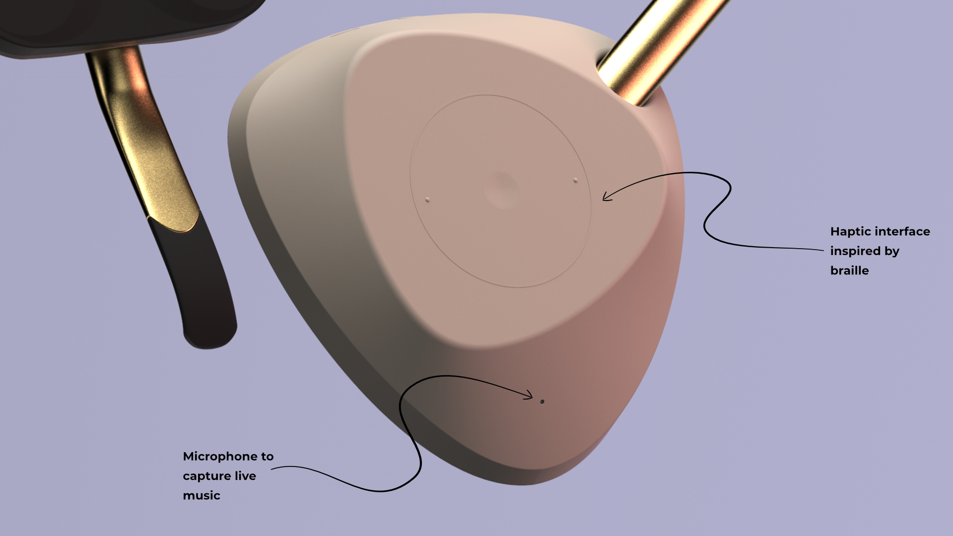The form of the product is inspired by vibrations and the human anatomy. The triangular shapes on the front are born from experimentation with Chladni plates and sand. Research shows that we feel vibrations the strongest in our bodies at 200-250 Hz, and when you let sand vibrate on a Chladni plate at these frequencies, this smooth triangular shape emerges. The opposite side of the design, the part which is in contact with the body, is inspired by the shape the chest bone and collarbones create together since this is where the vibrations resonate the strongest. Finally, the strap and neckpiece conclude the design with a dynamic shape that embraces the body - emotions that music evokes.