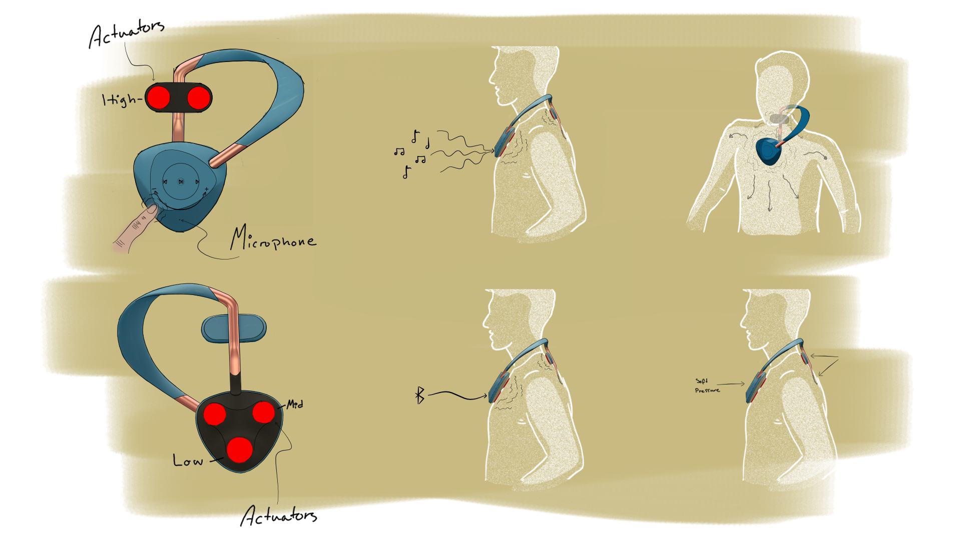 Aesthetics is more than simply the physical form of a product and, while we have explored this type of aesthetics, our main focus has been on the aesthetics of the experience, more specifically the aesthetic qualities of tactile vibrations. During the project, this came to be called Vibraesthetics, which we continued to explore in the field of music. The main goal of the project is to incorporate vibraesthetics into the design of an accessible and inclusive product for enjoying music. We have experimented with the placement of the actuators on the body to find that the chest, where the sternum meets the collarbones, is the optimal location where the music is perceived profoundly and pleasurably. The low and mid-tones are strong here and they resonate out far through the body. The chest location is accompanied by two actuators placed on the neck, where high frequencies are better perceived and which beautifully complements the chest to create a feeling that the music embraces you.