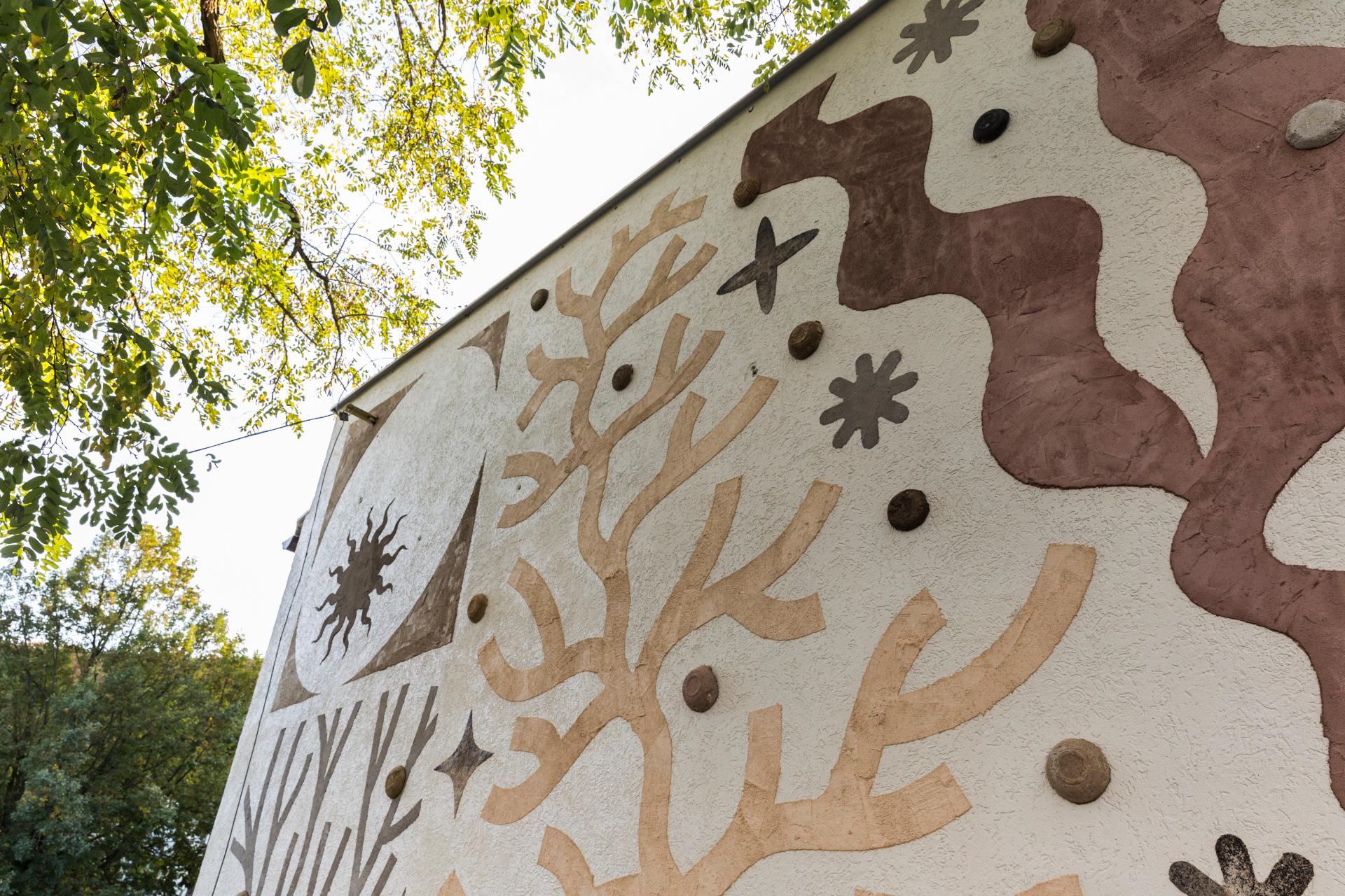 The plaster was made out of waste from the school canteen, local restaurants and construction waste collected from the immediate surroundings, as well as of chemical additives of natural origin. Three materials were used as a binder: lime from eggshells, sodium alginate from brown algae and pine resin. The mural consists of 4 colour blends, each with its own leading ingredient: turmeric, coffee dregs, carrot peels and ash. As such, the project explores the themes of what is considered waste and how we can repurpose these materials.