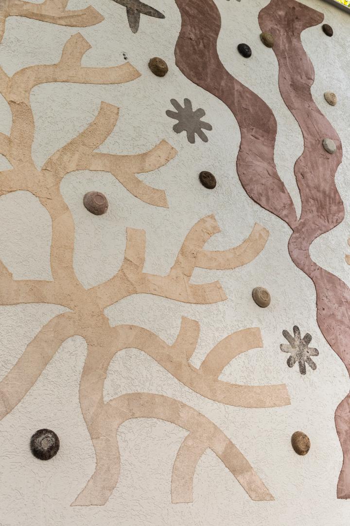 The artwork is located on a building near the entrance to the woods, depicting a variety of organic shapes. The style of the artwork is illustrative and playful, yet simple and in a natural colour palette. It was inspired by an aesthetic derived from old biology textbooks about algae. It is a piece of art that fits with the architectural context and the immediate surroundings of the piece in terms of colour palette, material, composition and themes.