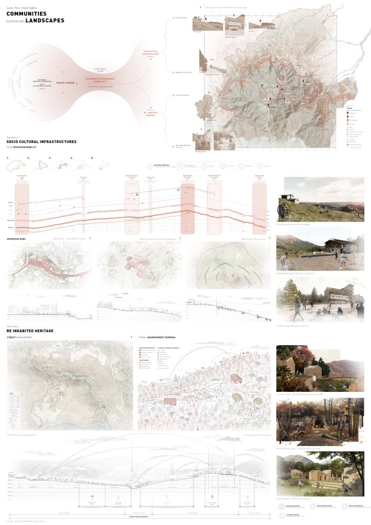 The inhabitants of the mountain communities are at the center of the entire project proposal. As expressed through the title "Communities supporting Landscapes, " the thesis aims to facilitate the configuration of a landscape specifically designed to increase the possibilities for the inhabitants of the Apennine Italian mountains. The project has as its objective the creation of community places in which to develop cooperation and sociability between those who live and those who visit these places. The strategy's definition focused on the area's traditional economies, partly abandoned today. In this sense, as the project is influenced by the community, so the community is influenced by the proposed landscape.