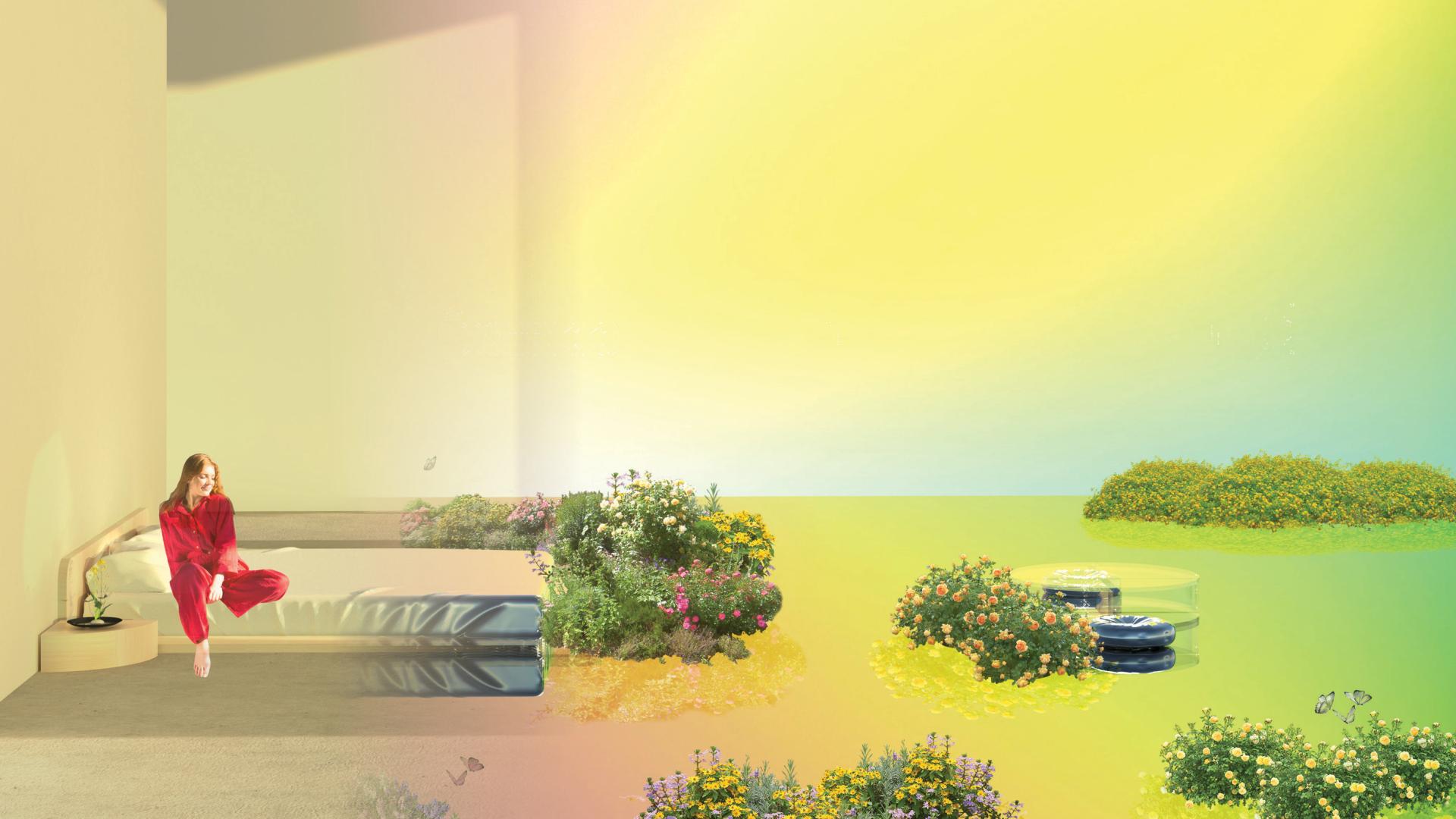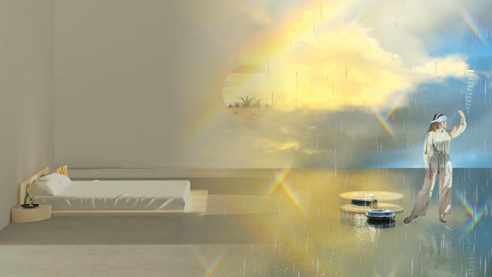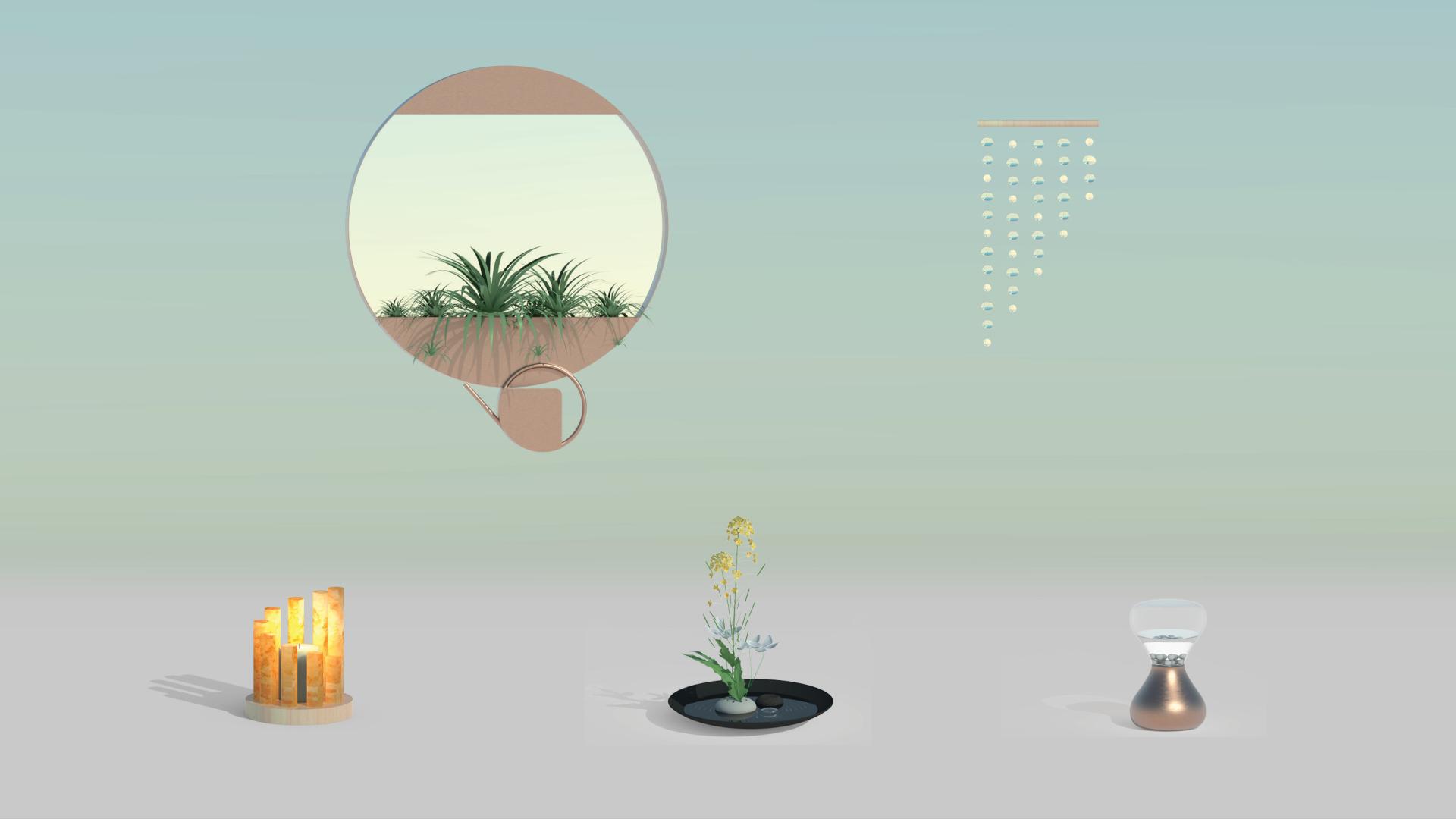 DoubleRoom is an inclusive, sustainable, and biophilic design solution that brings the outstanding healing effects of nature into our interior environment. By utilizing 5 physical objects inspired by ancient wellness rituals, we can stimulate the senses to improve our overall wellbeing. The interior space can take on a virtual transformation through these objects to insight a digital escape to nature in urban spaces, providing a bridge between our technological evolution and biophilic roots.