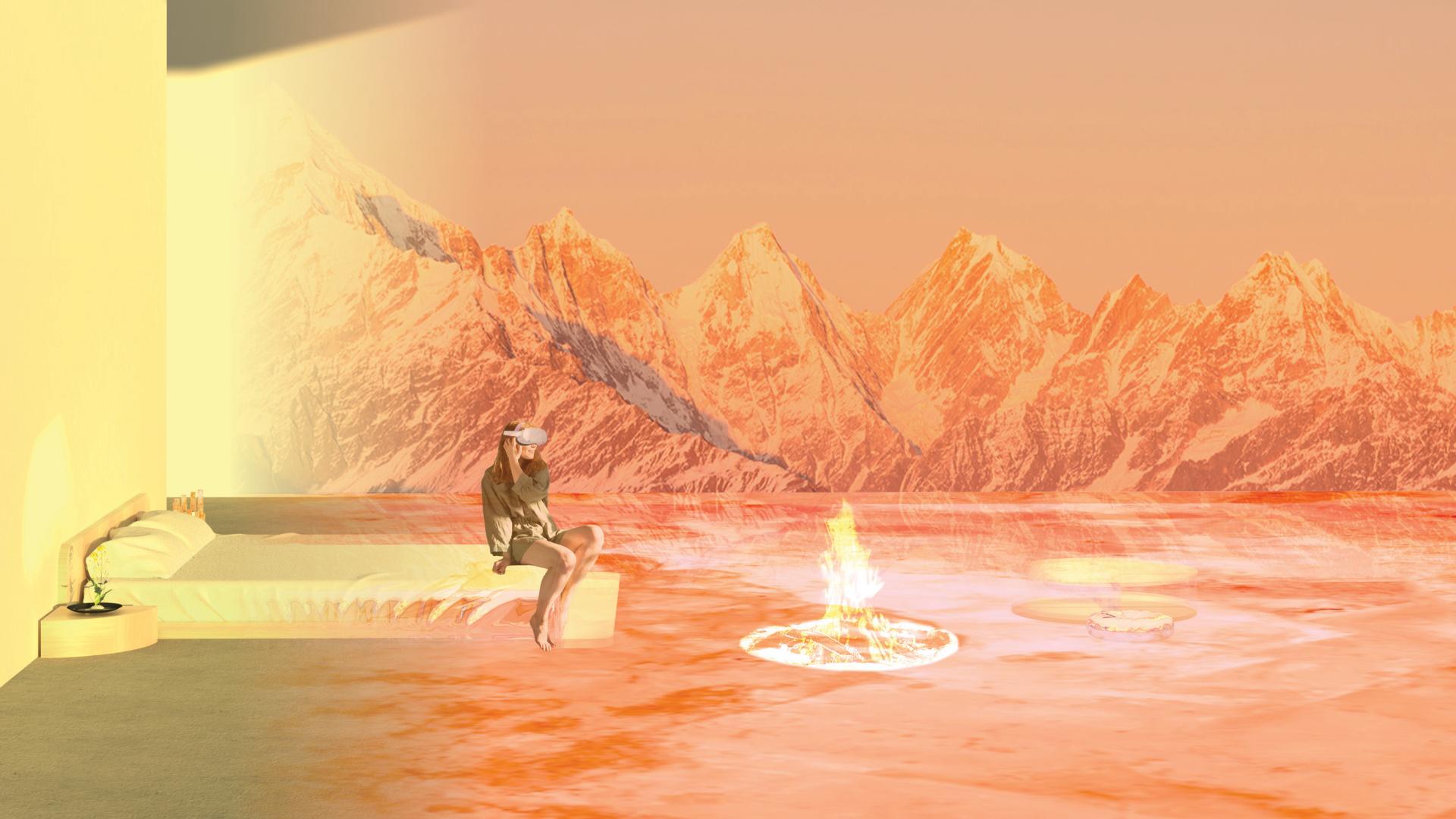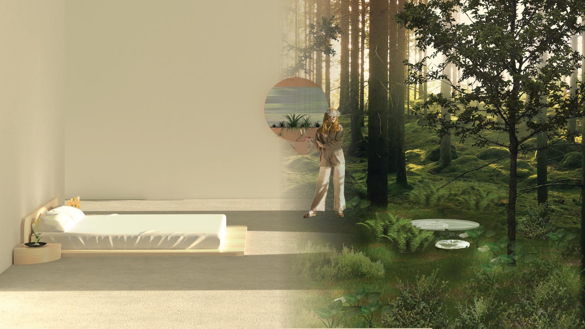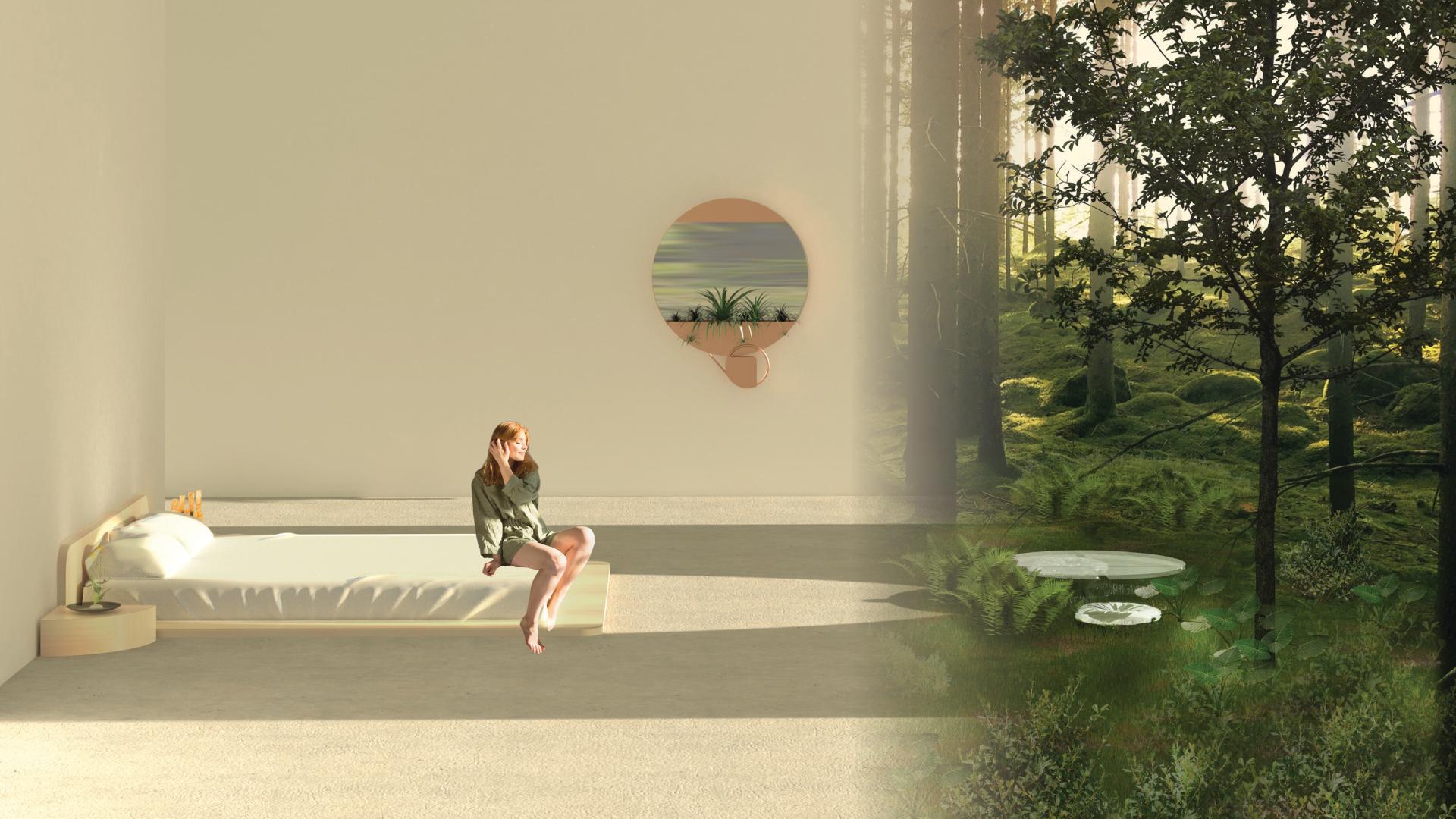 DoubleRoom is a thesis research and concept inspired by behavior change during the emergence of the pandemic in urban environments. The project aims to understand how our wellbeing is affected by self-isolating in our interior spaces and what is missing in our homes that being in nature provides. As urbanization continues to increase, how can we reconnect to nature without completely secluding ourselves? We can look to our ancestral roots to understand our genetic and primitive connection to nature and to science to understand what nature provides for our health and wellbeing. The pandemic also forced a surge of reliance on new technology for better or for worse, so as we design spaces for wellness, technology must be assessed with the same mindset- rooted in humans & nature, to benefit our wellbeing.