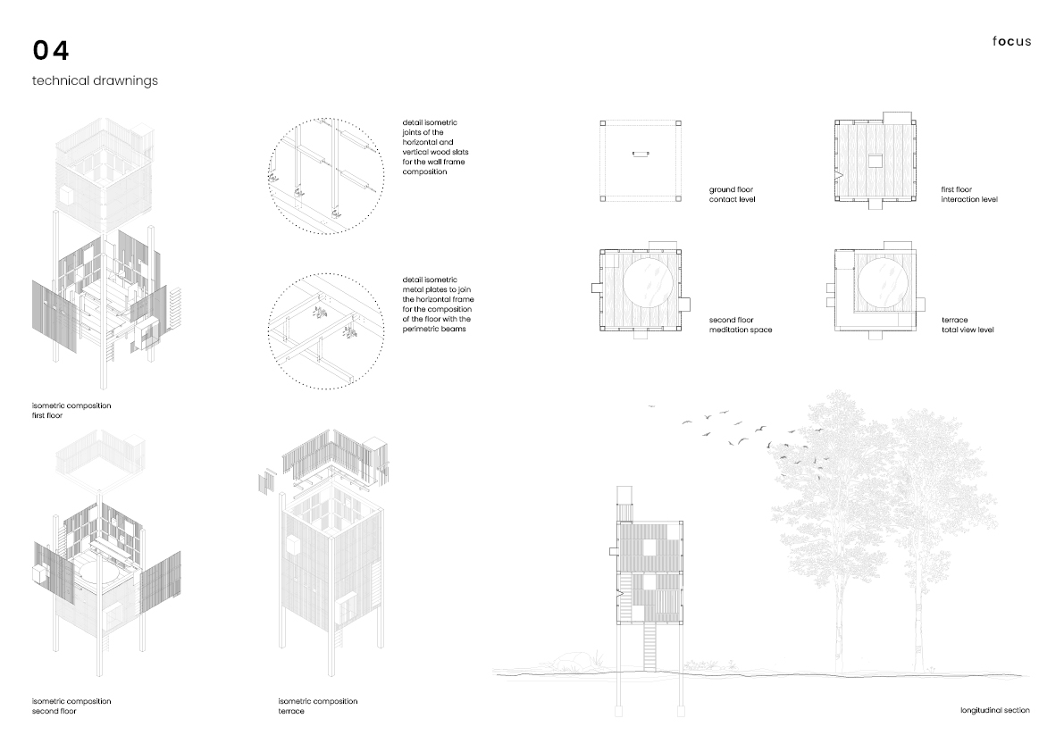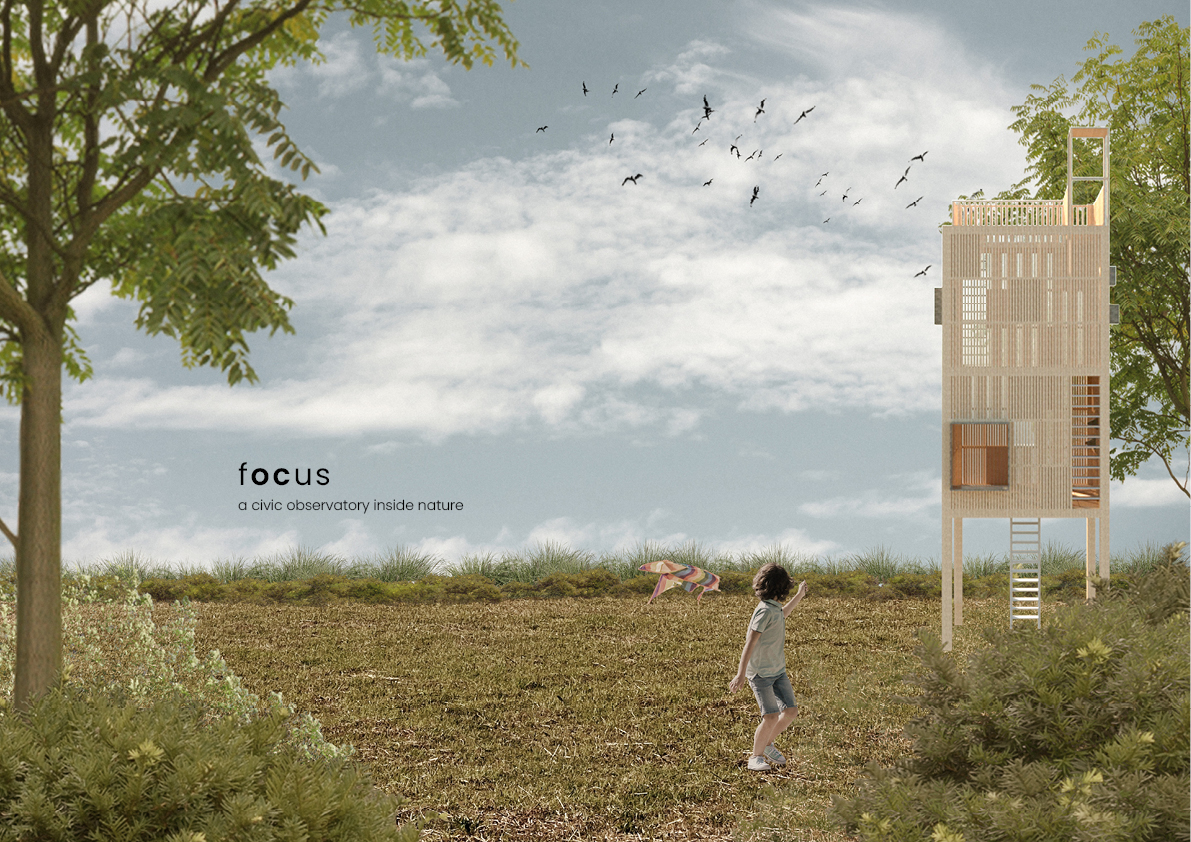 The civic observatory is an innovative project since it combines the act of observing with a physical and mental ascetic path. The observation of the surrounding nature is designed and guided by the space that allows the user to look only at specific selected glimpses that create a path, a visual experience that turns at the same time into a cathartic experience and escape from the chaotic reality of the city. Observation is filtered through the structure’s different floors which lead to different types of action, ranging from the public function of the ground floor that serves as a loggia to the private dimension of the terrace that allows the observation of the individual. Inside Focus the user is active, stimulated to interact with space and to climb towards the summit, the observation terrace, where the path to the direct relationship with the surrounding nature finds its end. The act of observing therefore blends with meditation and contemplation of the surrounding nature in a project that aims to emphasize the importance of finding one's own space and achieve a balance with the immediate environment, looking at it with new eyes.