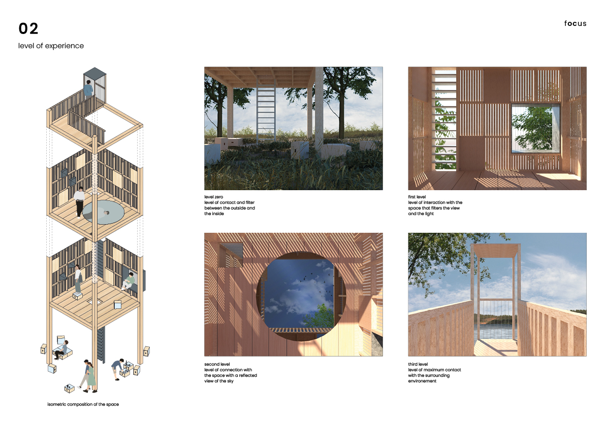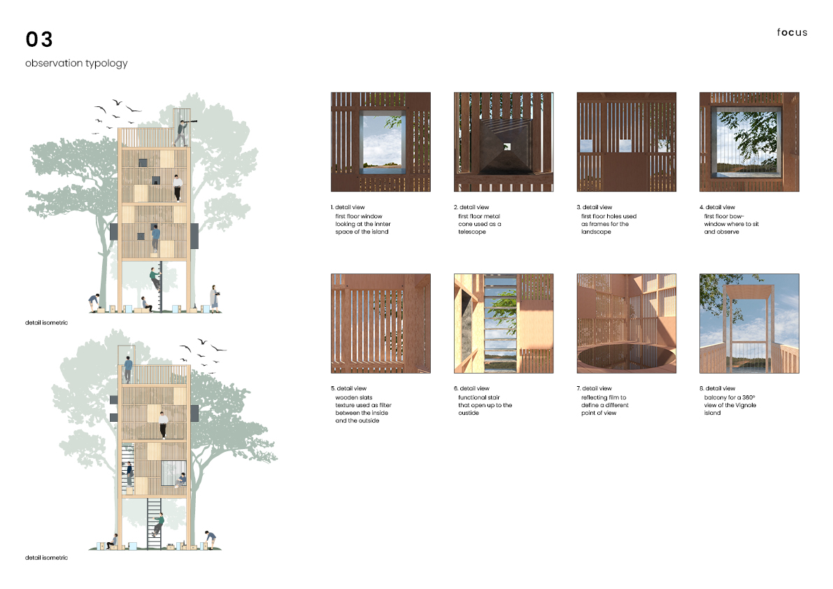 The chaotic reality of Venice allows people to find their refuge in a natural habitat, a source of regeneration, where they can become aware of their time, respect it, and identify new points of observation: visual glimpses. Focus defines a space for observation and recollection within Vignole Island creating a human-centered design solution and promoting sustainability, mindfulness and community engagement.. A cathartic path filtered through both physical and mental ascent within the space.