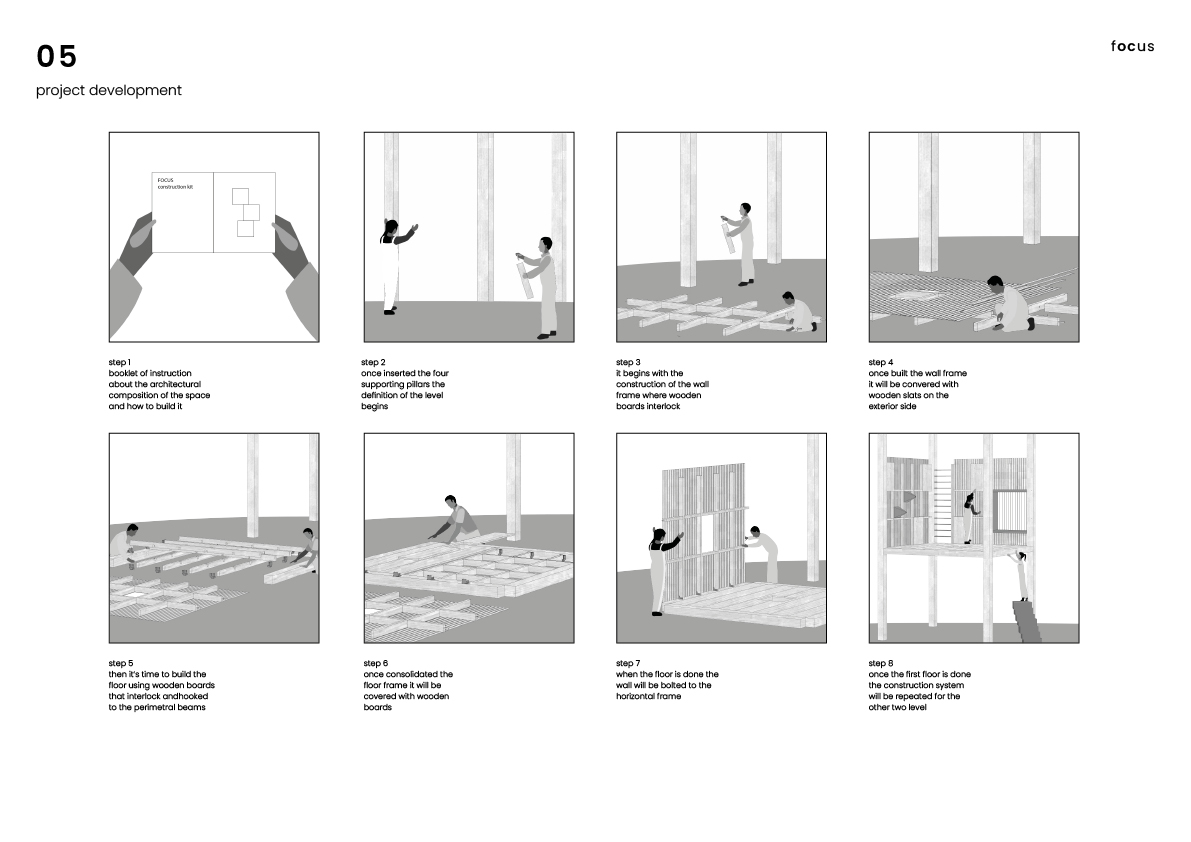 This allows you not to intervene invasively on the natural surface but to project upwards, always keeping a strong contact with the surrounding environment. The use of materials of natural origin allows the structure to fit evenly within the territory and establishes a long-term durability of the structure itself. As for social sustainability, the project promotes an active citizenship that takes care of the natural environment in which it lives, preserving its beauty and enhancing its qualities. Focus becomes a tool to strengthen collaboration inside the community; this begins at the moment of the observatory construction following the project instruction manual that is entrusted to the inhabitants of Vignole in order to make the construction work independent. Finally, economic sustainability is based on the choice of materials and the number of elements used in the realization. On each level of the observatory the same system of realization is defined, trying to control the definition elements of the spaces and structural components. In addition, the project has an indefinite duration that allows a long-term vision and maintenance work by citizens.
