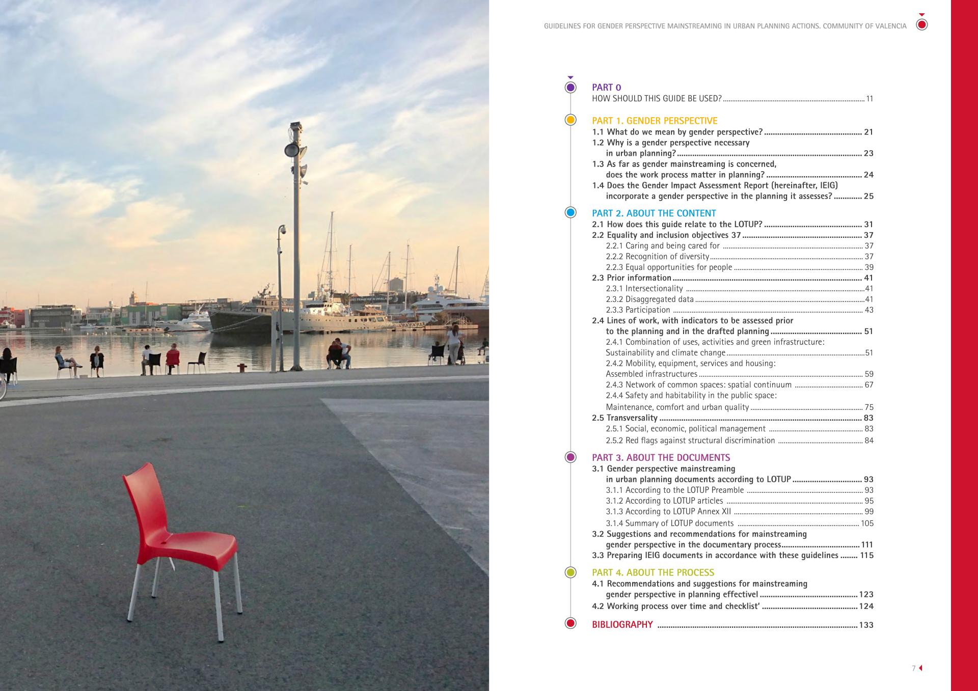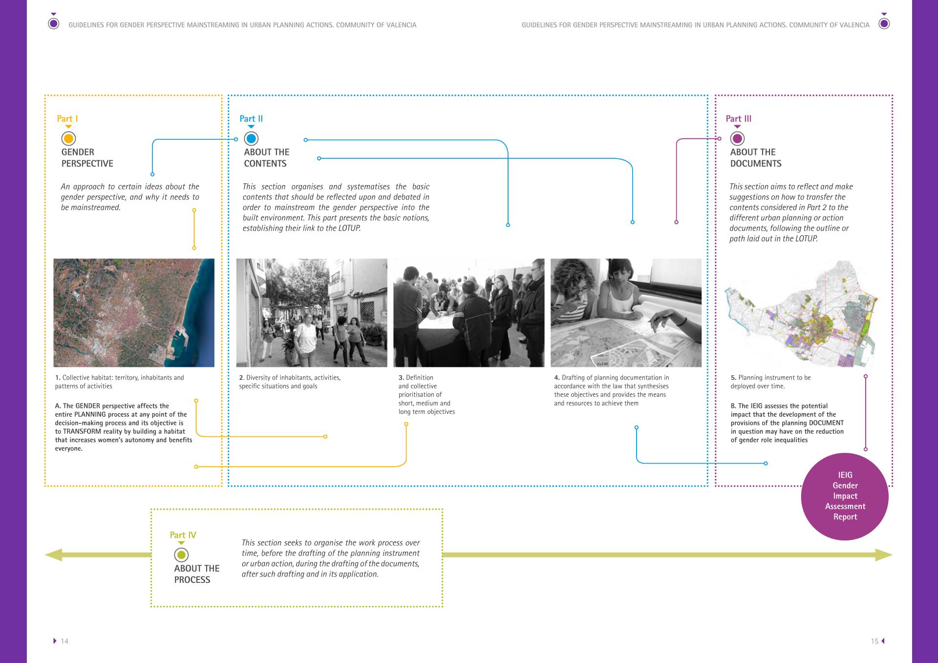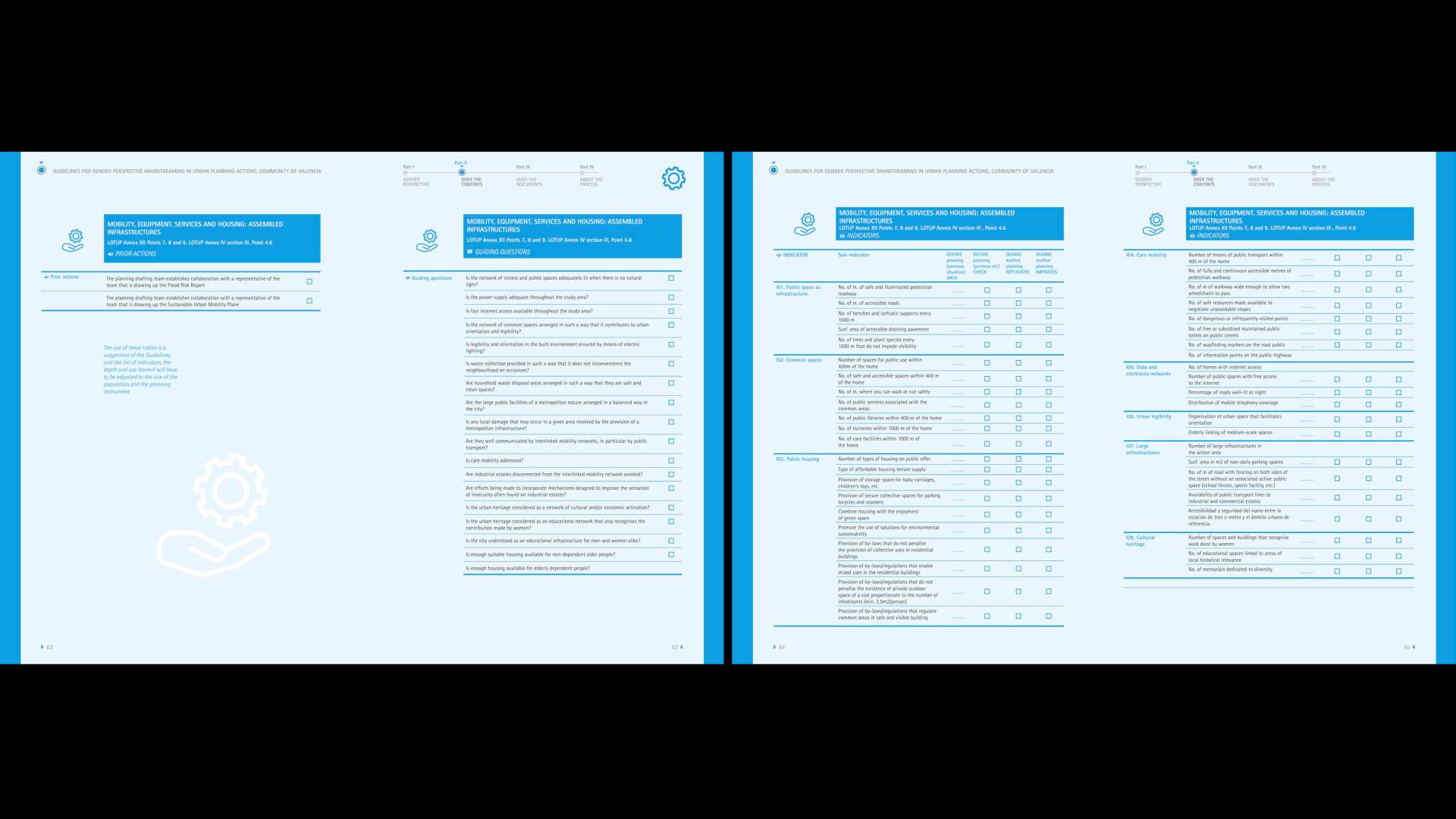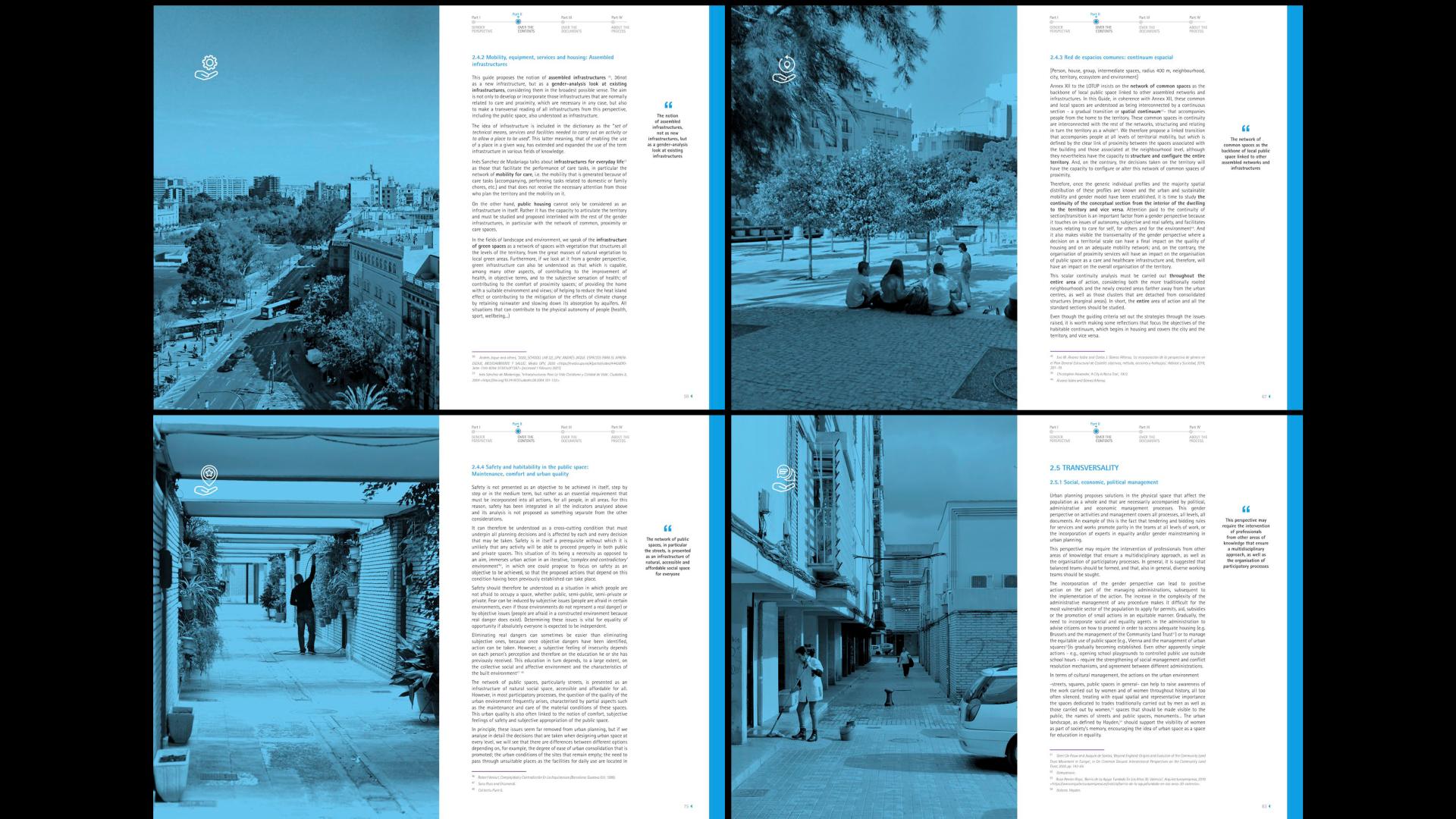 The innovative character of this Guide lies in its approach as an open process that develops over time and that, in reality, is never finished as it is always in progress. This Guide insists on the idea that the gender perspective is not a superficial add-on at the end of the action but an active transformative stance that affects all processes and knowledge, at any time and in any place. Any decision or activity is susceptible to gender mainstreaming, however small it may seem. Therefore, the Guide proposes and suggests open processes to approach the urban environment, seeking the diversity of views and establishing prioritization criteria. This Guide is also innovative in its approach to a flexible model of reflection, where the first task proposed to each team is to establish its own list of checklists, adapted to the place and circumstances in which it must act. This Guide avoids offering pre-cooked recipes from other contexts and circumstances. However, many examples are provided in the text to serve as possible models for decision-makers to follow. Finally, the information obtained from all these examples is collected in an organized series of checklists that are divided into different groups: