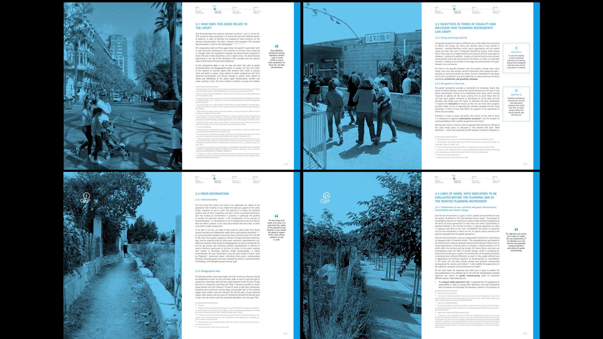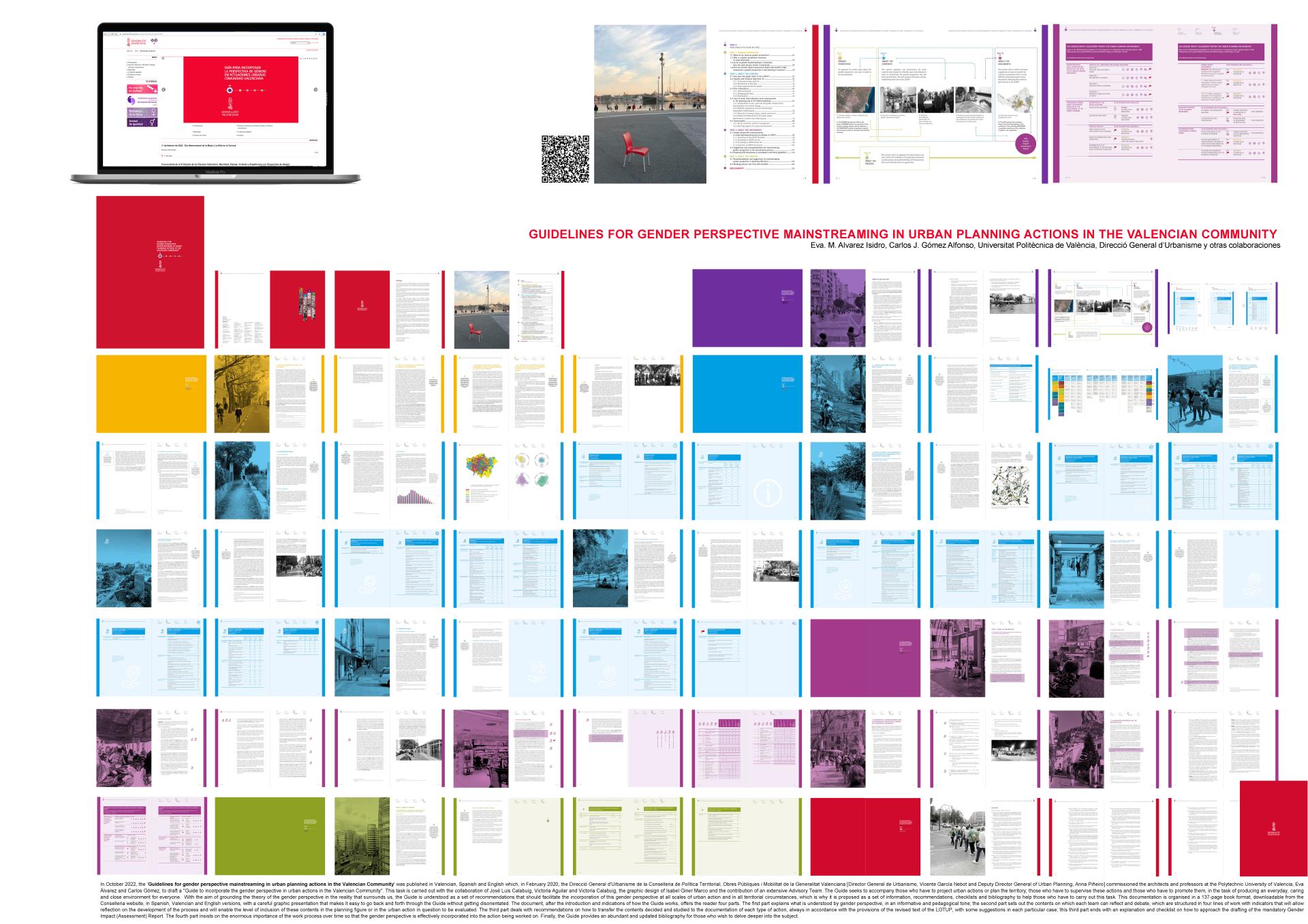 This Guide was also employed as a pattern to revise the applications to the GVA Prize for Gender mainstreaming into Architecture and Urbanism in 2022. It is also the base of the web application for CUG [chair urbanism gender], an agreement between GVA and UPV to disseminate the Guide into Valencian society and incorporate a gender perspective in our urban spaces. On the other hand, the Guide is intended as a model of action that offers lines of work and processes over time. In this sense, the Guide allows the teams to have a kind of rubric that facilitates constant self-assessment and is a resource for argumentation before the Administration. Consequently, the Guide aims to provide security to those who work and those who supervise, facilitate and speed up the Administration's processes and times, which, in itself, is a significant impact. However, this Guide could have a major impact because its accessible reading can allow people to concretize what they could have.