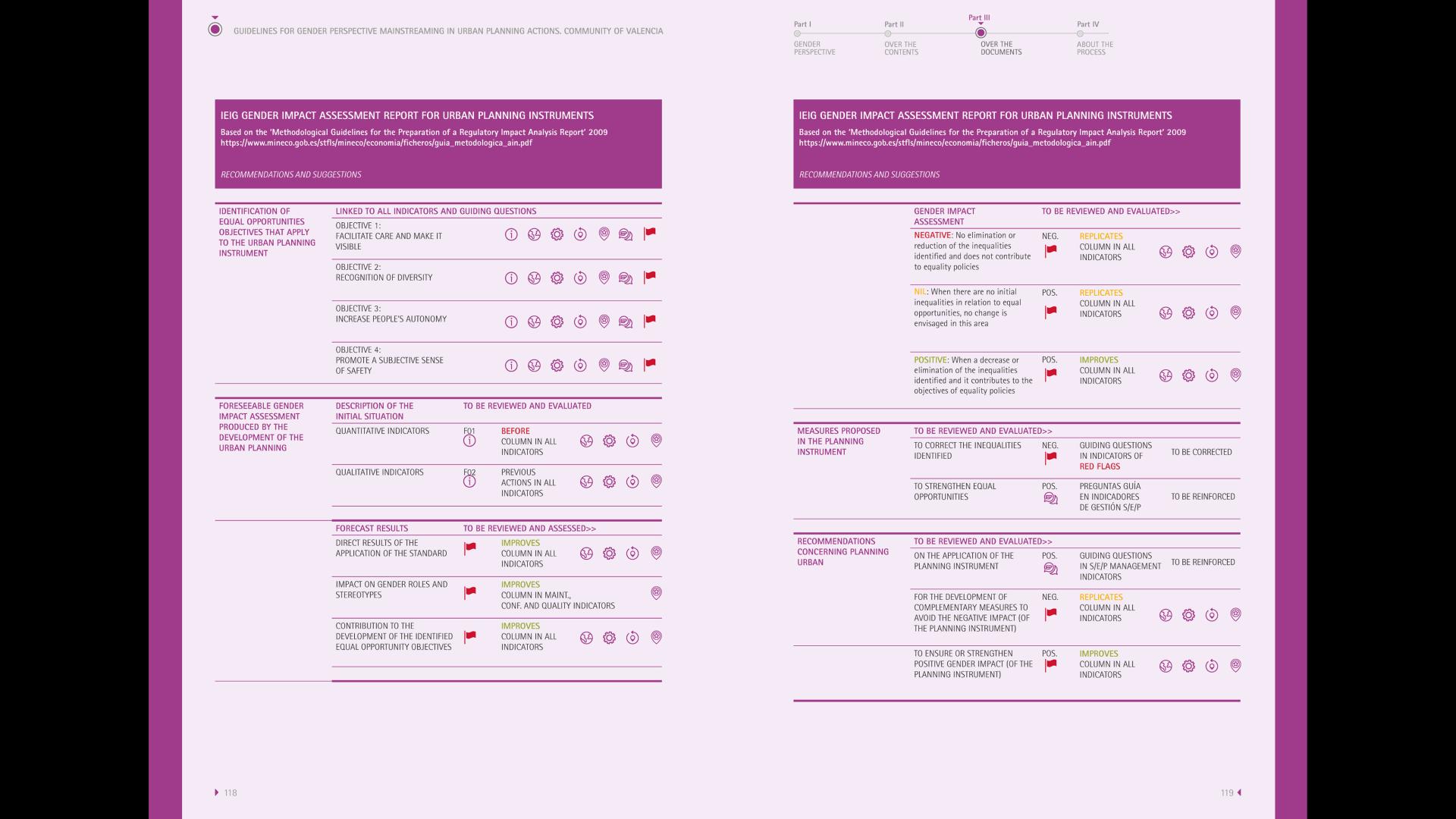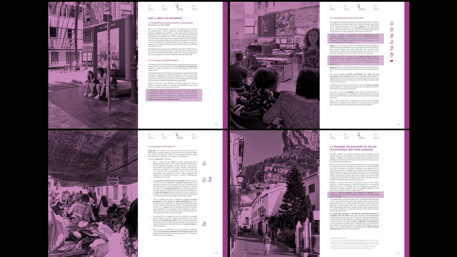 To consolidate the transformative intent of Valencian Land &Urban Law TRLOTUP, these ‘Guidelines for Gender Perspective Mainstreaming in Urban Planning Actions in the Valencian Community’ addresses three objectives: 1.To support decision-makers in the process of reflection. 2.To support urban planning drafting teams in the process of transferring determinations relating to gender mainstreaming to project decisions. 3.To advise the drafting teams through recommendations and suggestions.