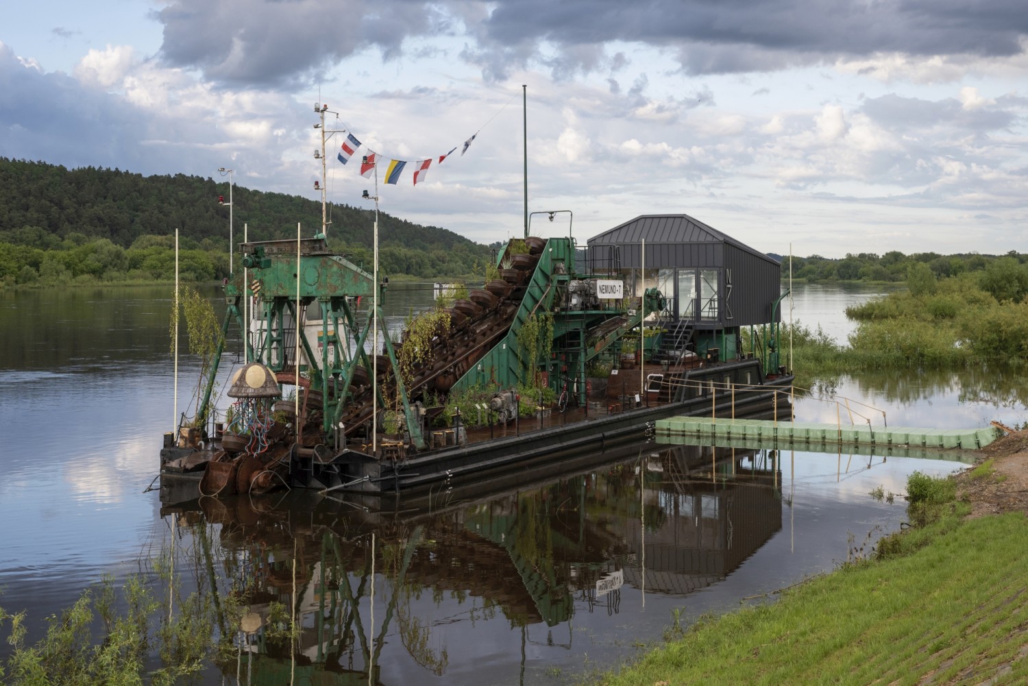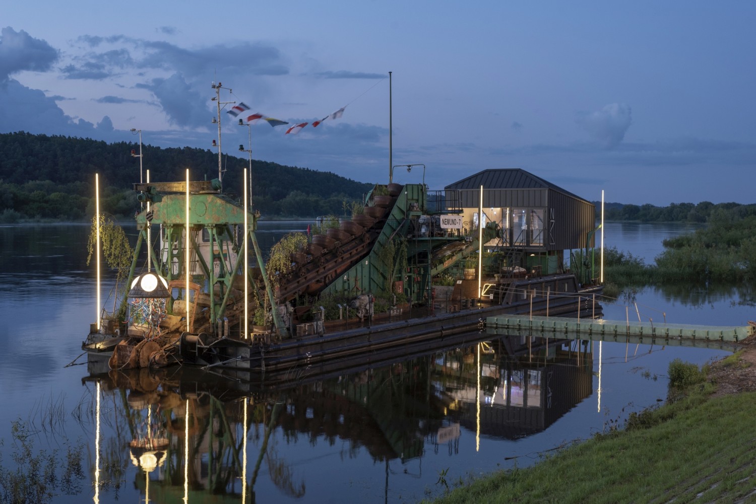 Nemuno7 is a river engineering and landscape design project that is unique in Europe and which serves as a public cultural space. The object made from river dredger combines technological history, heritage and contemporary architecture, and became a new attraction in Lithuania for locals and tourists. A dredger placed on the bank of the Nemunas river near the village Zapyškis became a cultural centre for visual art, interdisciplinary collaboration, science and creativity.
