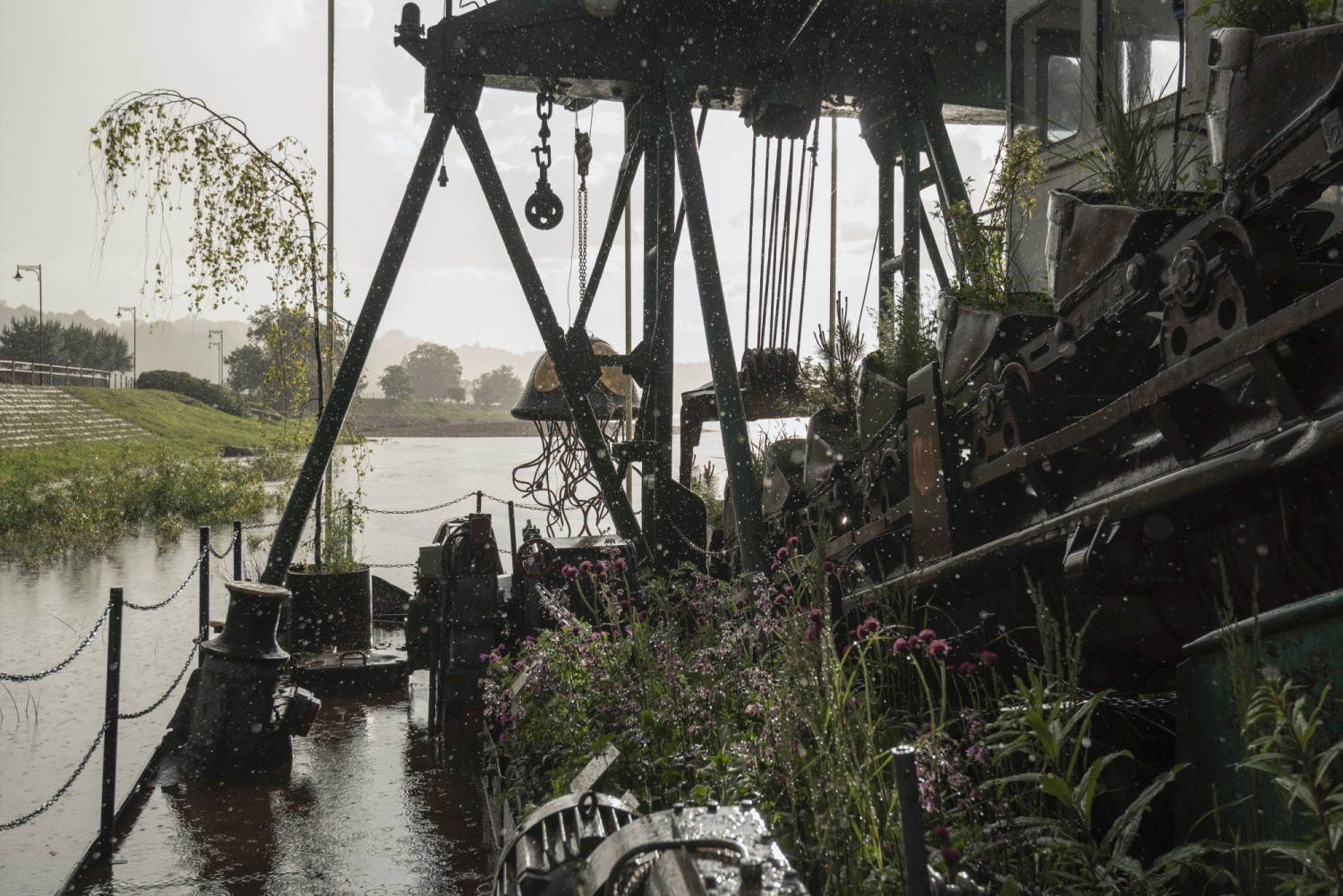 The aim was to integrate the repurposed “Nemuno 7” into the landscape with its natural elements, including plants, sky, water, and to establish new identity of the riverfront. The essential beauty is created by multi-sensual interplay of industrial aesthetics and constant seasonal development of plants, recorded industrial sound-track and buzzing of the insect-friendly environment, static state of the technical object and permanent flow of water.
