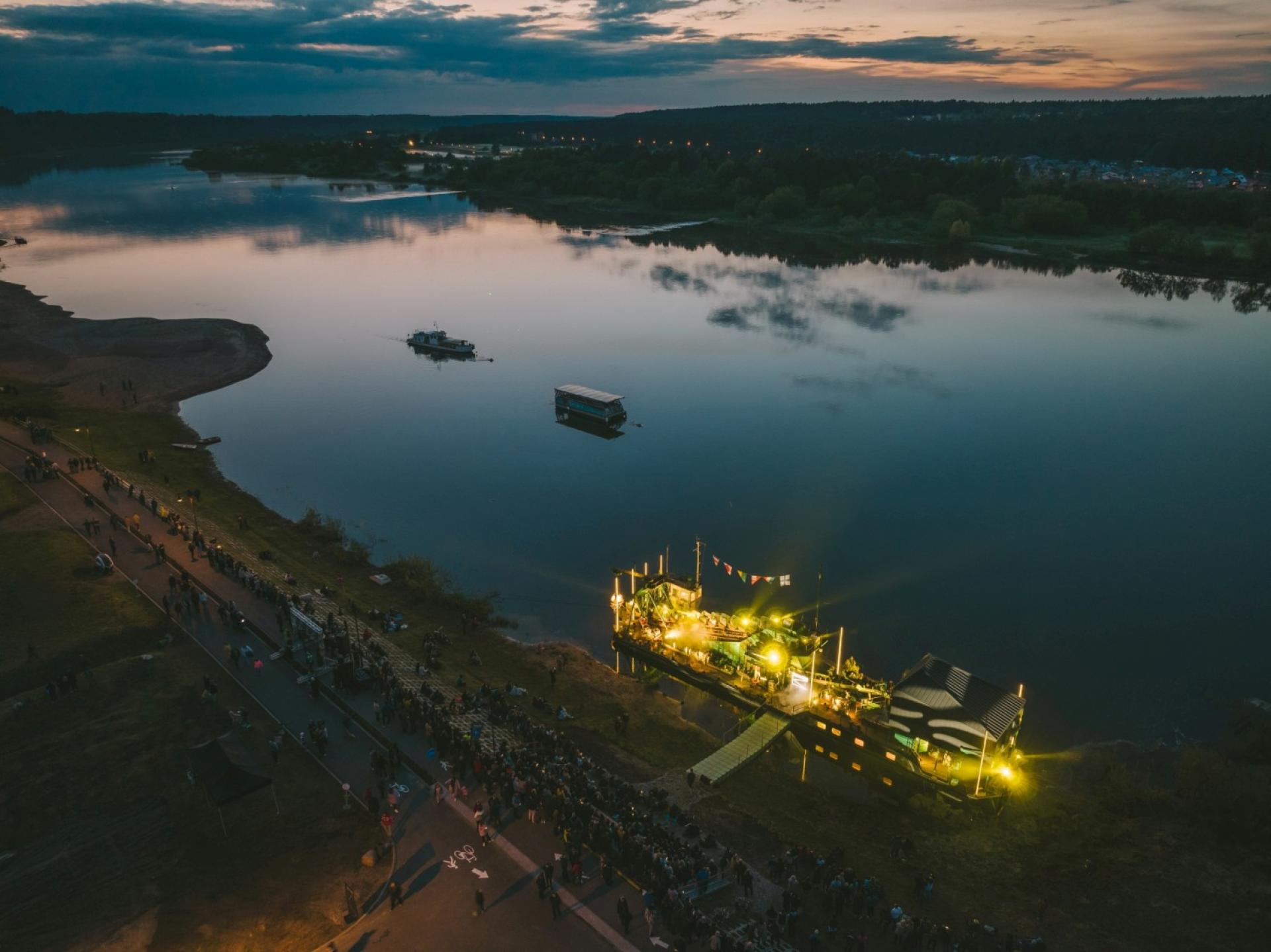 The dredger serves as a space for exhibitions, performances, events and meetings – it has a space for artistic residencies, workshops and an exhibition hall. Visitors are able to see the results of each artistic residency right on the ship. It also acts as a scene and impressive scenography for open-air concerts.