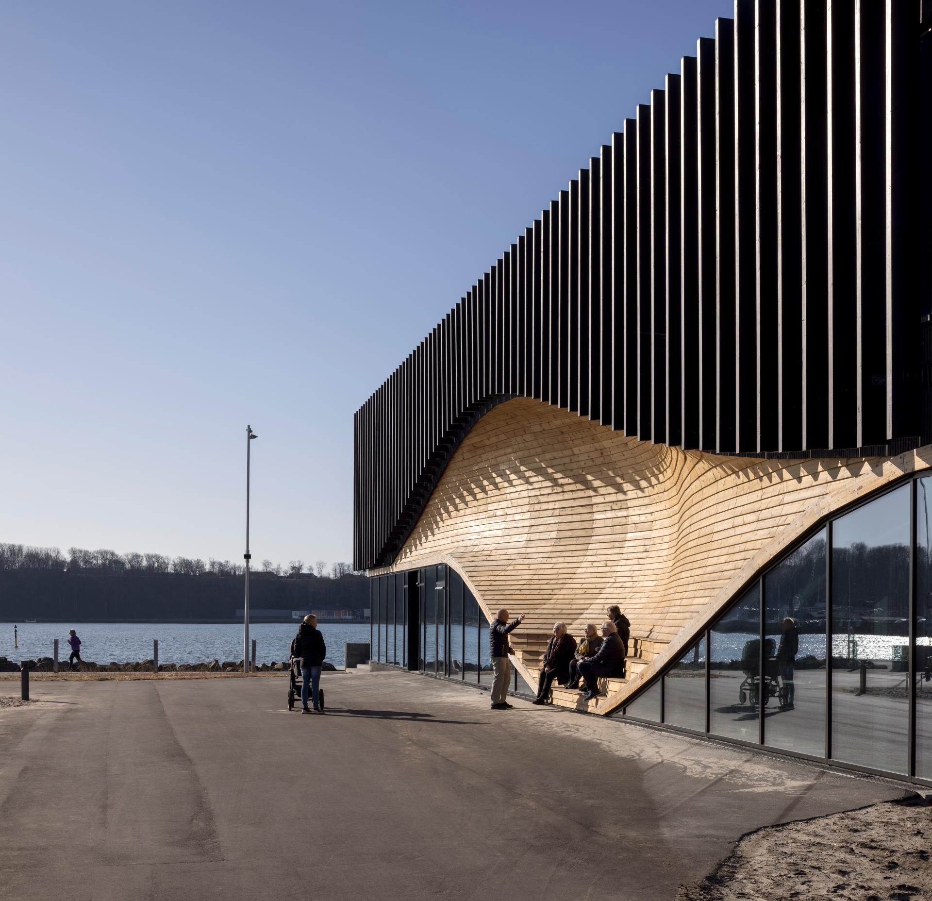 Klimatorium is a hub for climate, science, water, environment, green energy and circular economy supported by the EU and the Danish State. To make Klimatorium successful, great architecture and landscape architecture has been used strategically to create attention of the center both local, national, and international. The architecture has made a building that expresses climate change with a wooden ‘wave’ that rises above the main entrance and had made Klimatorium an easily recognisable landmark. The undulating landscape around the building is called the Climate Wedge and is structured along meteorological isobar lines representing prevailing wind conditions in Lemvig. This design also interacts with the soft lines of the nearby skate park and forms an intuitive route through the landscape. Furthermore, interactive design inside the building, where you can walk through a rain installation and experience real climate solutions, makes Klimatorium a special place to visit.