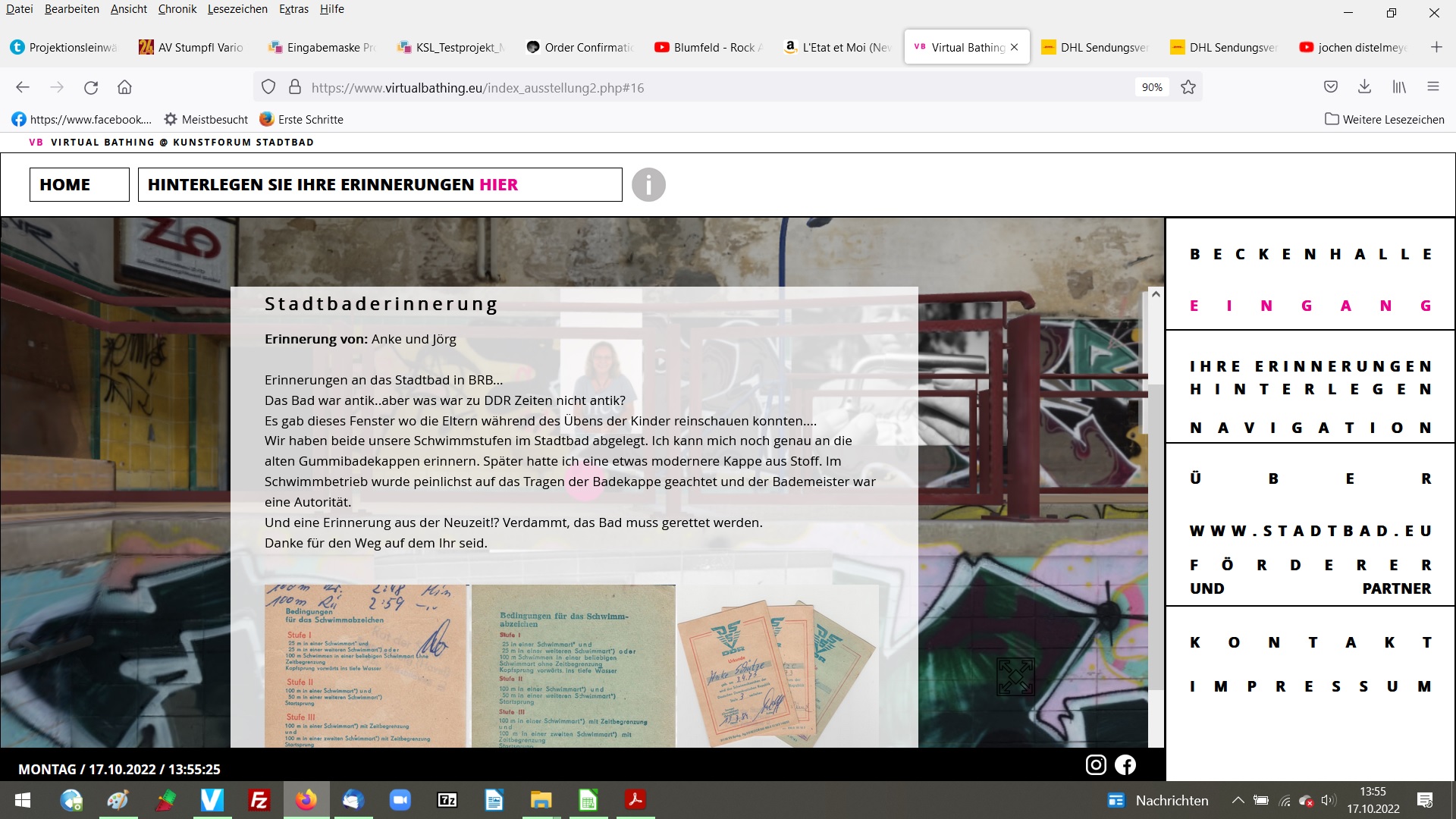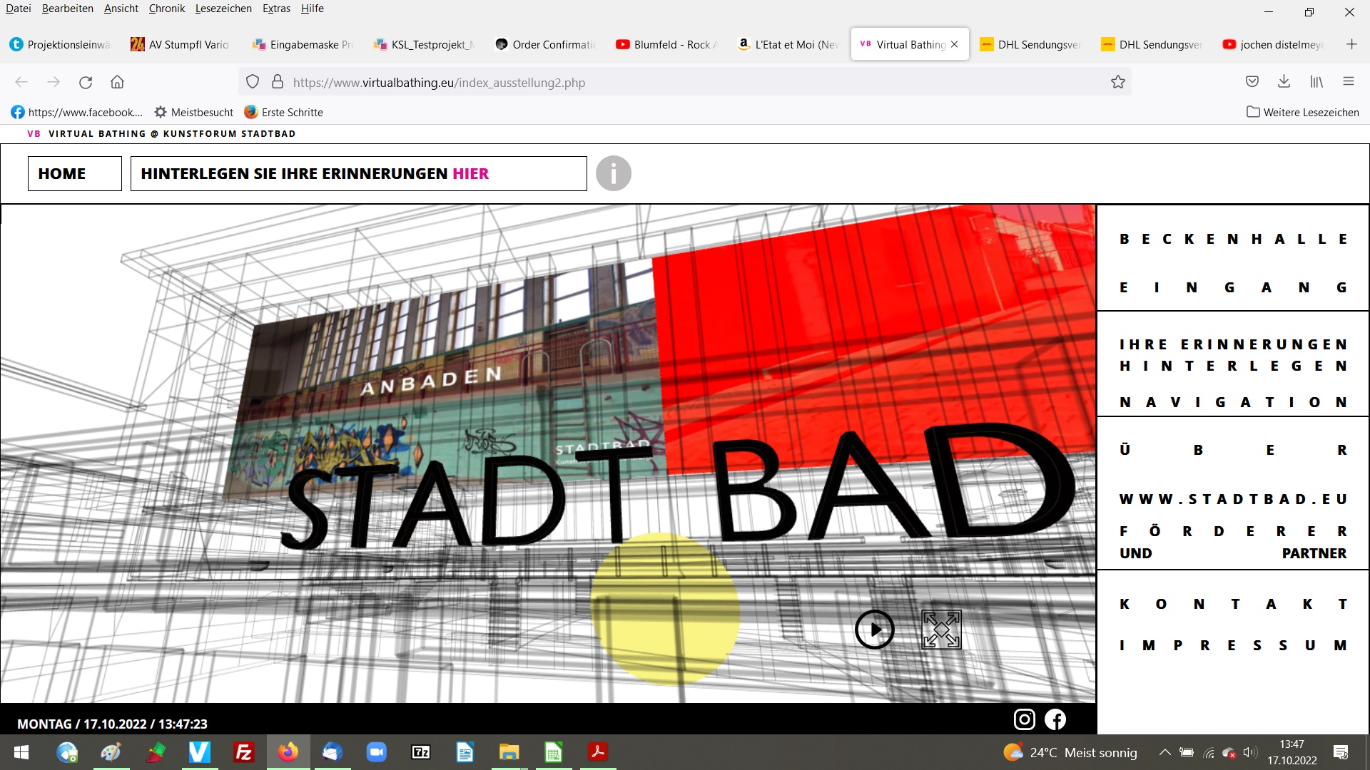 The basis of the STADTBAD Kunstforum Brandenburg is the history of the building. The historic Bauhaus Stadtbad was a public bath and cleaning place from 1930-2000 as part of the welfare forum, with tub and sauna areas. Generations of the city's population and the entire region have gone swimming and bathing in the city pool and connect personal and social memories. This is of enormous value for the analog and digital transformation of the building. For the population, the Stadtbad is still YOUR Stadtbad. We are walking the transformational path from a swimming pool to an art forum together with the population. This also means that people who have never come into contact with contemporary arts and sciences can now experience arts in their Stadtbad and intuitively perceive and experience them. This creates an emotional connection and a common path. In the virtual city pool VIRTUAL BATHING we have modeled the pool in a real-virtual way, every tile can be seen precisely. With the help of interactive tools, we were now able to inspire the population to publicly file their personal Stadtbad stories in the form of photos, videos, illustrations and texts in the virtual pool, to exchange memories with other people and to inspire each other. Analogue and digital development processes merge and trigger each other. People come to the real Stadtbad, are stimulated there and then go to the virtual Stadtbad. Other people, on the other hand, first visit the virtual Stadtbad and then come to analogue events in the Stadtbad building. Former employees, lifeguards, swimming instructors and cashiers are also involved. This is an enormously positive result. Exemplary is the very serious empathy for the origin of the Stadtbad and its people, which not only flows into the transformation process, but also has a significant influence on it.