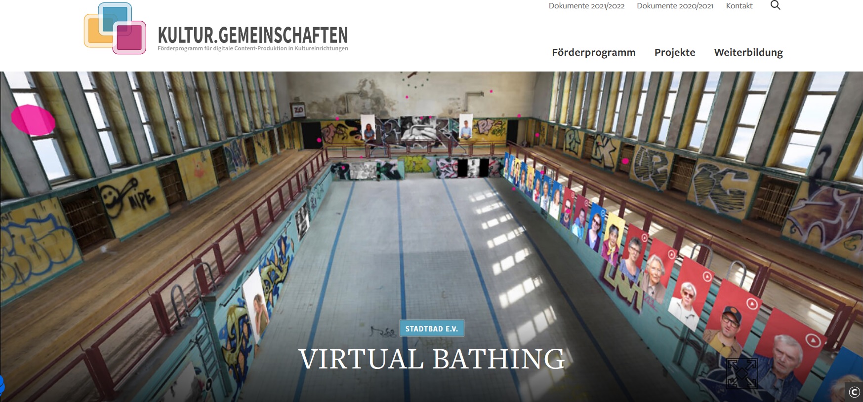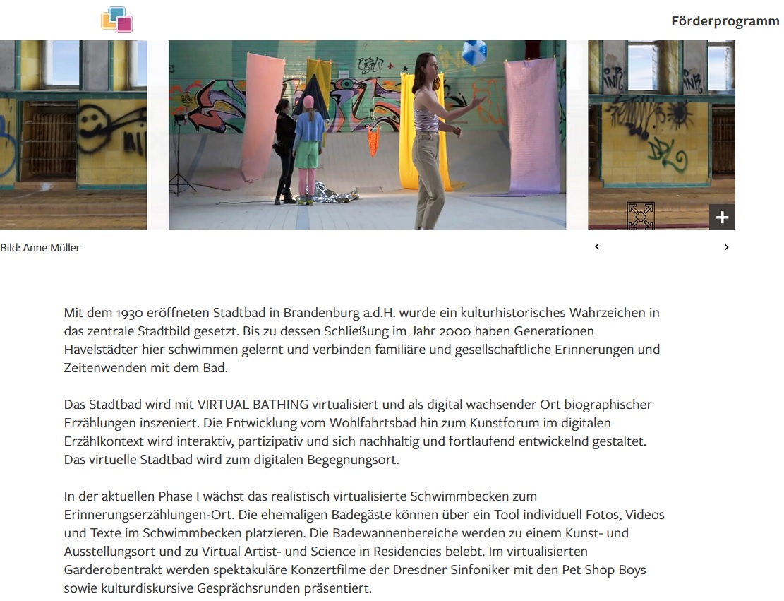 The aim and intention of VIRTUAL BATHING, the virtual city pool as a place of remembrance, art and laboratory, was a constantly evolving, modular structure from the very beginning. It was never the idea to carry out a single project, realize it successfully and then finish it. This means that the basic attitude is as a build-up, modular system. Against this background, the extremely positive outcomes and results can already be defined and the further development and expansion of the virtual city pool is underway. We saved the historic Bauhaus Stadtbad building from gutting and housing construction. the building will be refurbished as a monument. We have completely virtualized the city pool and, together with the city's population, have developed the virtual pool into a touching place of remembrance and storytelling. We have also virtualized the cloakroom and bath areas and provided interactive structures and tools to offer international artists networking opportunities and art presentation platforms. We have developed a broad partner structure that relates to city, statewide and statewide levels. we have installed a successful funding system, through which interdisciplinary cultural projects as well as encounter projects are now being implemented. We have reopened the Stadtbad for the population and thus released a true place of encounter, identity, memory and future for transformation. We include people with mental and physical disabilities in the projects as well as refugees. We would also like to emphasize the 85% female team structure of the Stadtbad. The sustainable symbiosis of analogue and virtual building was successfully mediated and communicated, so that the population was relieved of technological fears and movement and joint, cultural and social design are possible.