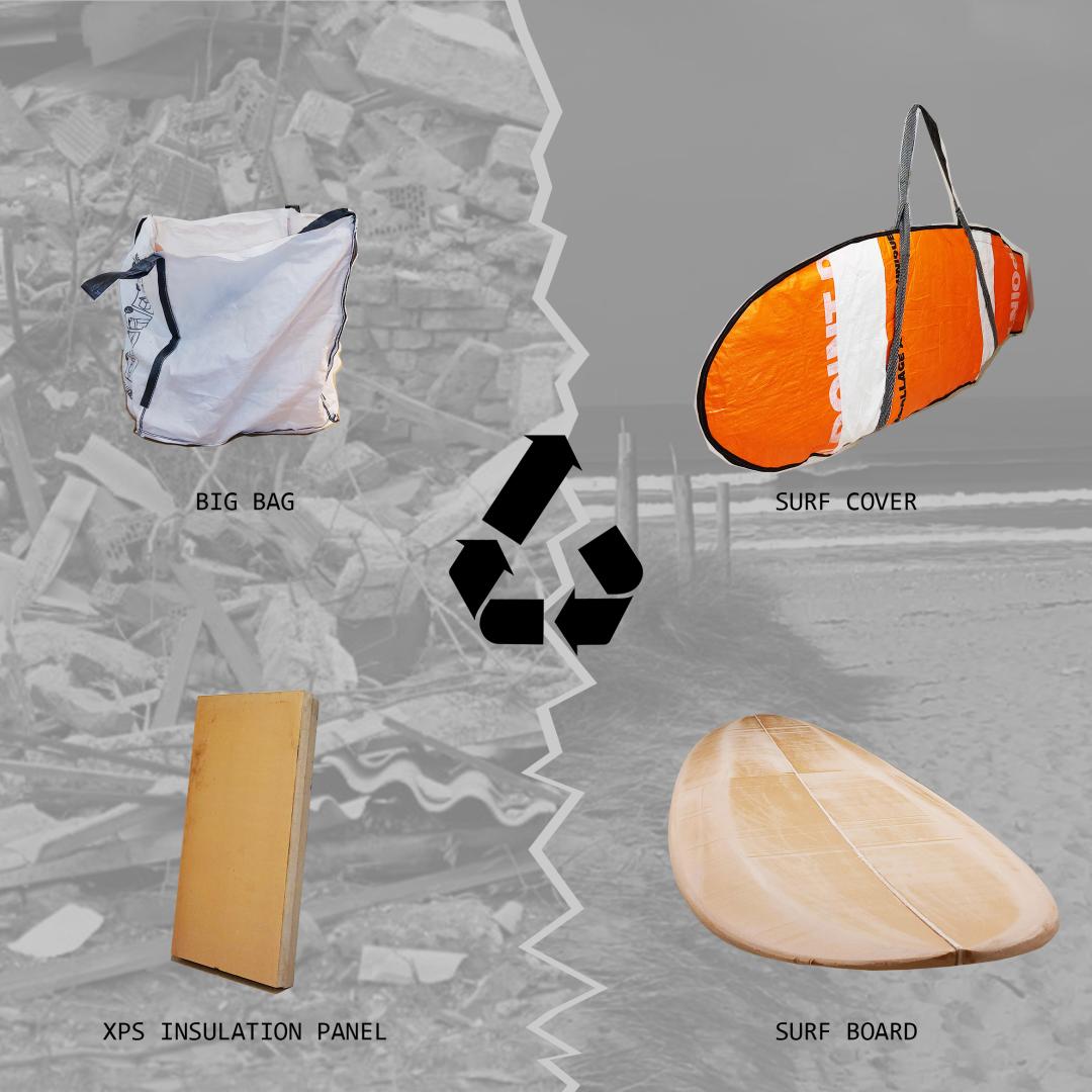 Despite being a sport connected to nature, surfing is a polluting sport because of the environmental impact of its associated gears. Our objective is to find the proper waste to replace their polluting components. We chose insulation panels to replace the surfboard core, linen fiber and bio-based resin to make its envelope and reclaimed construction big bags for its cover.