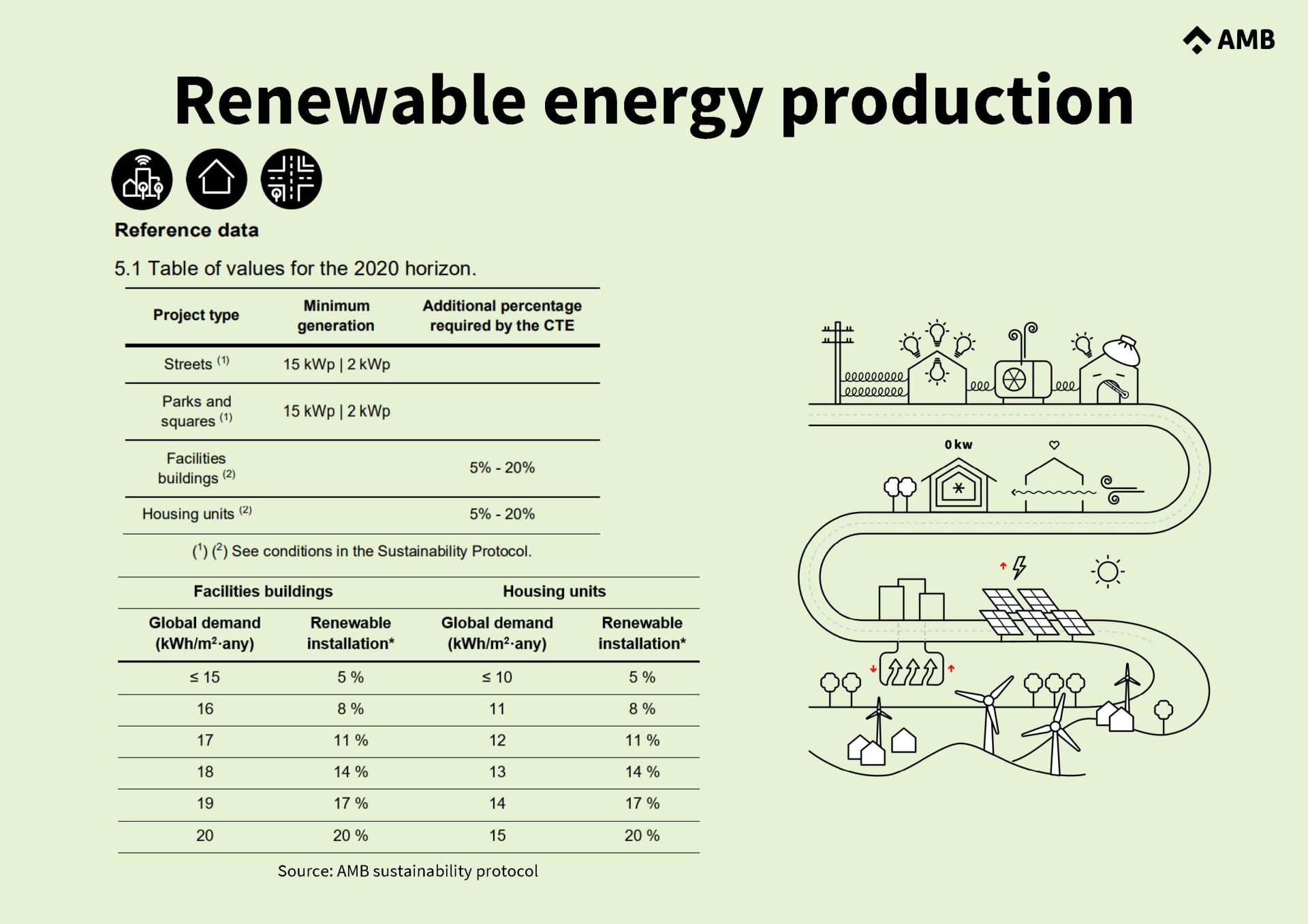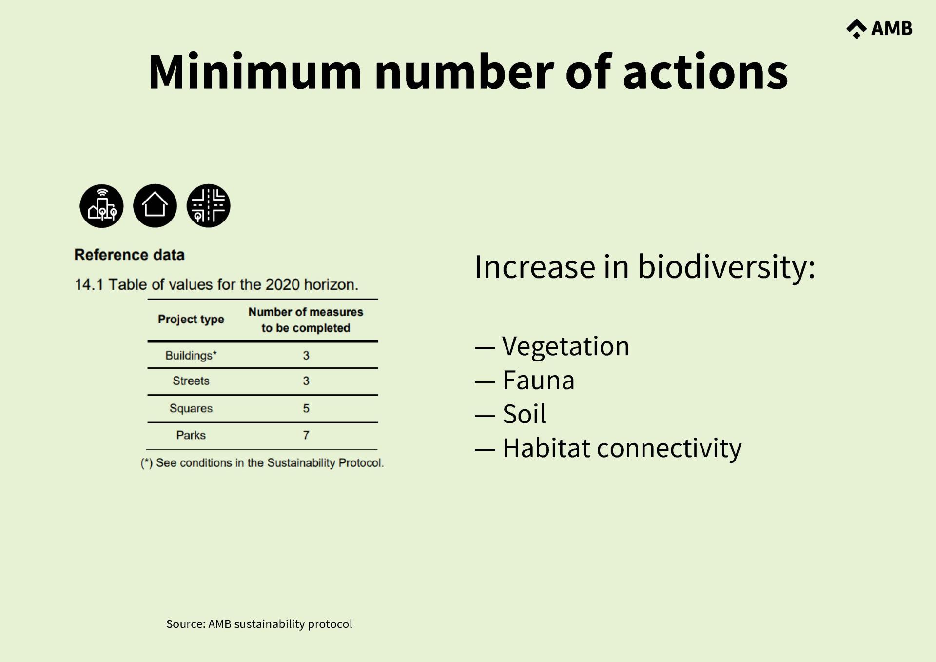 The key objectives of the Sustainability Protocol (SP) are to respond to the United Nations 2030 Agenda Sustainable Development Goals (SDGs) number 3, 6, 7, 9, 11, 12, 13 and 15. To do so, AMB recognises the need to go beyond current regulations by introducing mandatory environmental criteria in AMB and IMPSOL projects and works public procurement.