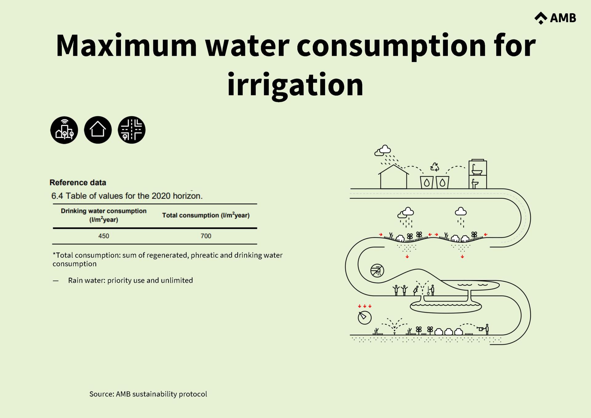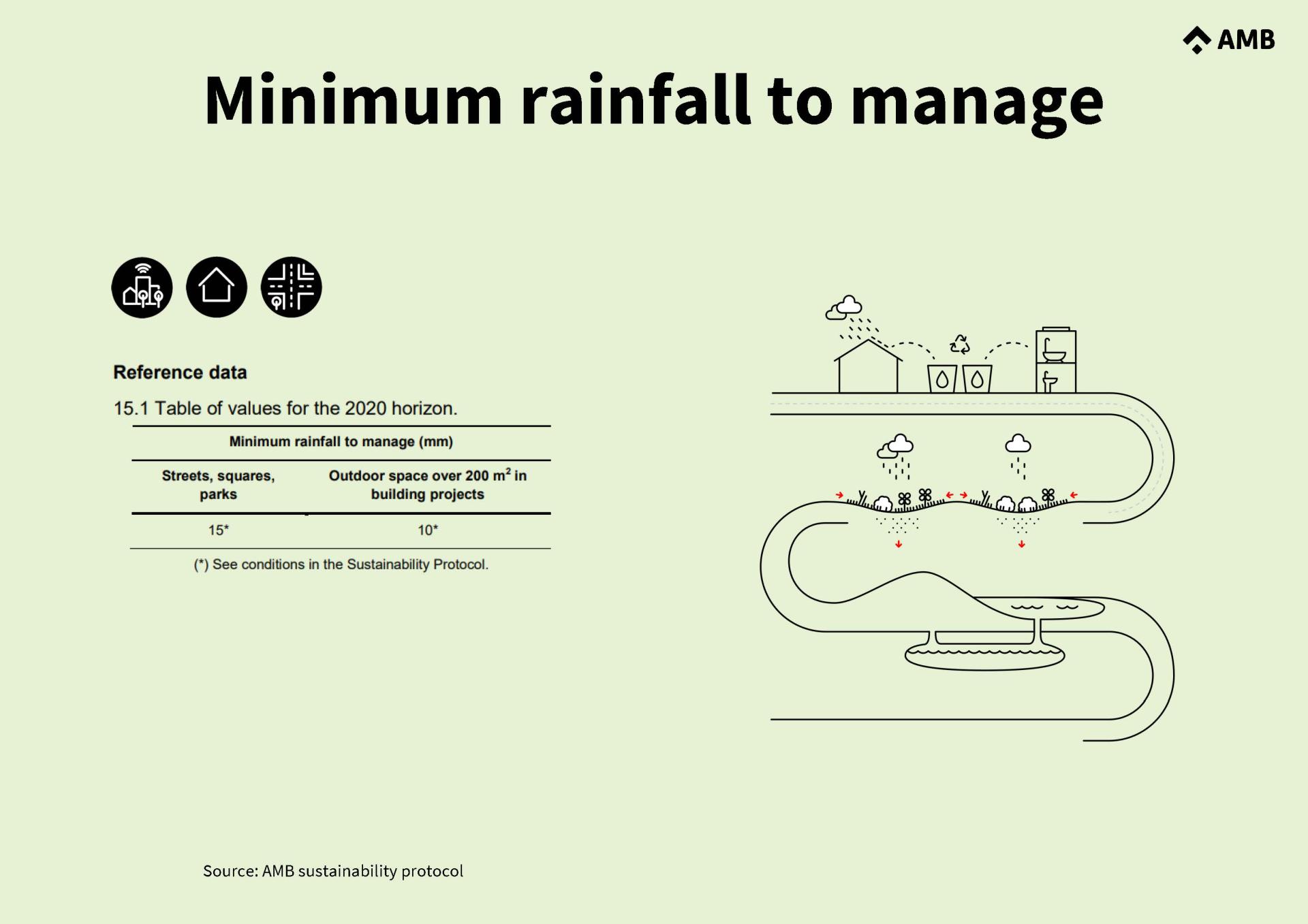 To balance the water cycle, the SP sets criteria for a minimum rainfall to be managed in public space through sustainable urban drainage systems to reduce aquifer saltwater intrusion and erosion. With respect to drought, it promotes the use of alternative water sources and sets limits on water consumption for irrigation.