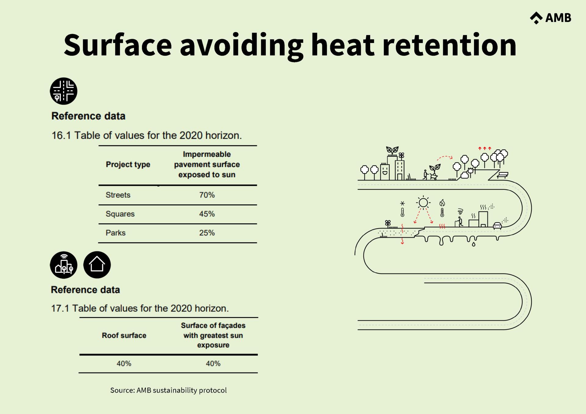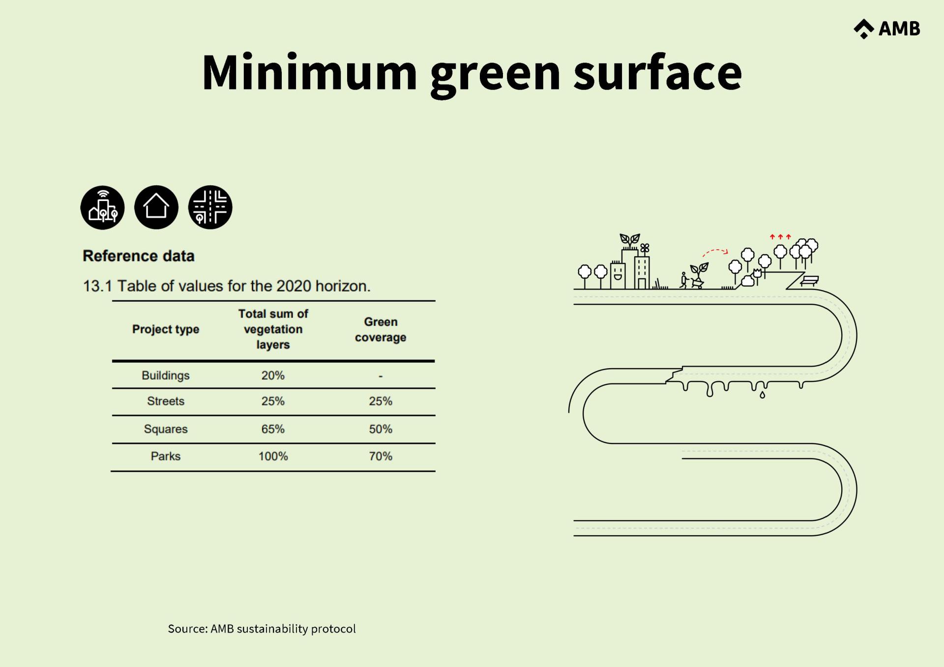 On health, the SP sets ratios on sustainable mobility facilities and constraints on harmful materials. A new indicator limiting the impermeable surface area exposed to sunlight intends to avoid heat retention by increasing the albedo effect and improving the evapotranspiration conditions of urban surfaces. Two new indicators are defined to comply with minimum green surface guidelines and to enhance ecosystem services through vegetation layers, as well as biodiversity, which is the basis for resilience.