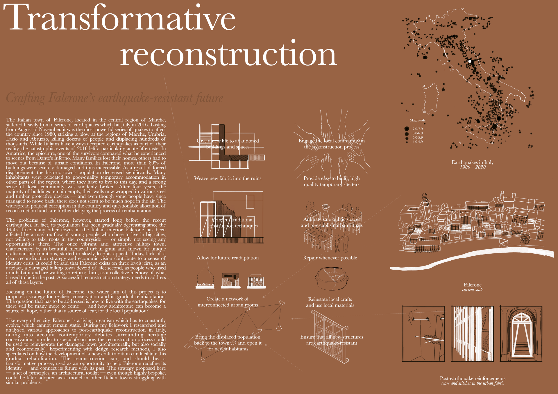 How to live with earthquakes? The project focuses on the future of Falerone, a medieval Italian town damaged by a series of tragic seismic shakes in 2016. The strategy for resilient conservation and its gradual reinhabitation has been developed in close dialogue with the local community, authorities, architects and engineers. A new, experimental crafts school is proposed to allow local craftsmen to pass their skills to new generations and to stimulate local economy based on sustainable know-how.