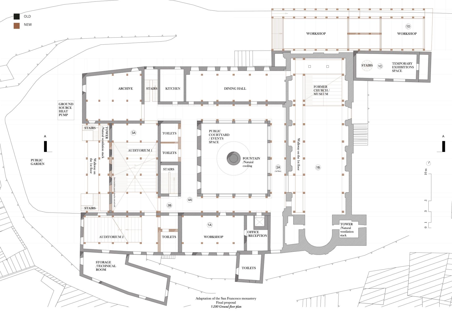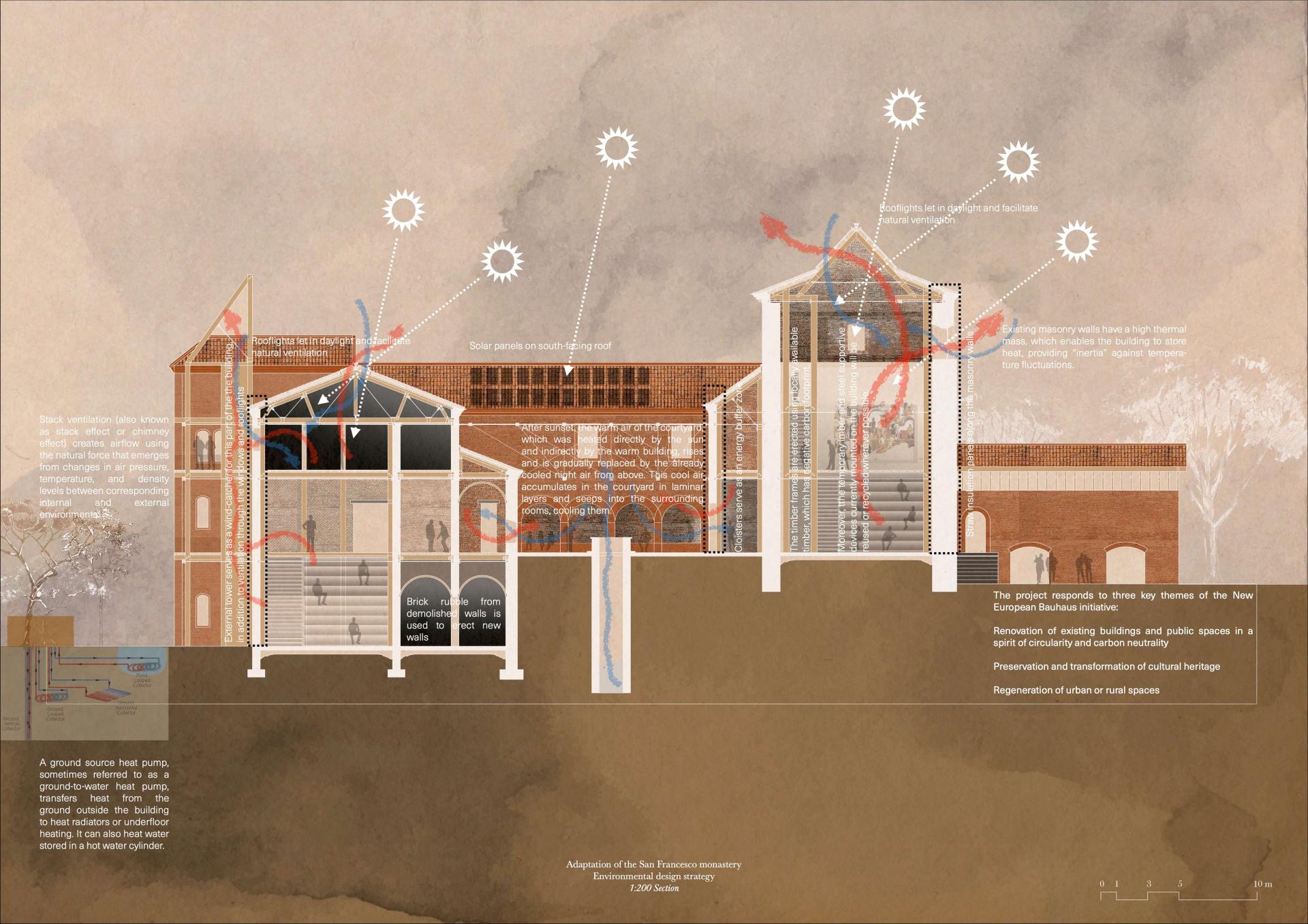 The intervention would be implemented using sustainable strategies and reusing much of the original fabric, whenever possible. New layers of straw insulation panels would be inserted between the existing walls to form a fully insulated whole and increase the standard of thermal performance. Daylight would filter into the interior through the junction between the existing and added structures, emphasizing the junction between the old fabric and new insertions. A ground source heat pump and solar panels on the south-facing pitched roof would provide energy. The building would be naturally ventilated using ventilation stack effects to the maximum. In this way, the existing and found structures on the site would be retained to their greatest extents.