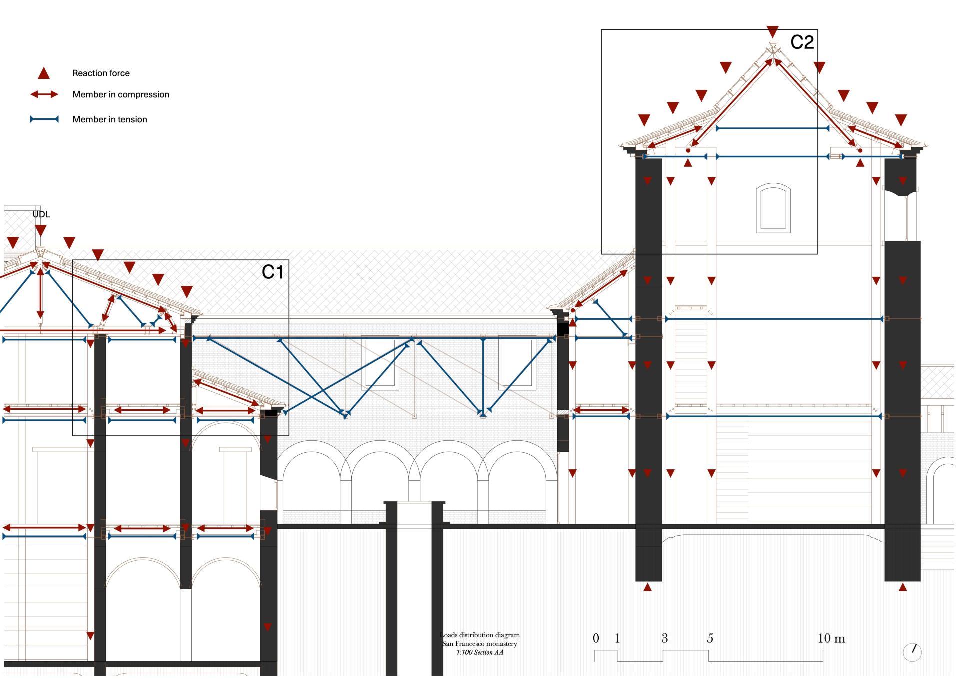 How to insert new fabric into the old — respecting layers of history, of which the earthquakes are an inherent part? Perhaps some of the scars and cracks should be preserved to serve as a poignant reminder of the past, becoming a living memorial? And perhaps there is a potential to develop a new language of additive, ‘surgical’ architecture, where the contemporary timber frames serve a protective function, supporting and bracing the damaged medieval walls — but at the same time can be inhabited, framing new uses and reprogramming internal spaces. Reflecting on reconstruction of Merola tower, a highly accomplished example of 21st-century seismic architecture, Phillips noted that “it is at once a restoration and a reinvention, adding an entirely new character to this local monument” (The Architectural Review, November 2020). There is a similar ambition behind this project, which additionally aims to explore the tension between low-tech and hi-tech. It builds on a potential to create a modular timber frame system, easily modified, replicated and recycled, with various elements prefabricated and quickly assembled on site.