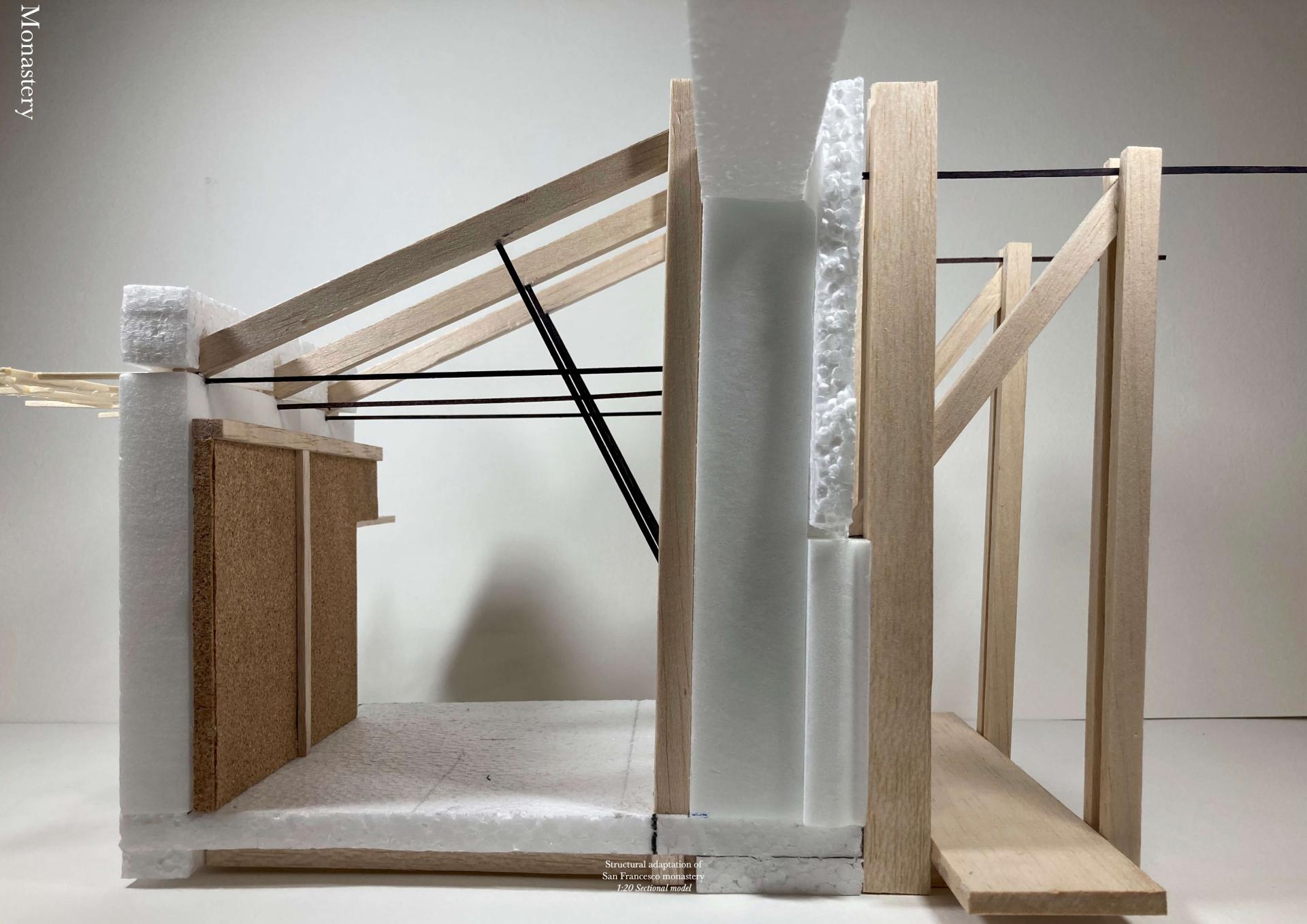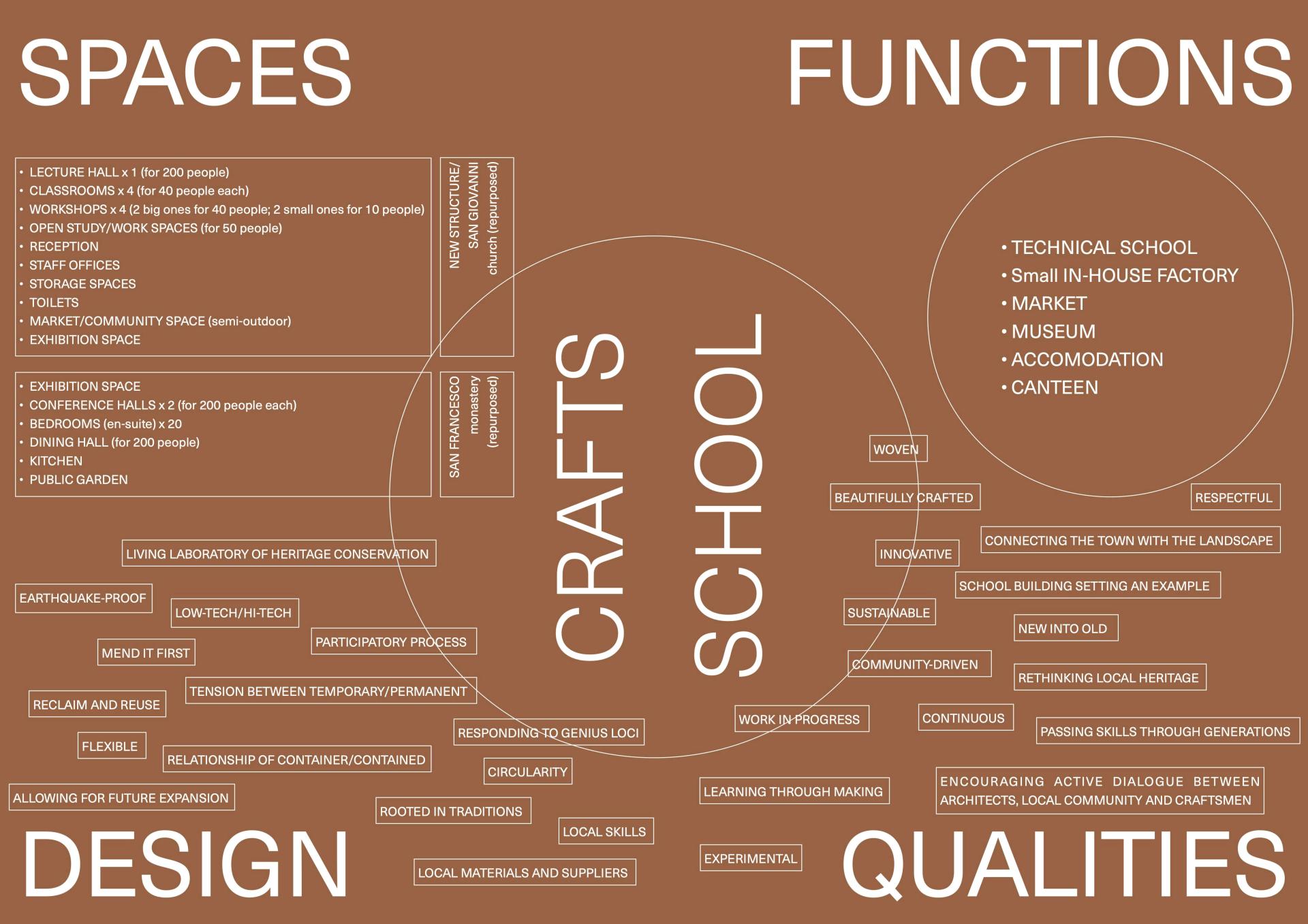 Falerone, an Italian town located in the central region of Marche, suffered heavily from a series of earthquakes which hit Italy in 2016-2017. Its problems, however, started long before the recent natural disaster. From gradual depopulation, through economic decline to loss of artisanal traditions, Falerone can serve as a case study of the relationship of earthquakes to other signs of decline. There is a pressing need to help rural communities regain their self-confidence, and this research & design project explores whether external models can serve as an inspiration for Falerone. Yet one ought to remain cautious of any strategies imposed from the outside — the process of rural revival should be conducted through careful rediscovery of local heritage, with anthropologic sensitivity, in order to connect any new architecture to its age-old context. The unique local heritage forms the basis for speculations about the years ahead. Could a new crafts school be established in Falerone, allowing local craftsmen to pass their skills to new generations, stimulate local economy (starting at the micro level) and generate touristic activities grounded in local culture? If so, what skills are needed there? Readapting the damaged medieval San Francesco monastery, the new educational institution is proposed as an experimental hotbed to develop earthquake-resistant construction techniques. To facilitate this, the architect has to move beyond the boundaries of conventional practice and become not just a designer, but a civic leader — a mediator between the citizens and authorities, a catalyst for moving projects from concept to completion. In a context as complex and delicate as this one, the architect has to find ways of engaging communities in the process of reconstruction — physical reconstruction of urban fabric, but also symbolic reconstruction of place identity.