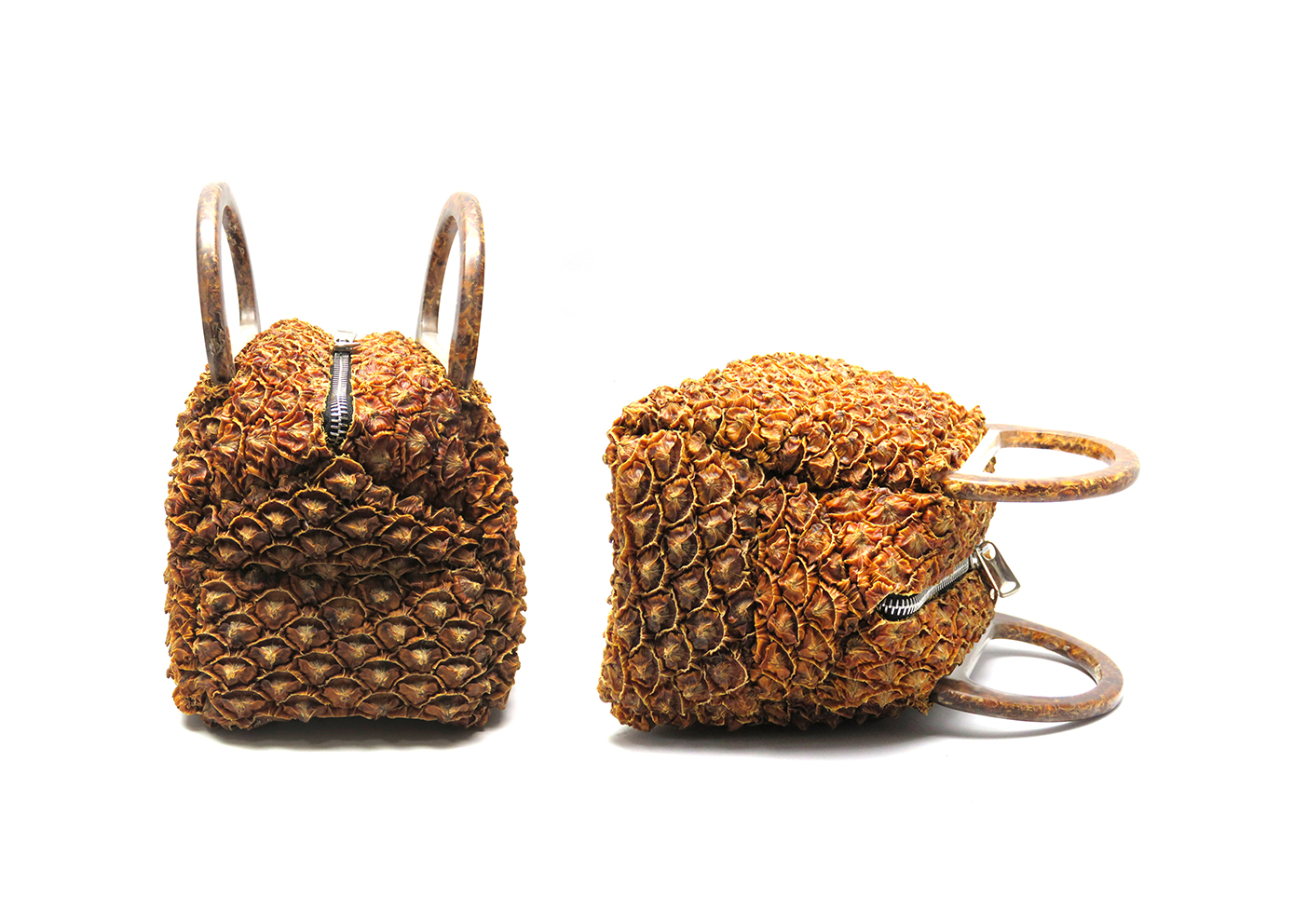 Using the peel of fruit rather than that of exotic animals in an entirely Made in Italy, circular and plastic free production process is the basis of the idea, now concrete, of the designer and entrepreneur Francesca Nori, who after graduating in 2017 undertook a long journey, generating starting from the study of the pineapple fruit and with the support of a well-known Italian chemical company and the visionary Fabrizio Moiani, an innovative production process (patented) capable of transforming unused food waste, such as peels, into aesthetic, functional and stable materials over time. The peculiarity is in the production process, which compared to that of the other alternative material productions present on the market today, allows the material to maintain the initial visual appearance of the peel, operating without flattening or transforming the aesthetics of the starting vegetable product. The first result of the project is Ananasse, the innovative bio-based material created from the reuse of the peel of the pineapple fruit, hence the name. 70% of the pineapple fruit is naturally made up of inedible waste elements for humans, including the peel, very often left to rot on the ground with continuous emissions of harmful gases into the air. A technique fortunately not used in Italy, where the peel of the fruit, especially in large quantities, is mainly disposed of in landfills with high disposal costs for companies. Vérabuccia is the result of Italian visionary and creative talent combined with the desire to develop a project made of innovation, beauty, circular economy, sustainability and based on the ennobling of waste that becomes a resource. The project does not intend to limit itself to the recovery of the pineapple peel only but to extend itself to further vegetable peels, focusing on those that are difficult to reuse and have a long biodegradation.