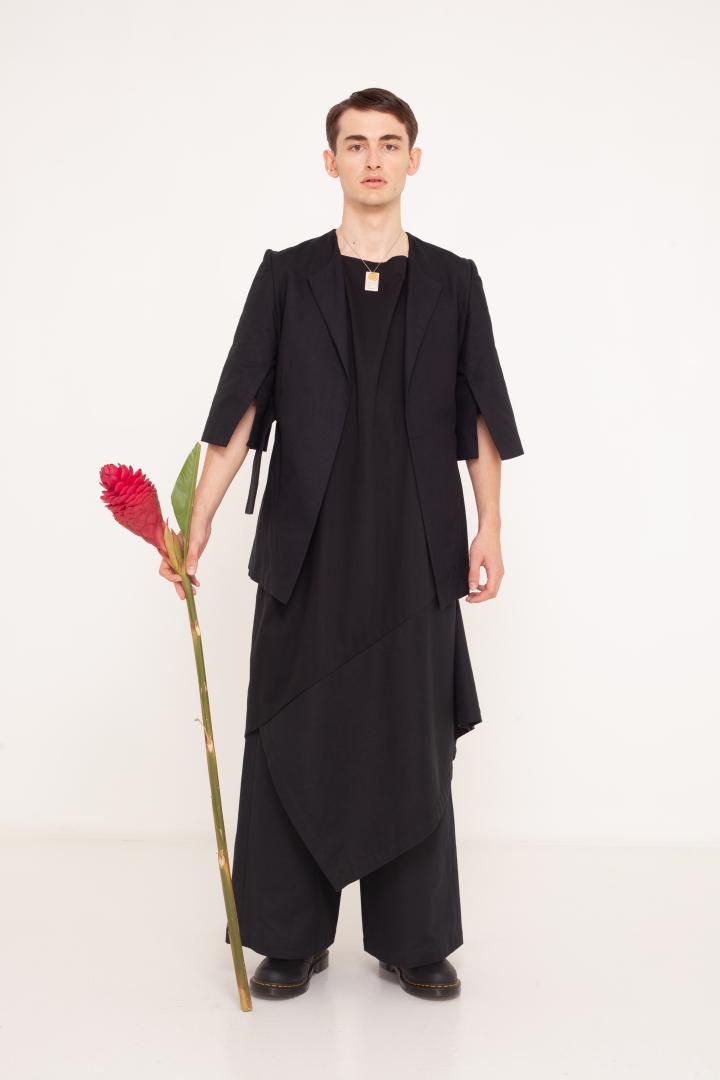 Our new rationalism combines high-end sustainable materials, with a local zero-waste handcraft production and timeless minimalist design. Our garments come to life on the body and are created in a size-fluent way, meaning it will fit even if the body changes - for a WasteLessFuture.