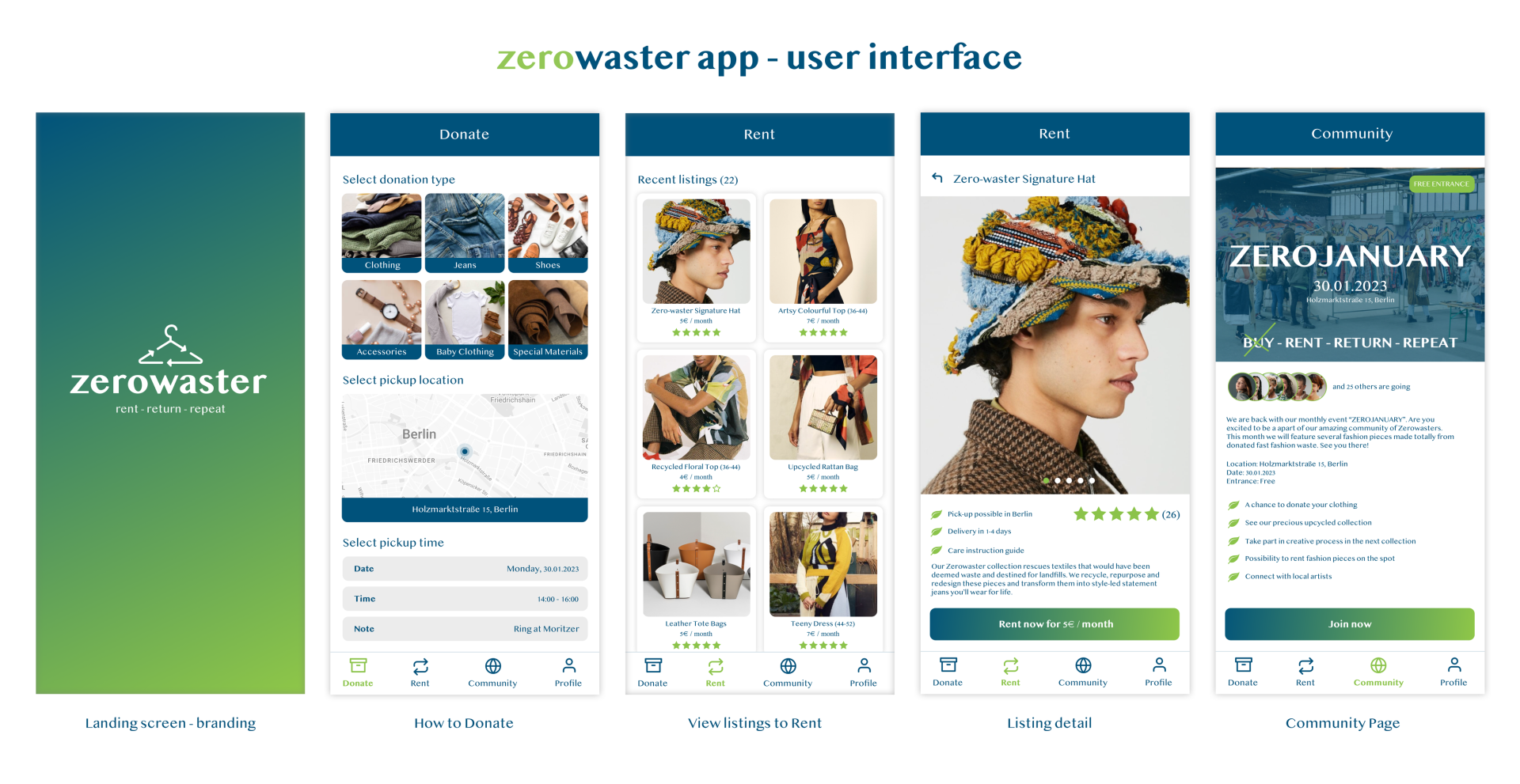 Zerowaster hopes to reduce fast fashion wastes ended up in landfills. In Germany, there are old clothing containers set up so that local citizens can donate their unwanted clothing. However, oftentimes, these containers are overfilled and those that are not in the containers will most likely end up in landfills. The public are mostly unaware of how the 'donated' items are recycled. Moreover, to send away their donated items, citizens need to go to certain donation spots in the city. As donation takes effort and time, and with little knowledge of how donated items are processed, people feel less incentivized to donate. Zerowaster solves this problem via a transparent and no-effort donation method. We showcase a clear reason to donate: to give fashion waste a second life in a brand new form. This creates the excitement among the donors to see how their wastes are transformed, and also ensures the community that their donated fashion waste will be put into good use, which will create stronger incentives for people to donate, and not throw their fashion waste away. Moreover, via a renting program, instead of buying, zerowaster makes sure that all upcycled items will be returned to upcycling center to be reused and repurposed. We encourage our community to never think of any piece of clothing as disposable.