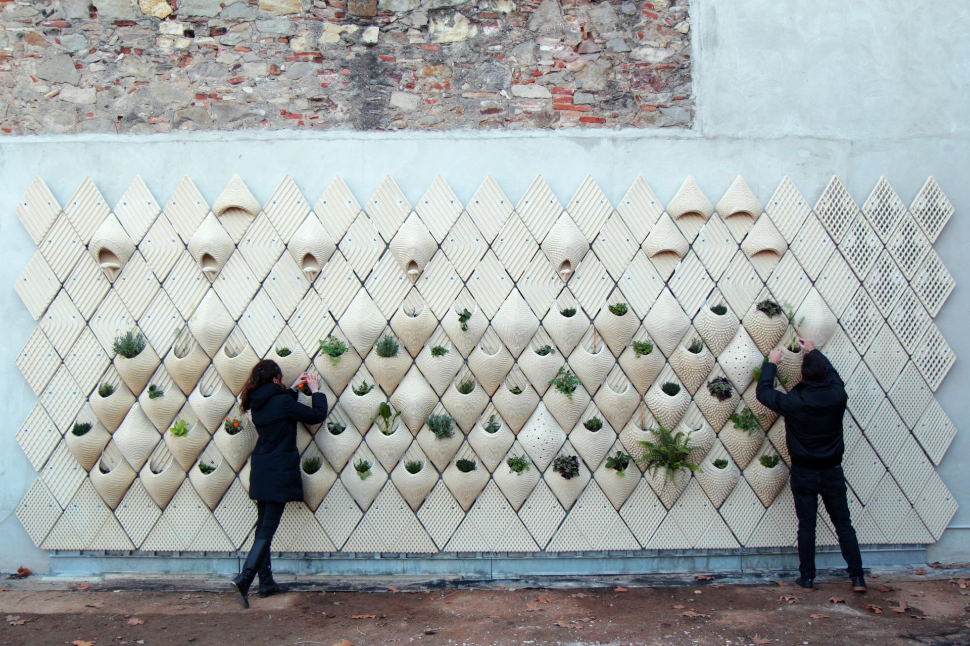 CO-MIDA’s systems have been digitally fabricated using 3D printing from natural materials (ceramic) that allows an easy replication in different environmental and urban conditions and makes the system adaptable to different scales, dimensions, morphologies and requirements of vertical surfaces of the urban space. All the parts of the modular systems (i.e. ceramic modules, management and irrigation systems and plants) can be completely and easily disassembled to be reused in another urban area with the same or a different configuration.