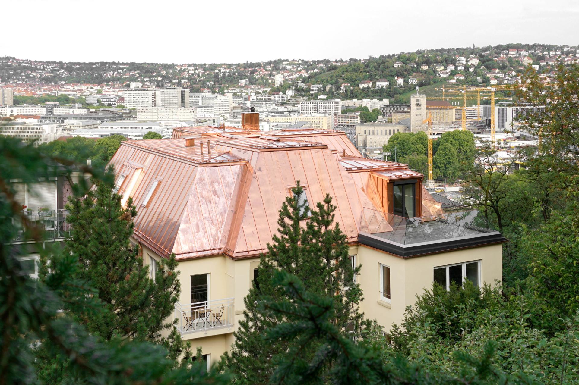 Likewise, by renovating the rest of the building, a lot of grey energy could be dispensed, and a part of Stuttgart's historical architecture could be preserved and reconsidered. Due to this subtle refurbishment, it was possible to avoid an ecologically questionable composite thermal insulation system and, at the same time, to create added value for the surroundings and the Stuttgart hillside view by preserving the sandstone façade and adding a copper-clad roof that blends into the ensemble of buildings on the hillside over the course of time and the ever-changing colours of the patina.