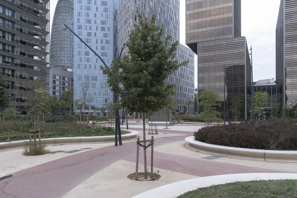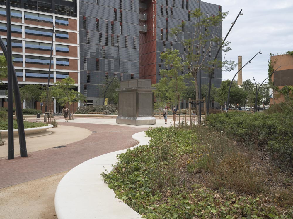The gardens are part of the 22@ plan to refurbish former industrial areas at the Poblenou district and transform them into a strategic hub of knowledge of activities that involves companies, universities and public organizations. In this sense, the gardens were designed as a place of encountering in the heart of the district. Enclosed by tall office and educational buildings, the place was conceived as a green area in which citizens can relax surrounded by mediterranean plants and trees.