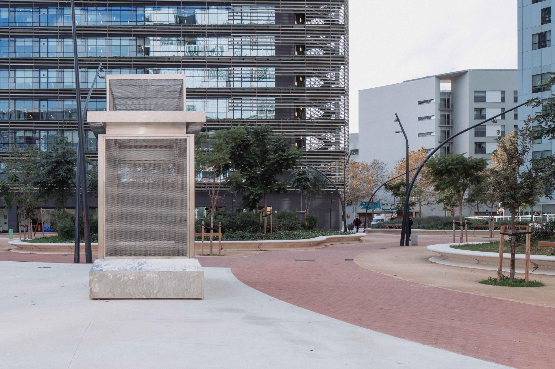 Despite being a non-hierarchical space, the park has a central area in which a sculpture created by the artist Susana Solano was placed. The aim of the monument "Hymn, myth and paradise" is to stablish a cultural dialogue with its surrounding landscape, made of big office buildings. Inspired by classical sculpture pedestals, without standing any particular symbolic object but the void, citizens are invited to participate and answer what this modern pedestal could stand: a piece of the landscape, the absence, or just the representation of the pedestal itself.