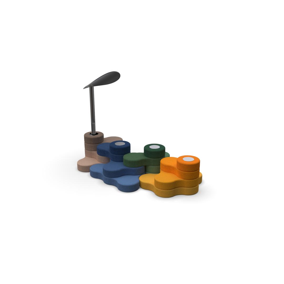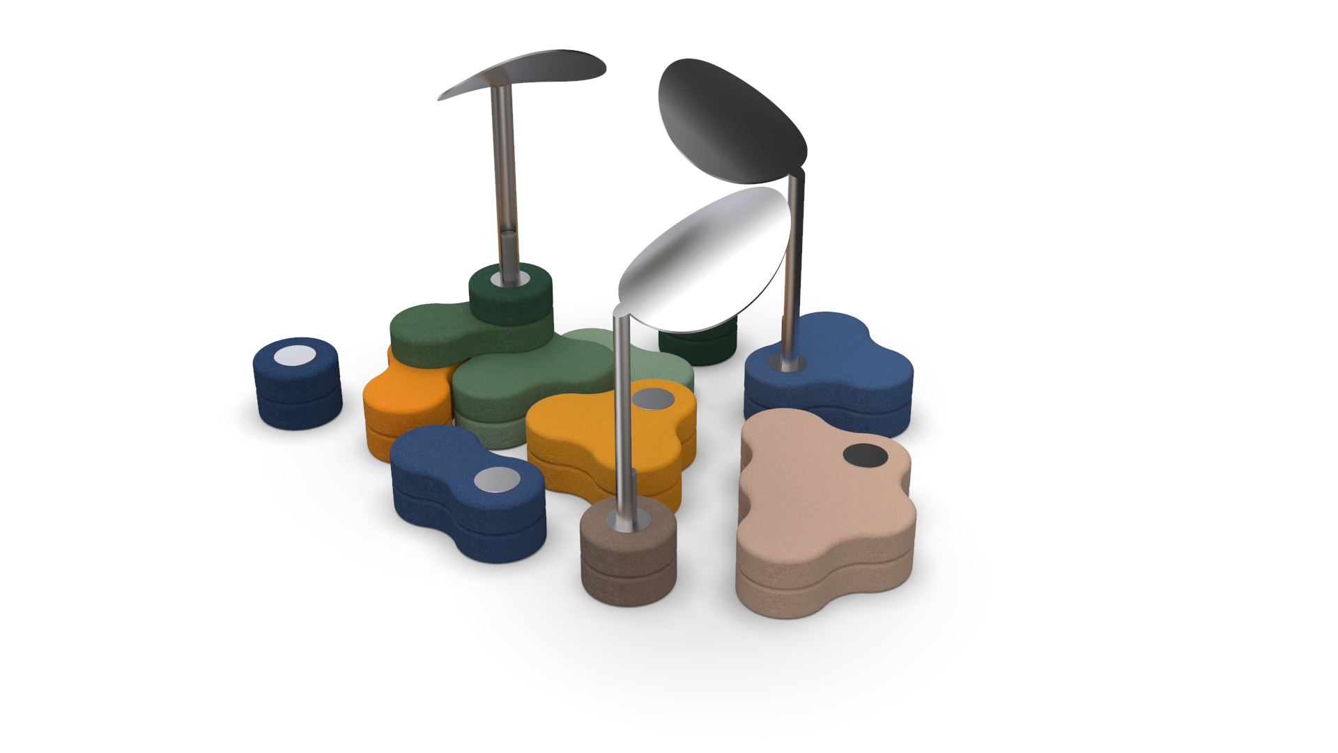 Then I concentrated on the formal concept. Knowing the possibilities to work the rubber powder, the shape I thought came as a consequence. Tiresansui is composed of four modules that arise from the circle, a symbol of circularity and representative of the Zen philosophy that underlies the construction of a Karesansui, a typical dry Zen garden. This design process led to a modular urban area in ELT rubber powder composed of modules that overlap and rotate around a pivot to find the perfect configuration, just like in the Zen discipline of stone balancing. This practice objective is creating perfectly balanced constructions through the stacking of cylindrical stones.