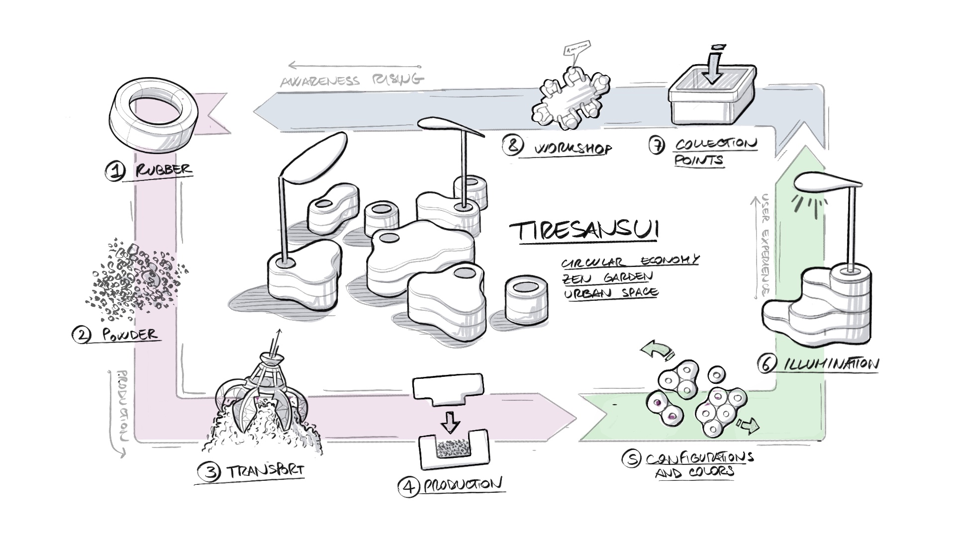 Here the tires undergo a first shattering that reduces them to pieces. Then, these endure the second crushing phase, which is meant to obtain granulates of different diameters. Currently, sports flooring and building insulations use this material. It is also used in smaller quantities to add asphalts or produce street furniture. Therefore, my project wants to expand one of these fields, trying to demonstrate how the ELT granulate is usable also in industrial design. Furthermore, Tiresansui would allow citizens to approach this type of little-known process, which nevertheless appears to be very important. In this way the ELT granules would become part of the common image of the city, raising awareness on the consumption of problematic waste such as tires.
