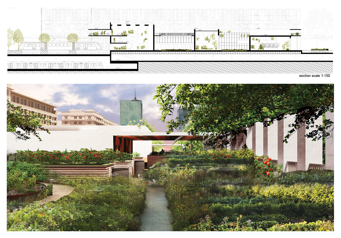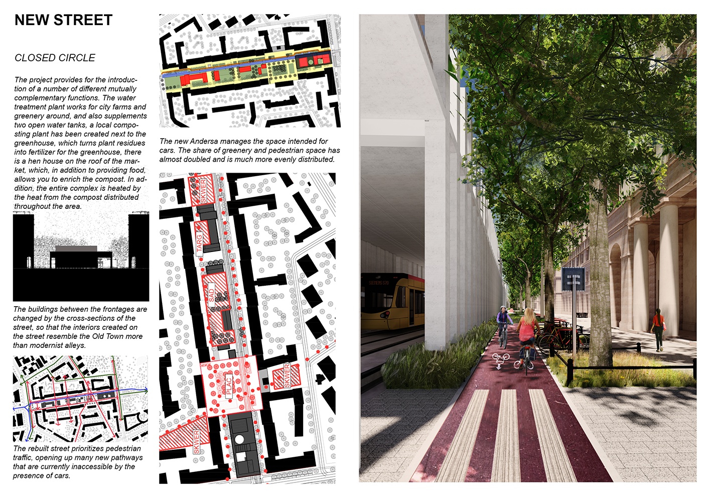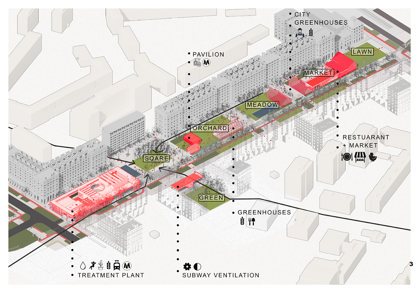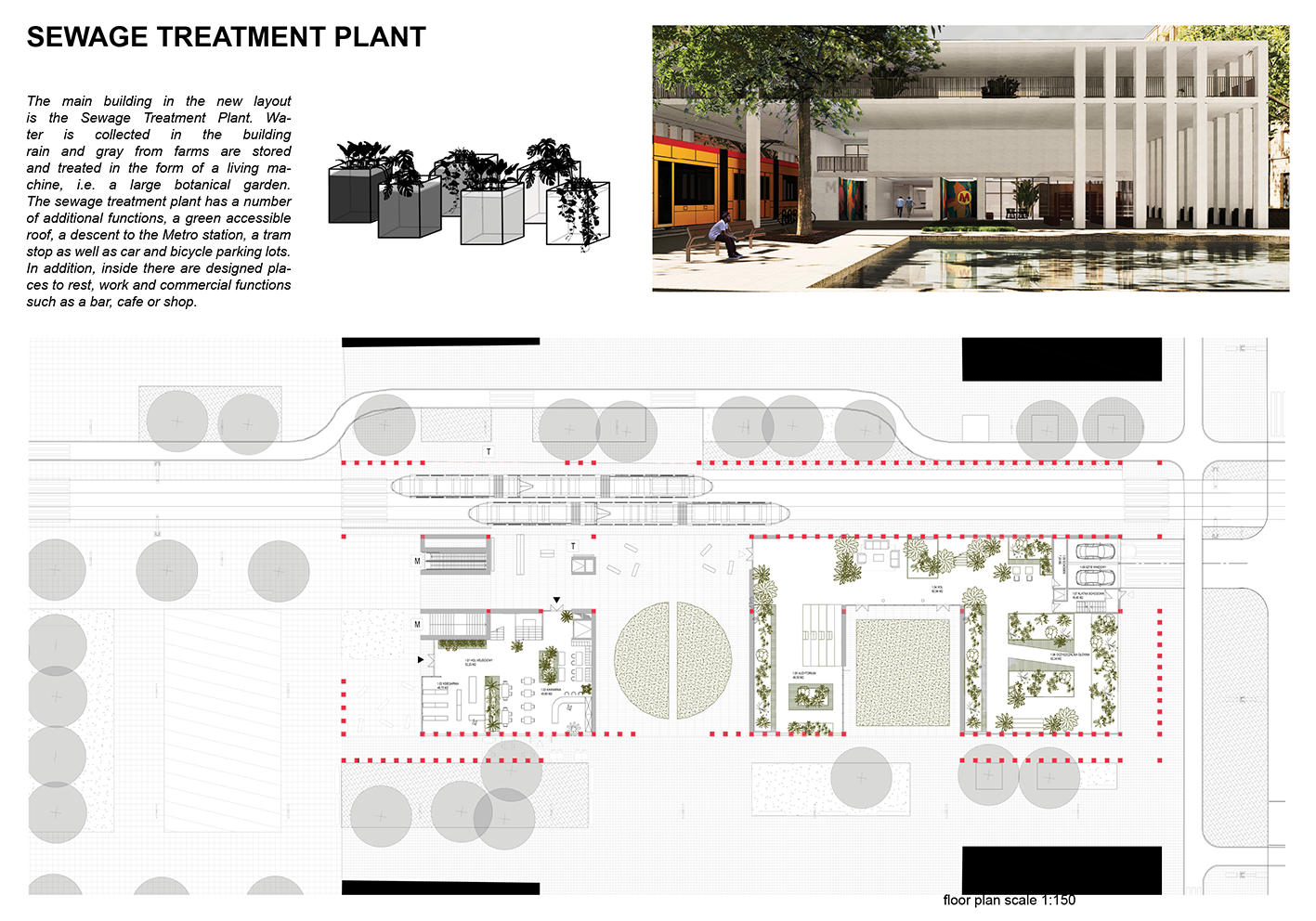 Revitalization of a socialist realist complex in the center of Warsaw. Turning a street dominated by cars into a lively space. A wide street gets filled with loosely placed buildings of city greenhouses, a market and a water treatment plant, interspersed with pedestrian areas. The heart of the project is the "living machine", which is the most impressive method of water purification. The street is a model example of thinking about a one-minute city, where public spaces are available immediately.