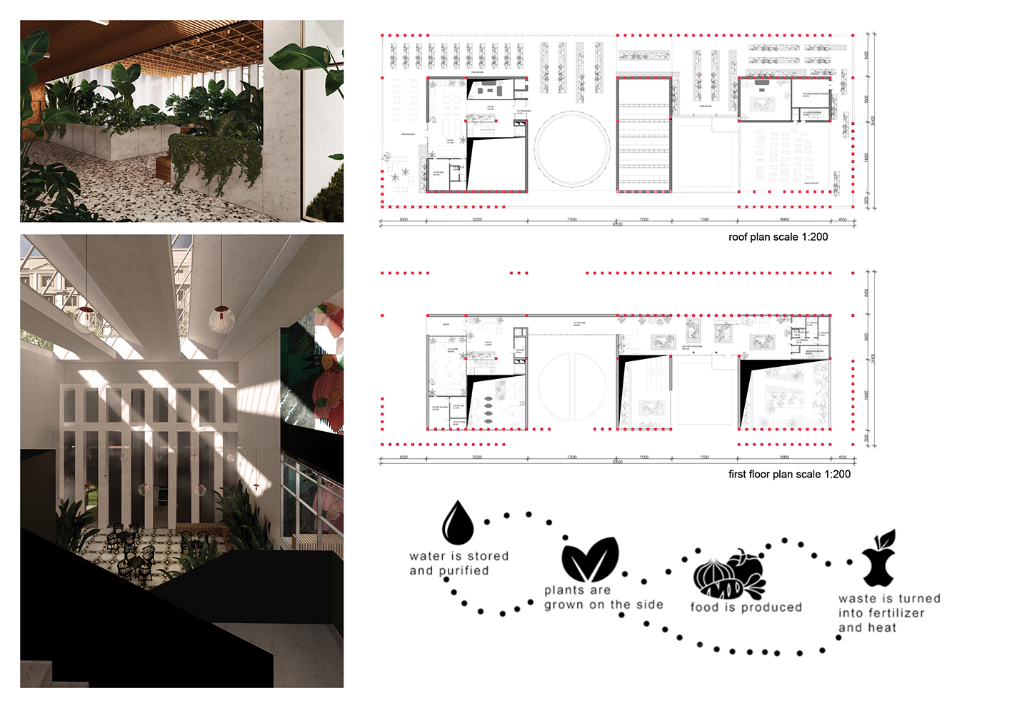 Optimization in one aspect has a positive effect on others. A city farm that reduces costs and maximizes profits makes the venture more profitable. At the same time, if we use, for example, biodegradable waste or gray water during the project, we will not only have a positive impact on the development of the farm, but also reduce the costs of waste disposal elsewhere. The presence of greenery directly affects the aesthetics of the project, providing a large amount of light to the interior allows you to play with light and design unique solutions in this area. The water present in the area not only serves farms and savings, but also allows for interesting framing of buildings and increasing their representativeness. After all, the beautiful, even temple-like aesthetics of buildings attracts tourists and residents, increasing the market for the produced plants, but also increases the ecological awareness of visitors. The project shows that urban farms do not have to be technological and back-up, and aesthetic and representative solutions do not have to be expensive and unprofitable. If we combine many functions at once, for the benefit of all, we can create sustainable environments that resist the beauty and grace of existing cities.