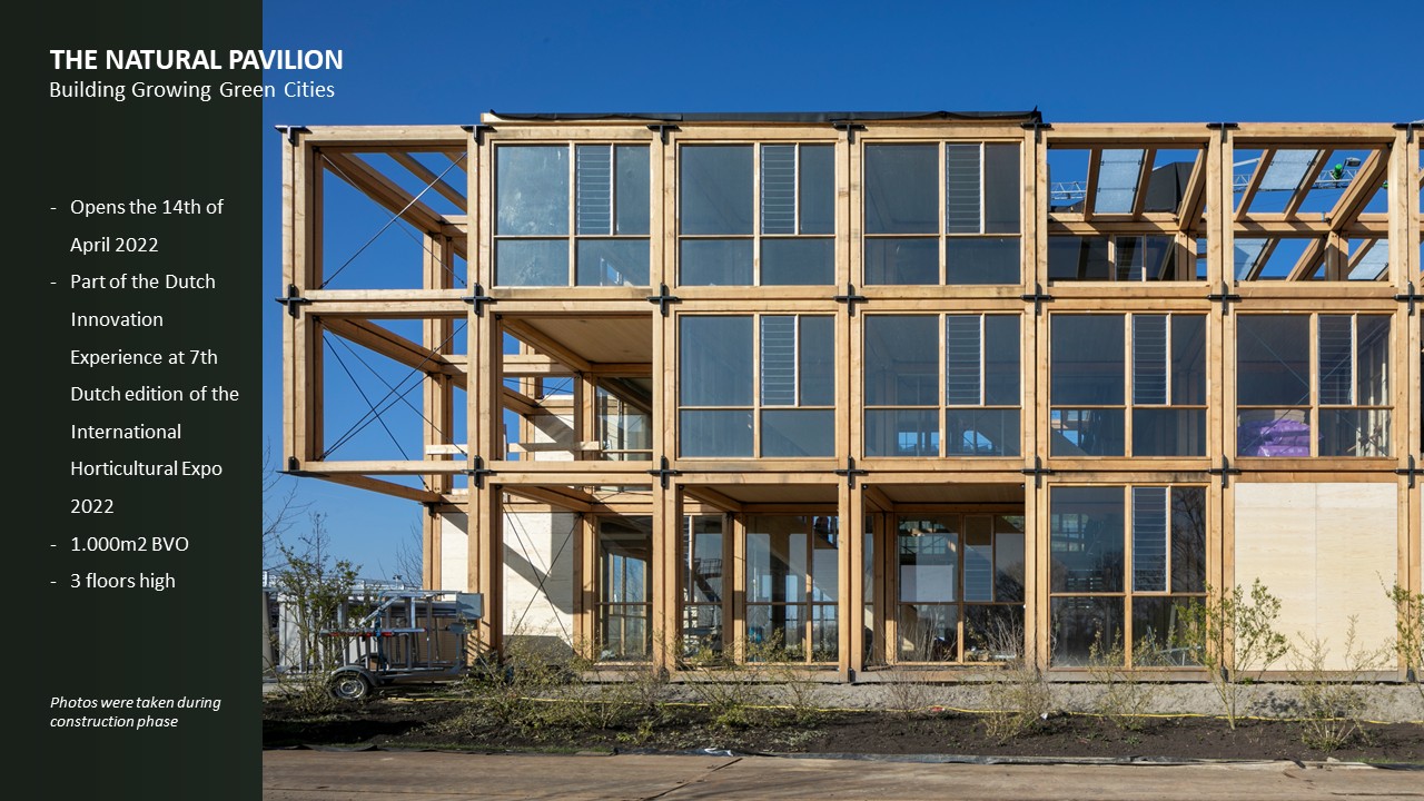 The Natural Pavilion shows the world that biobased, circular and nature-inclusive construction can be done in an industrial way. The results and lessons learned will be experienced first by the more than 2 million visitors from all over the world who will visit the Floriade Expo in the coming months. The seventh Dutch edition of the International Horticultural Expo also offers a worldwide stage to national and international thinkers, innovators and smart people who see green solutions that make our cities more fun, liveable and sustainable. It is also an attractive platform for trade delegations, colleagues and business clubs. The Natural Pavilion can benefit from this and the broad platform for marketing and exposure of the Floriade Expo 2022.