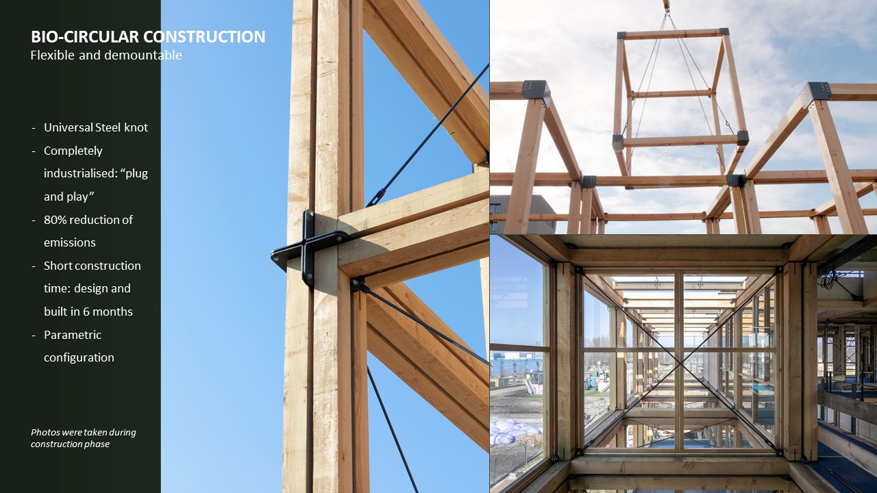 - WoodCore Construction: a modular construction system consisting of constructive CLT wood and steel knots. A solution to realise biobased high-rise buildings up to 80m high in inner-city areas.