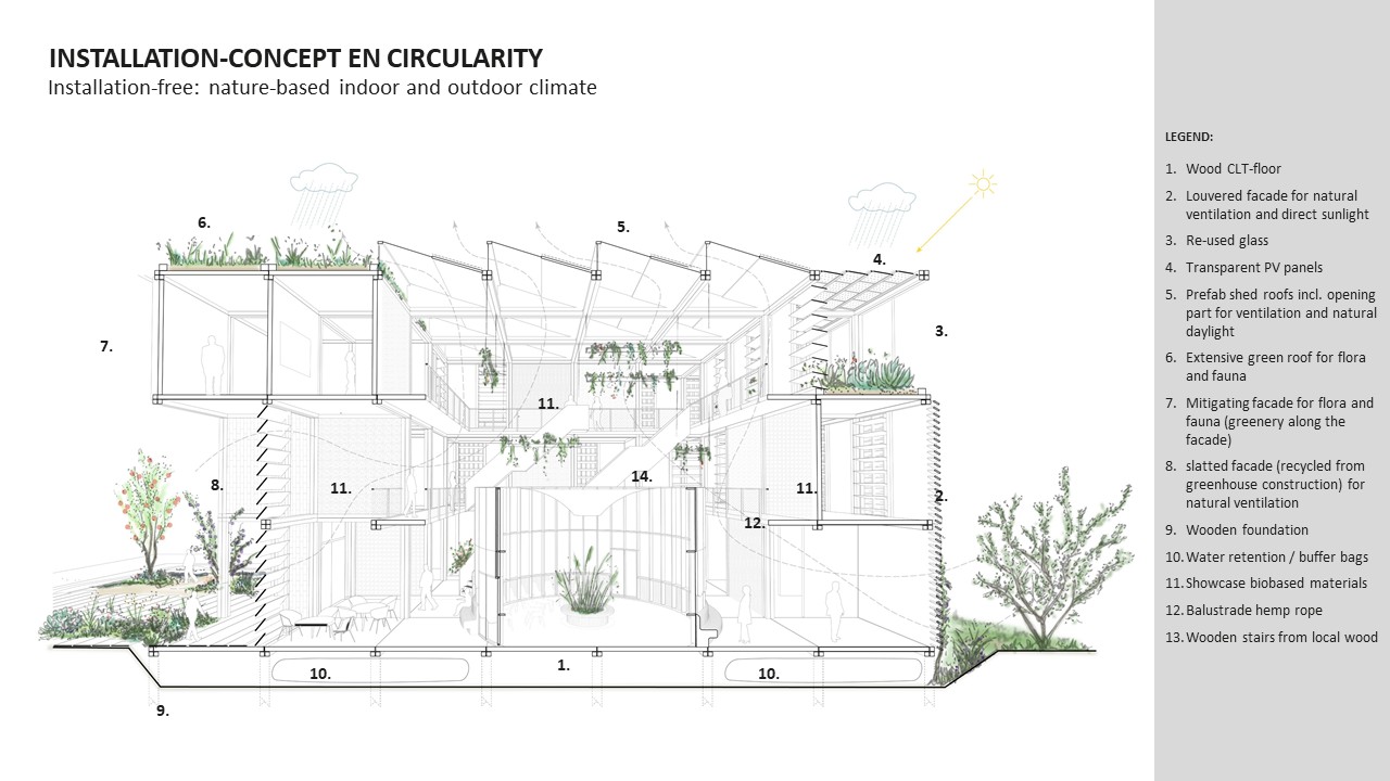 - Climate Concept: sustainable innovation in installation technology. Keywords are: low-tech, energy neutral, solar panels, wind turbines, digitally controlled louvred windows that provide natural ventilation, pluggable, re-use and biobased.